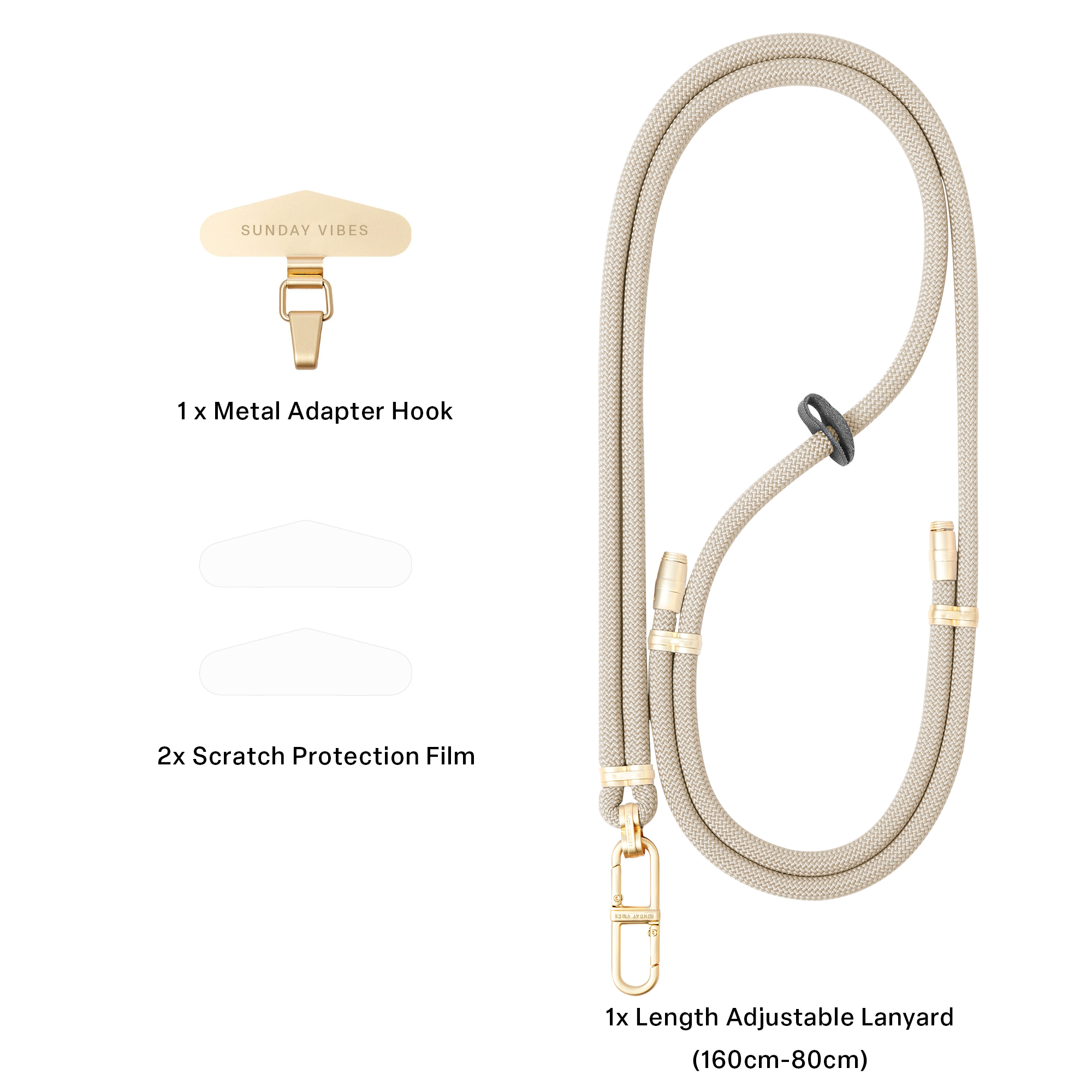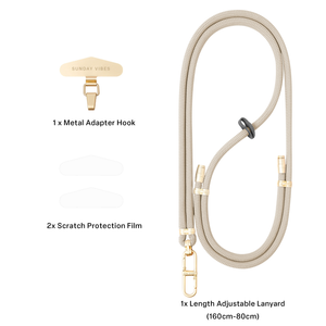 A versatile crossbody lanyard designed for everyday freedom. Adjust the strap length from 80cm to 160cm to match your look and comfort. Built with sturdy metal buckles and an 8mm nylon strap that can hold up to 80kg. The vegan leather smart hook lets you clip on keys, AirPods, or any accessories with ease. Move lightly, live stylishly, hands free.