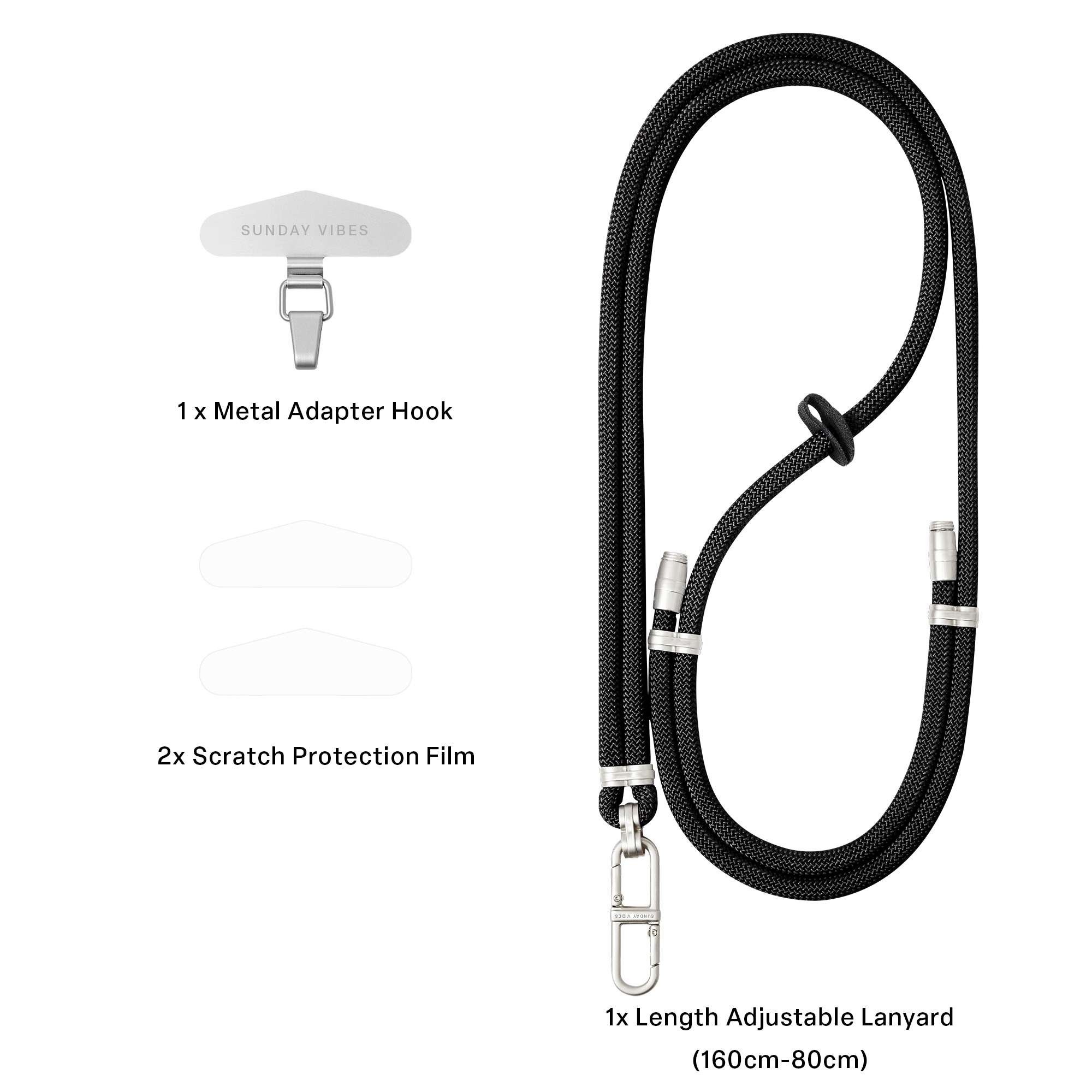 A versatile crossbody lanyard designed for everyday freedom. Adjust the strap length from 80cm to 160cm to match your look and comfort. Built with sturdy metal buckles and an 8mm nylon strap that can hold up to 80kg. The vegan leather smart hook lets you clip on keys, AirPods, or any accessories with ease. Move lightly, live stylishly, hands free.