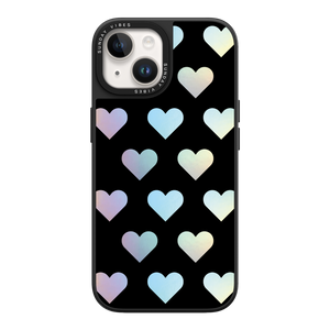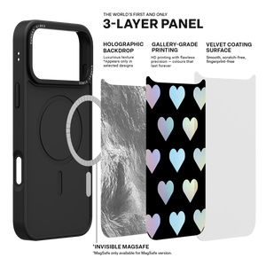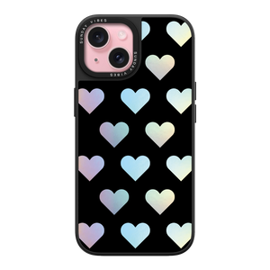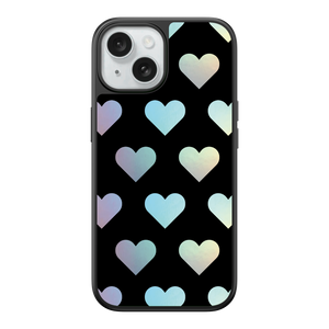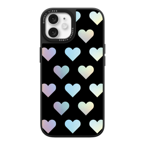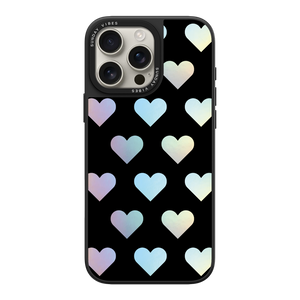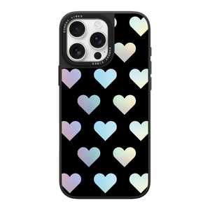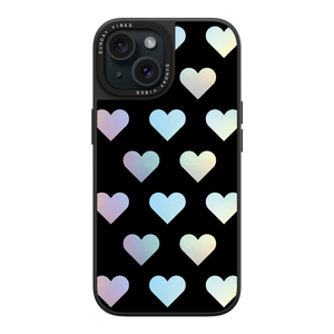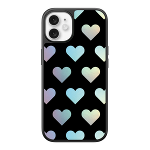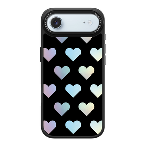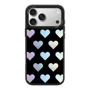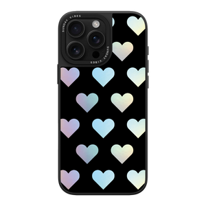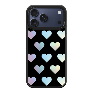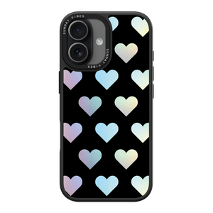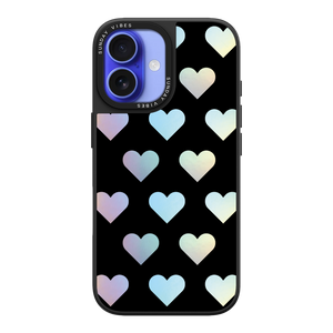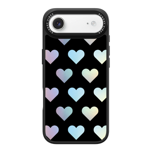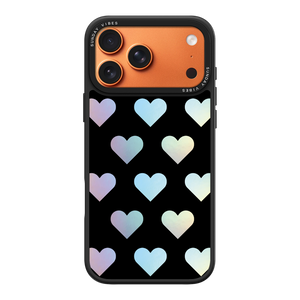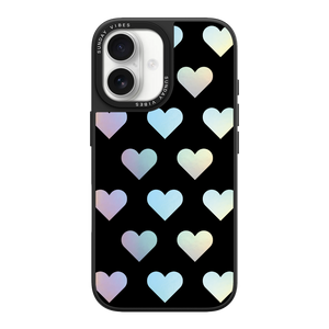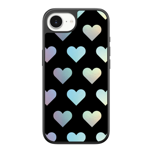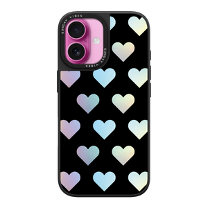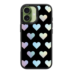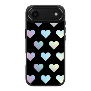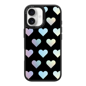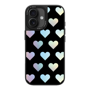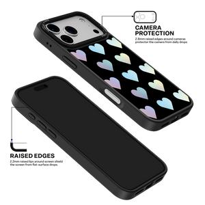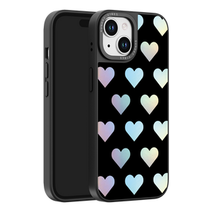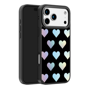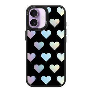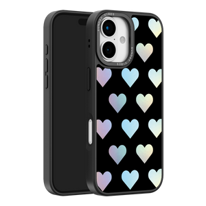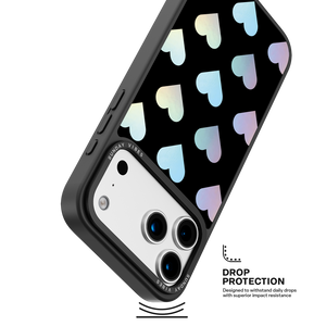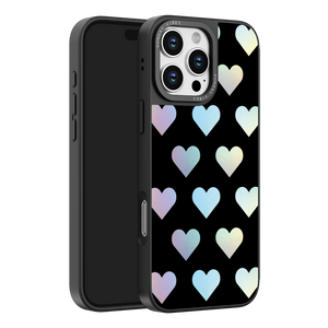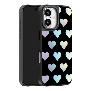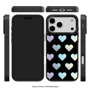 Discover the quiet elegance of the Angel Aura iPhone Case. This design features iridescent pastel hearts that deliver a dynamic holographic shimmer, which pops beautifully against the sleek black canvas. This unique light-shifting effect ensures your device becomes a refined, yet truly eye-catching accessory, capturing that stylish, warm aesthetic.