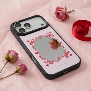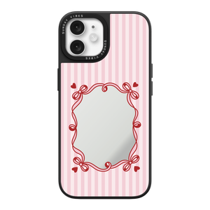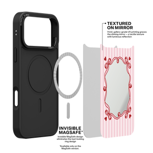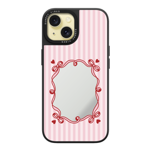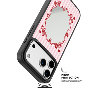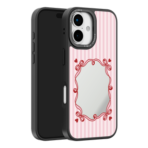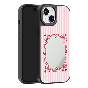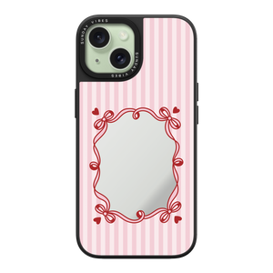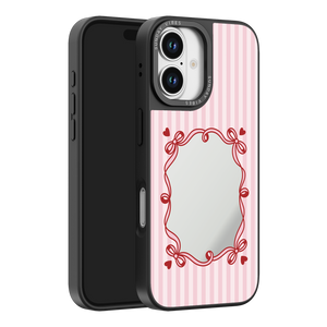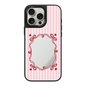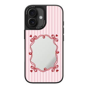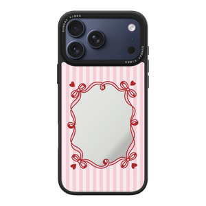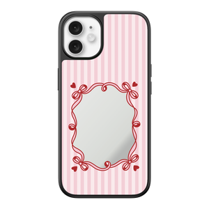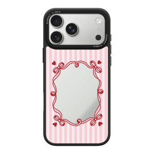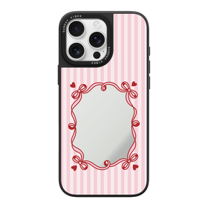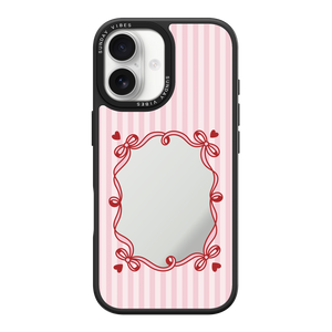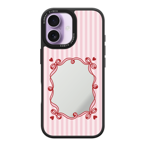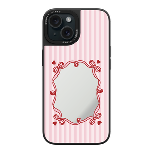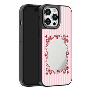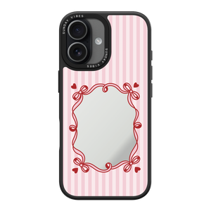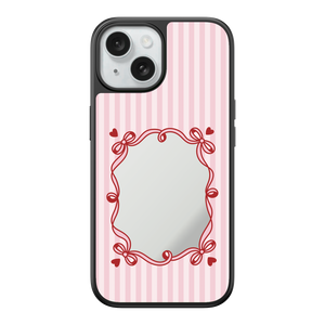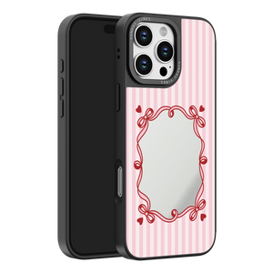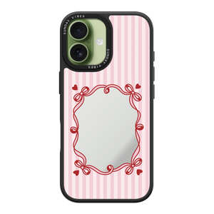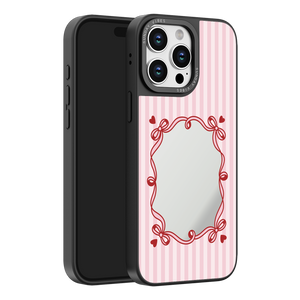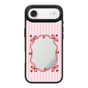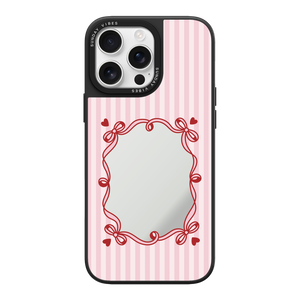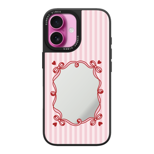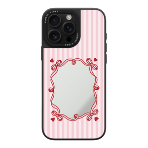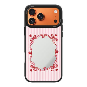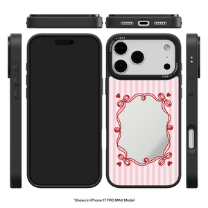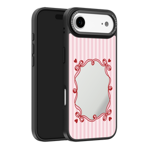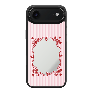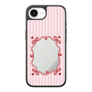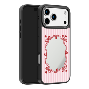Elevate your look with the fun, retro glamour of the Candy Stripe Glance iPhone Case. The charming pink striped canvas frames a central mirror, bordered by a beautifully drawn red ribbon and heart motif. This design perfectly merges a playful, romantic aesthetic with essential mirror convenience, making a dazzling, instantly cheerful statement.