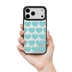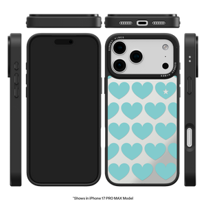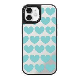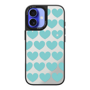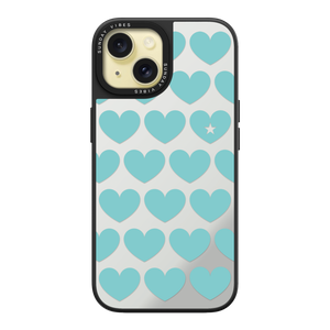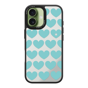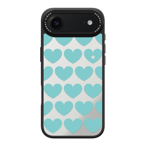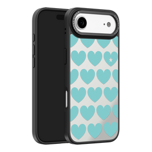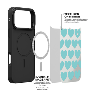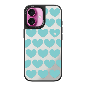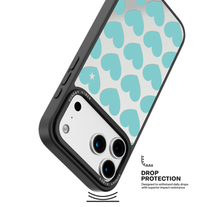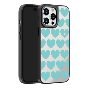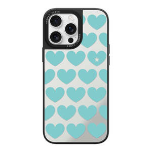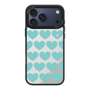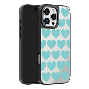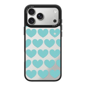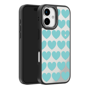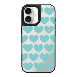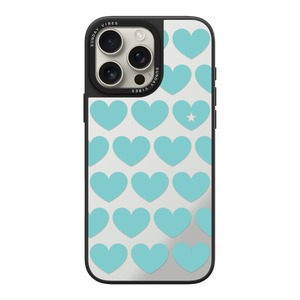 Elevate your look with the energetic, bold style of the Cool Crush Code iPhone Case. The repeated cyan heart motif pops dramatically against the high-shine reflective silver backdrop, creating a dazzling, instantly sophisticated accessory. This design perfectly merges a cool, graphic aesthetic with essential mirror convenience.