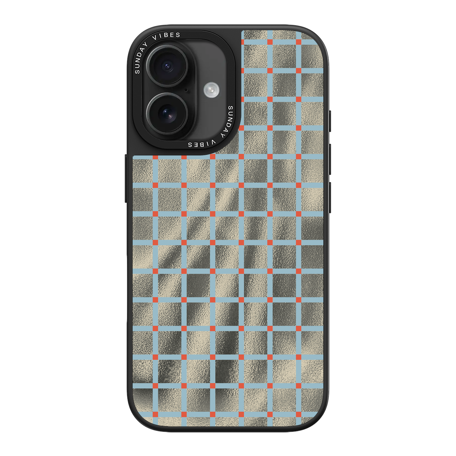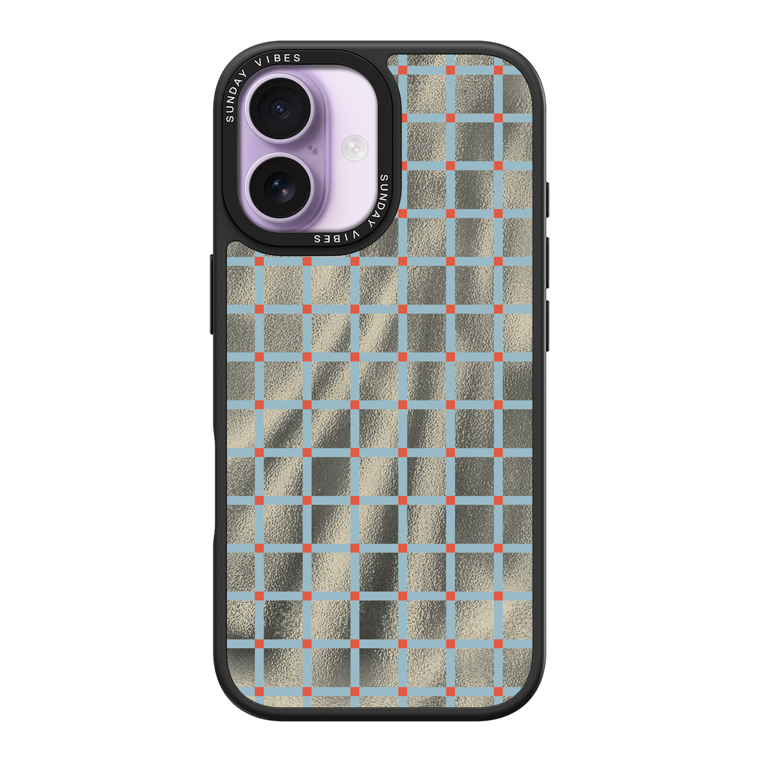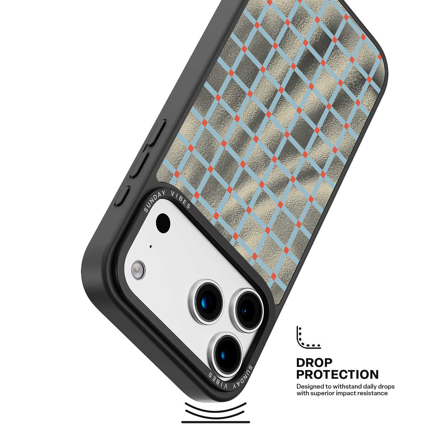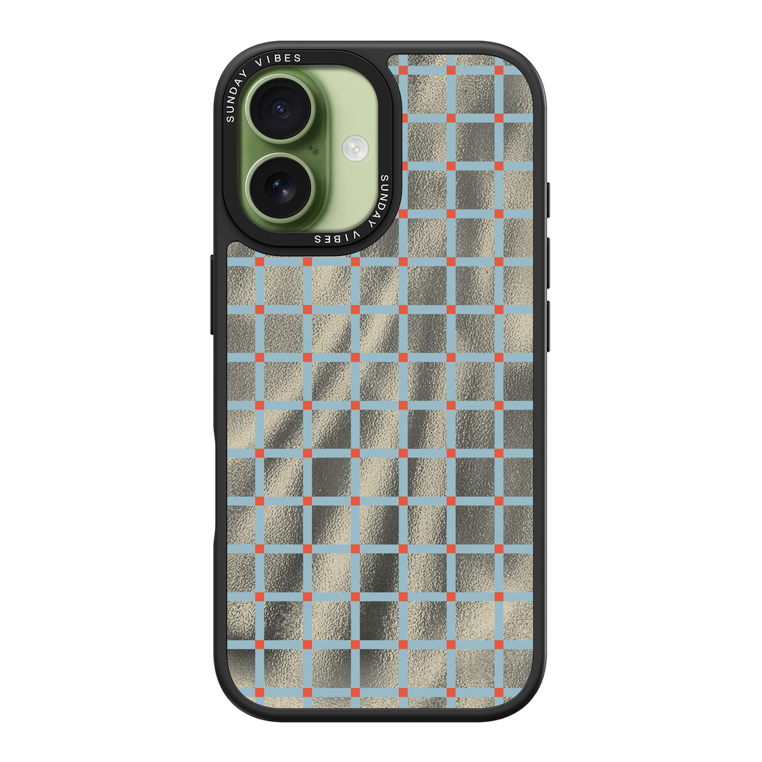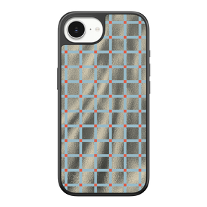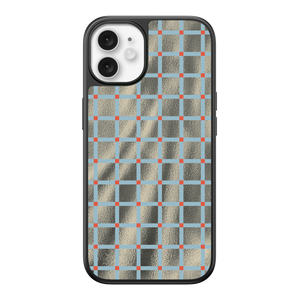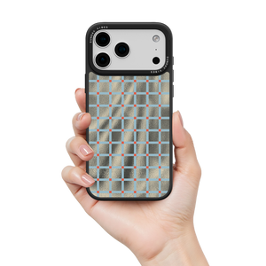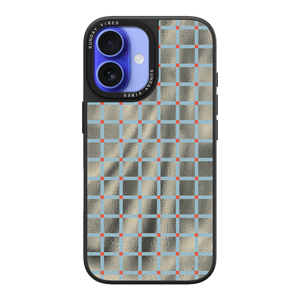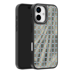 Make a sharp statement with the Cyber Net iPhone Case. This geometric pattern features a striking windowpane grid over a dramatically textured, light-shifting holographic background. The cool blue and orange accents add a modern edge to the metallic gold finish, ensuring a unique, stylish aesthetic.