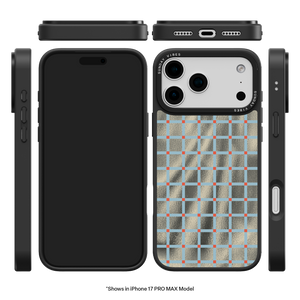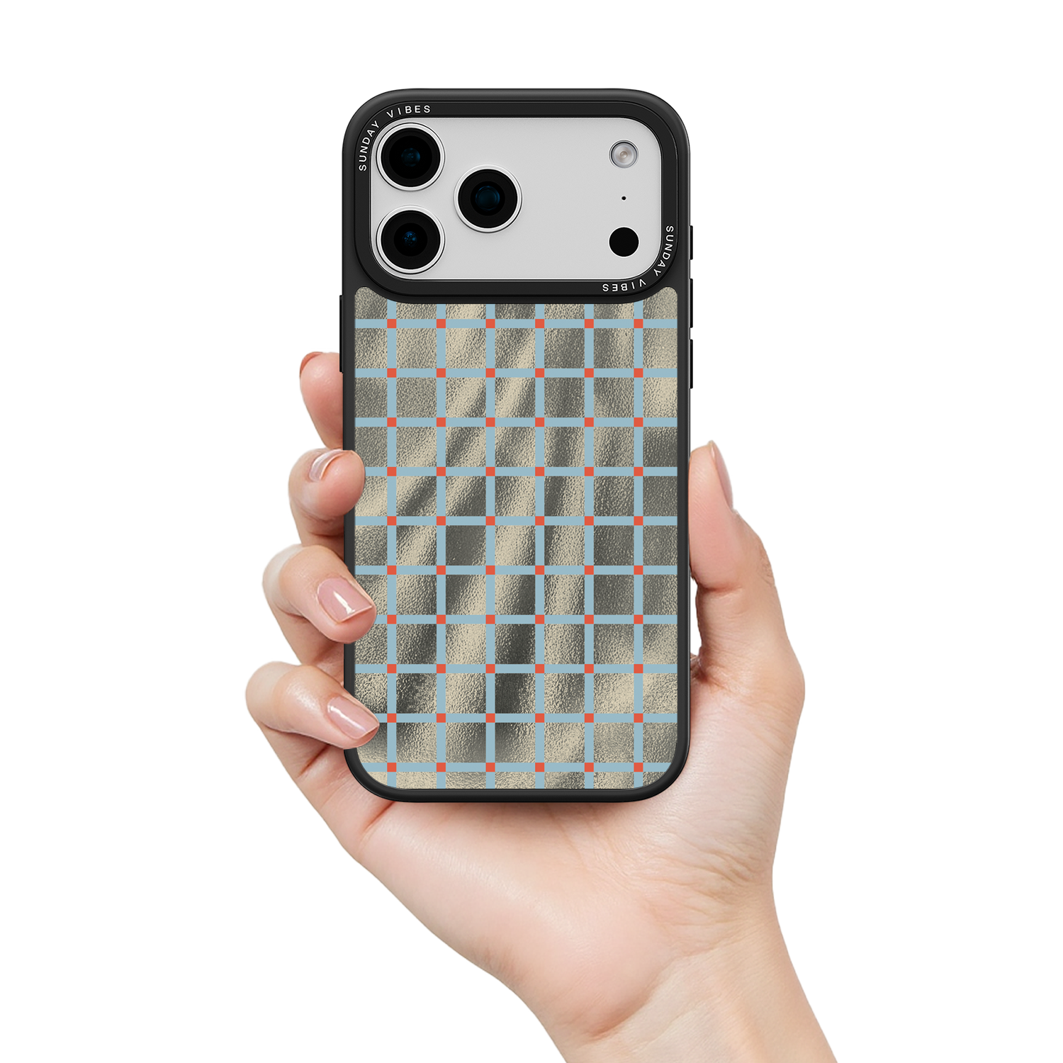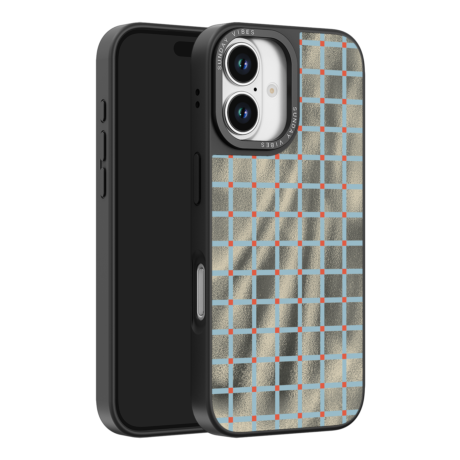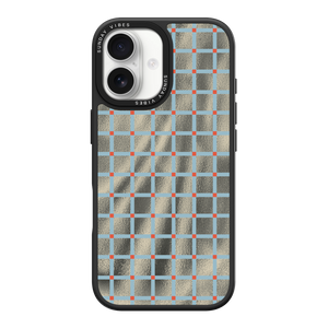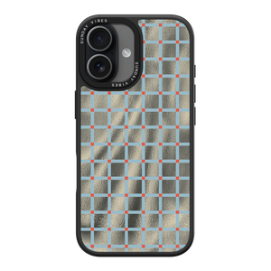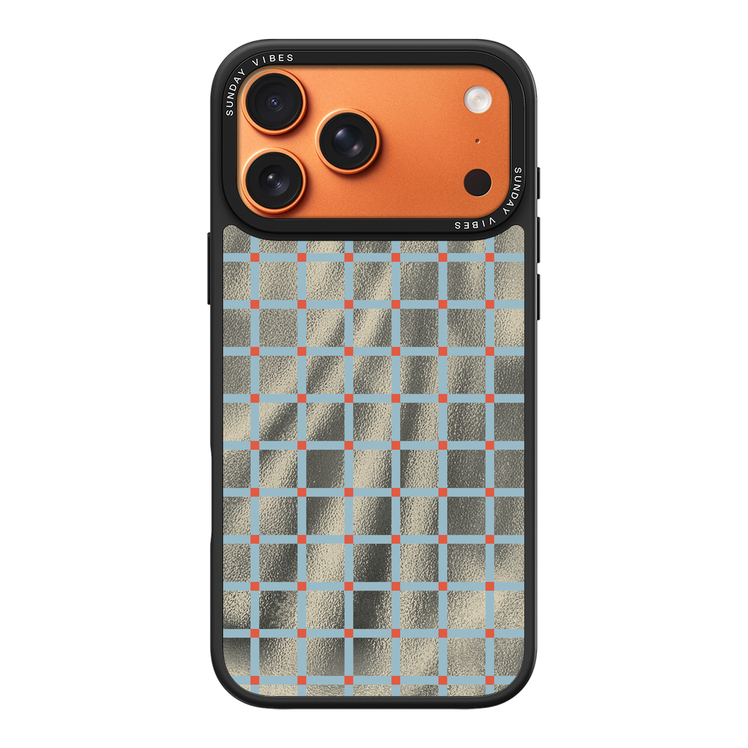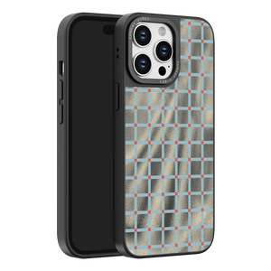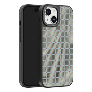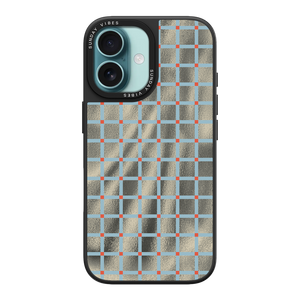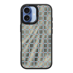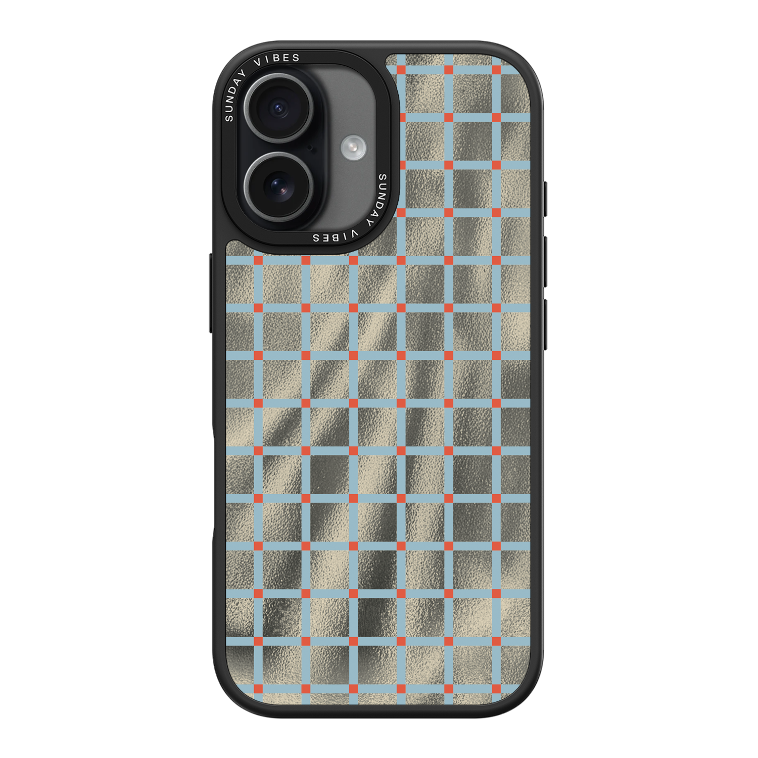 Make a sharp statement with the Cyber Net iPhone Case. This geometric pattern features a striking windowpane grid over a dramatically textured, light-shifting holographic background. The cool blue and orange accents add a modern edge to the metallic gold finish, ensuring a unique, stylish aesthetic.