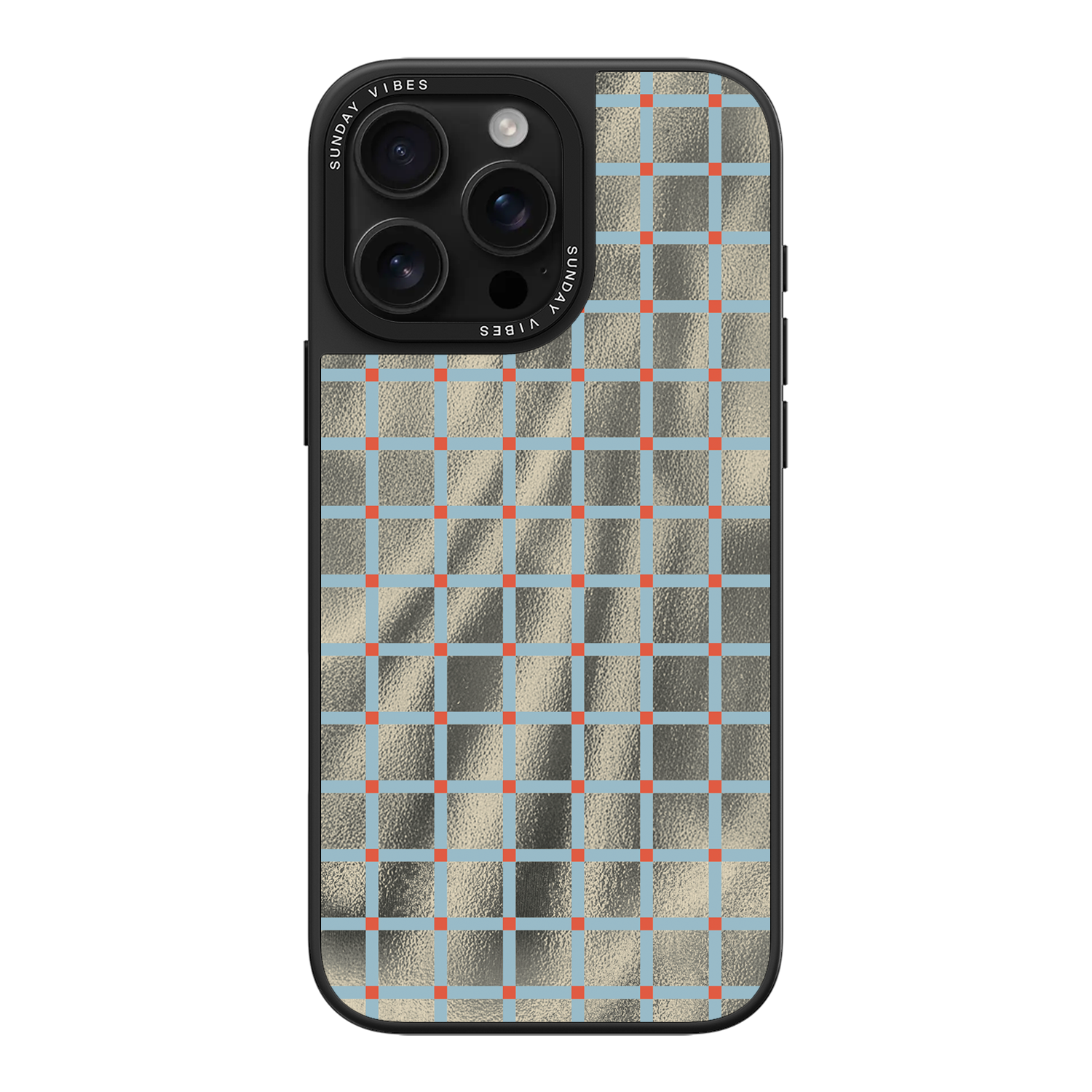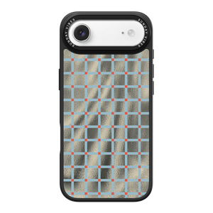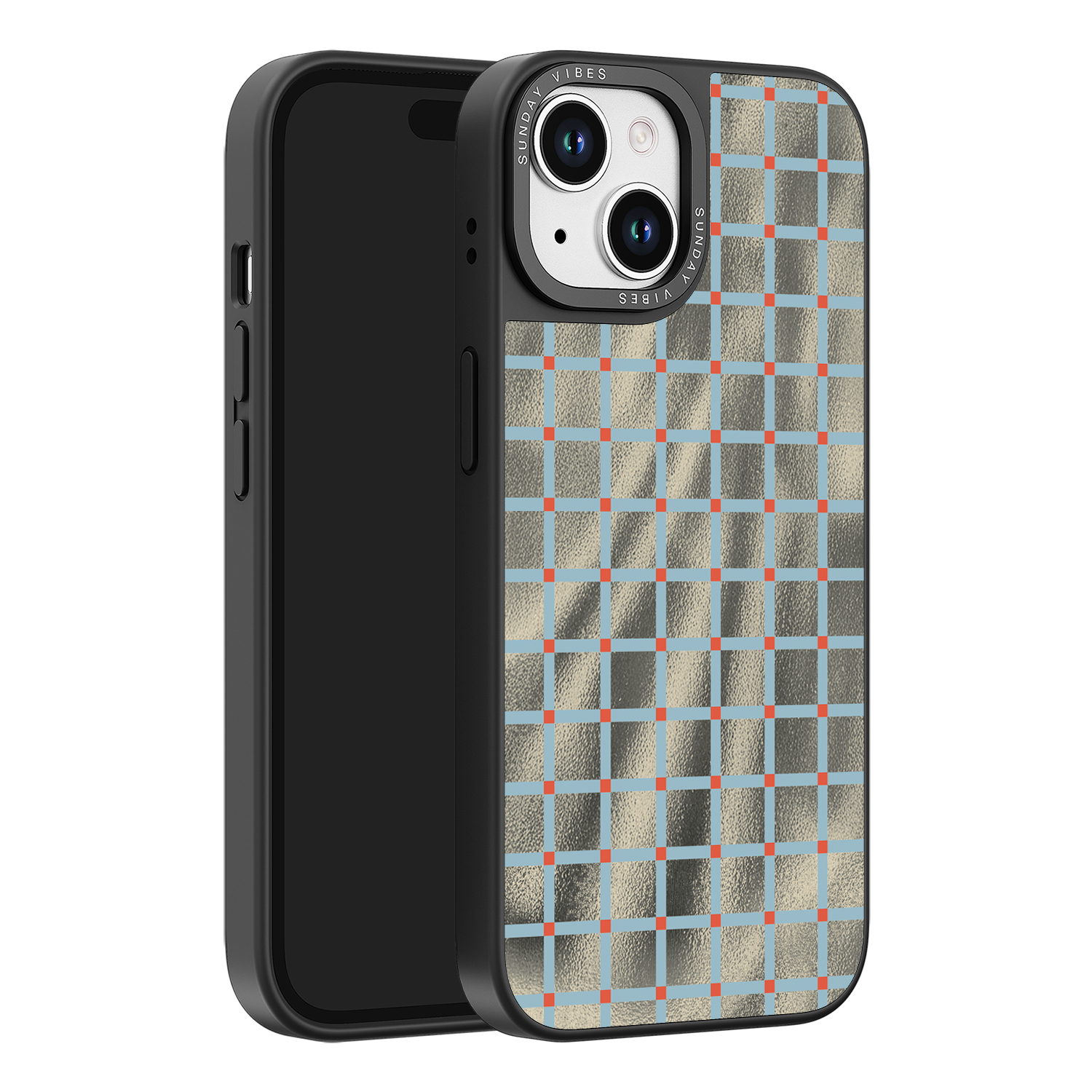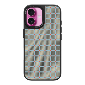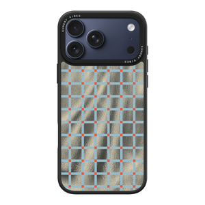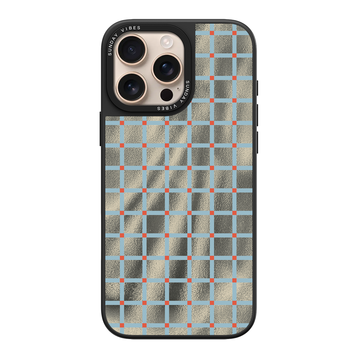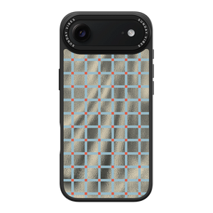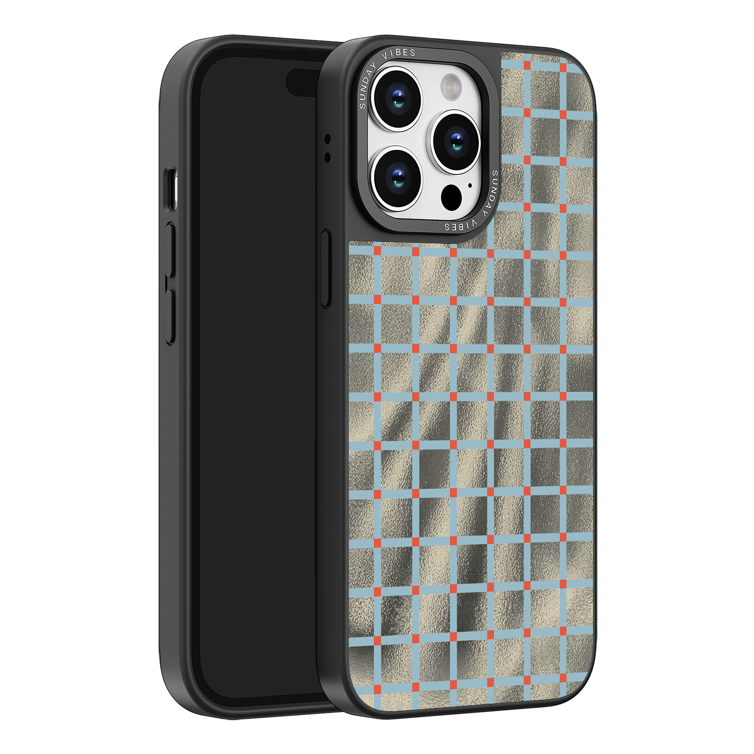 Make a sharp statement with the Cyber Net iPhone Case. This geometric pattern features a striking windowpane grid over a dramatically textured, light-shifting holographic background. The cool blue and orange accents add a modern edge to the metallic gold finish, ensuring a unique, stylish aesthetic.