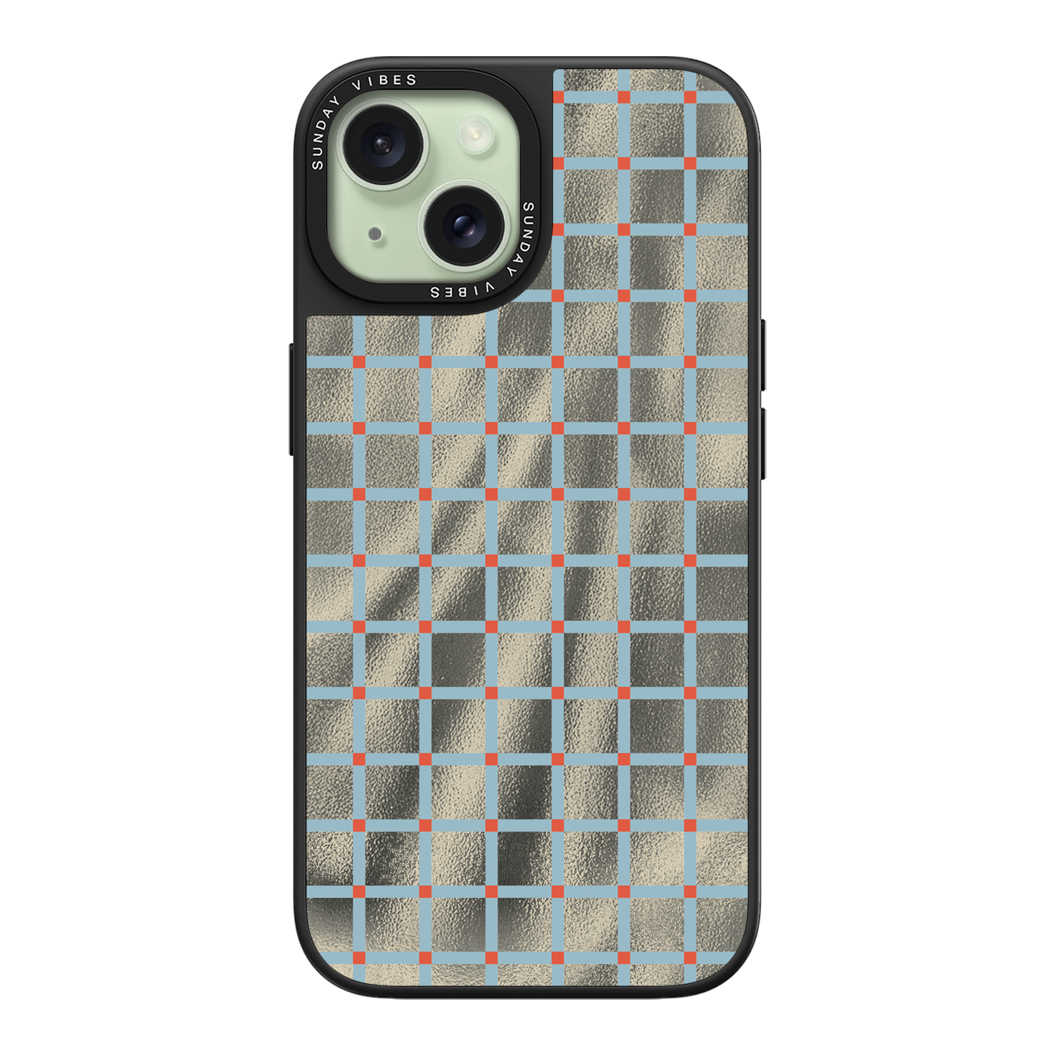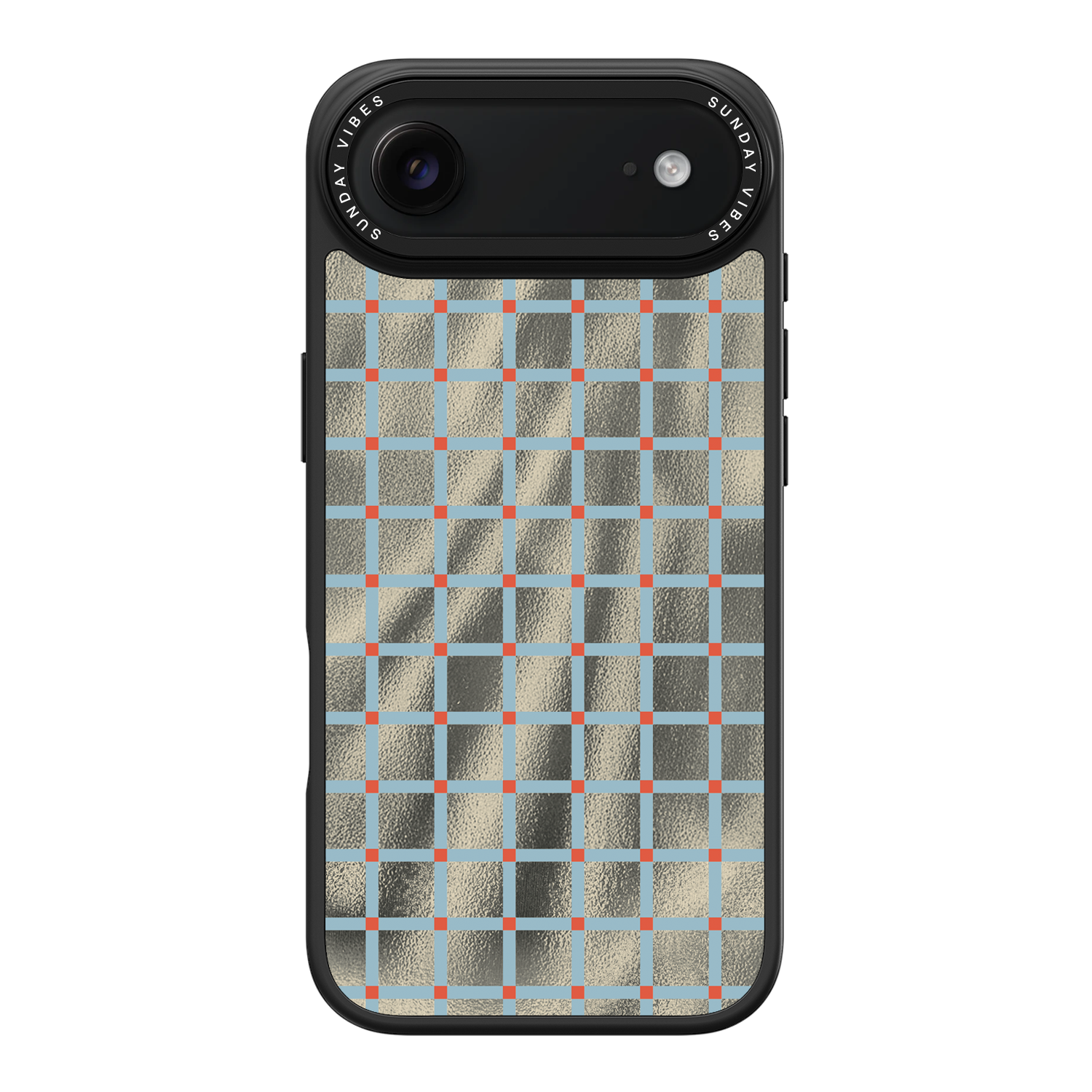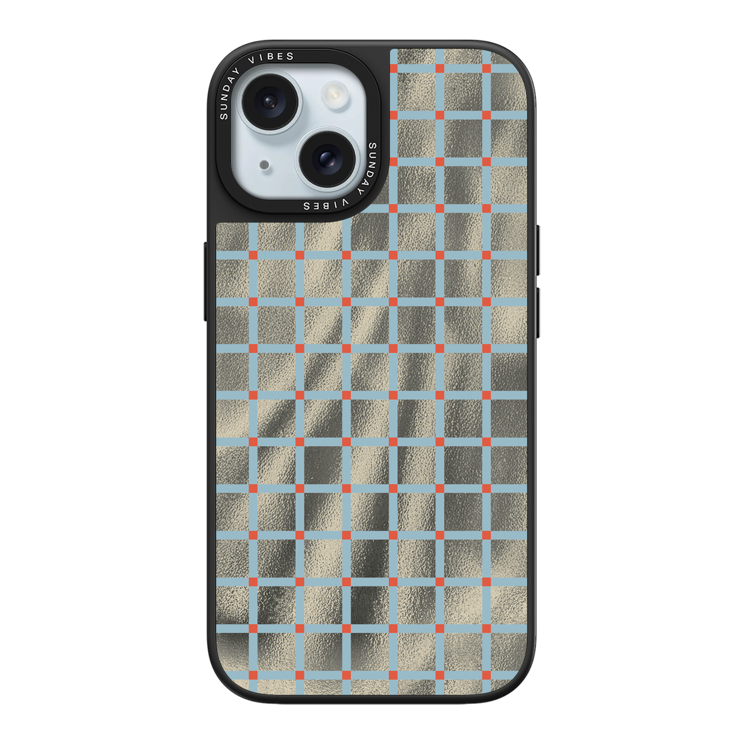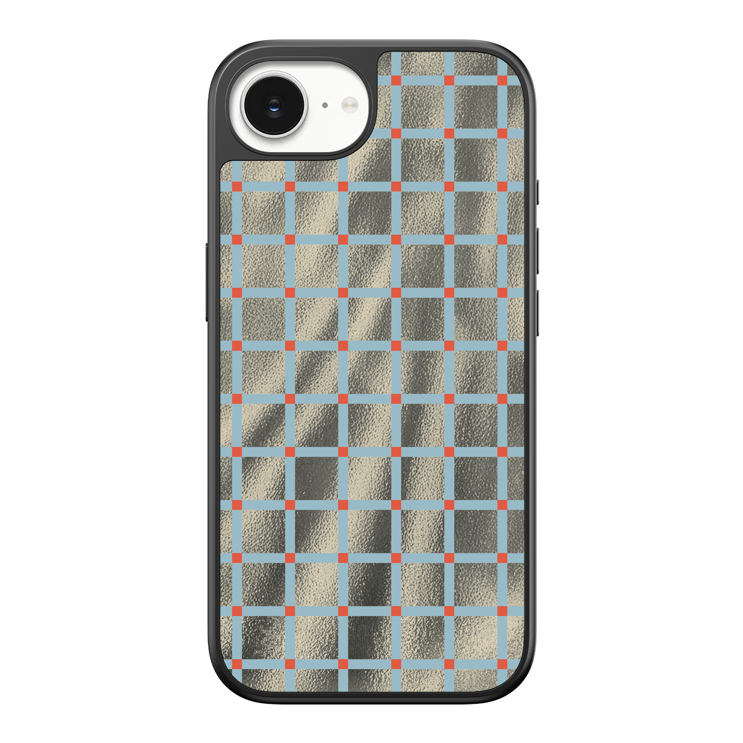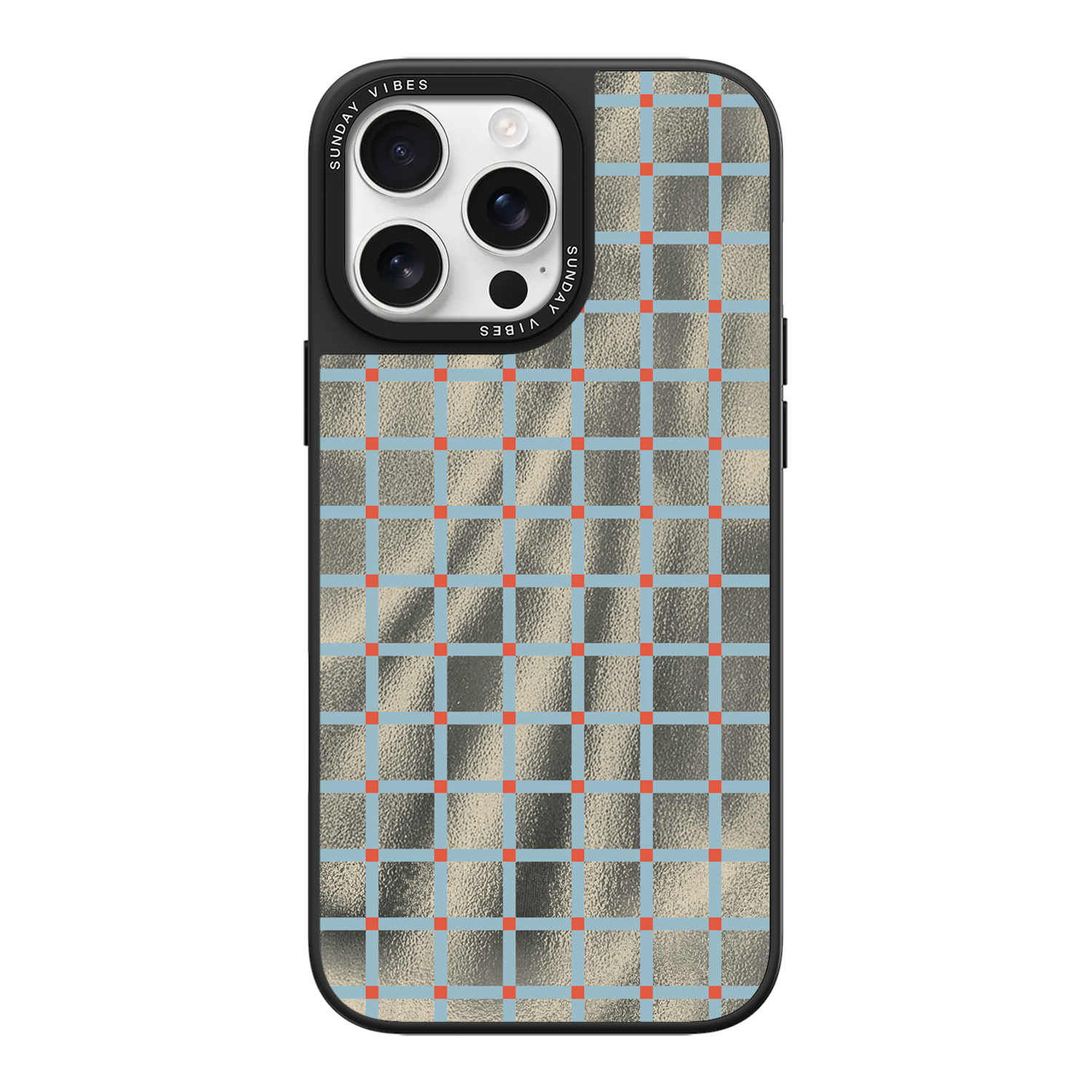 Make a sharp statement with the Cyber Net iPhone Case. This geometric pattern features a striking windowpane grid over a dramatically textured, light-shifting holographic background. The cool blue and orange accents add a modern edge to the metallic gold finish, ensuring a unique, stylish aesthetic.