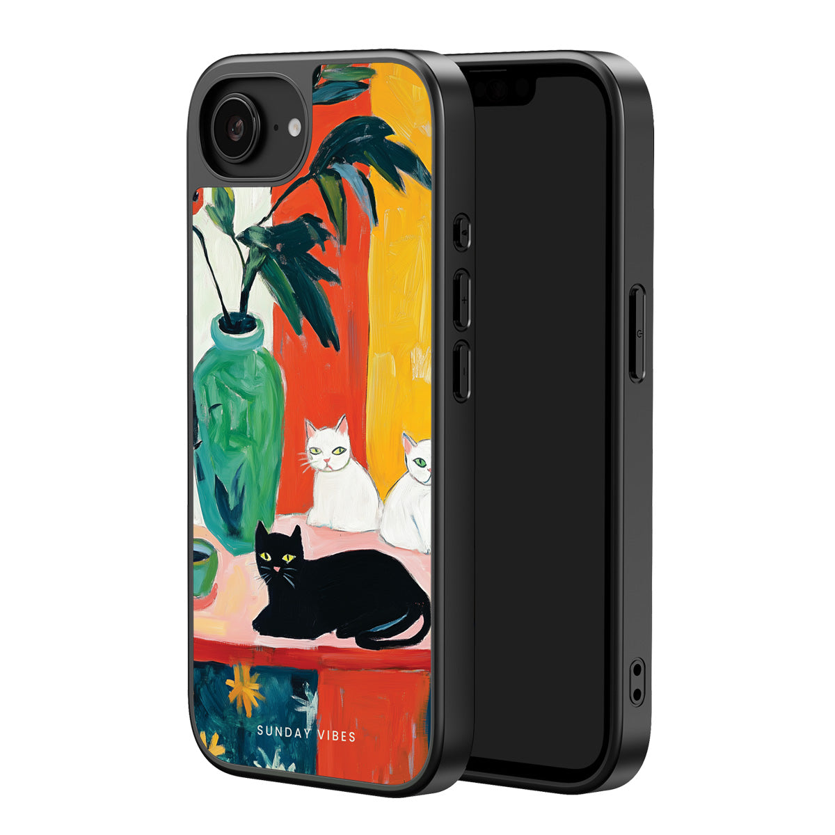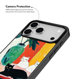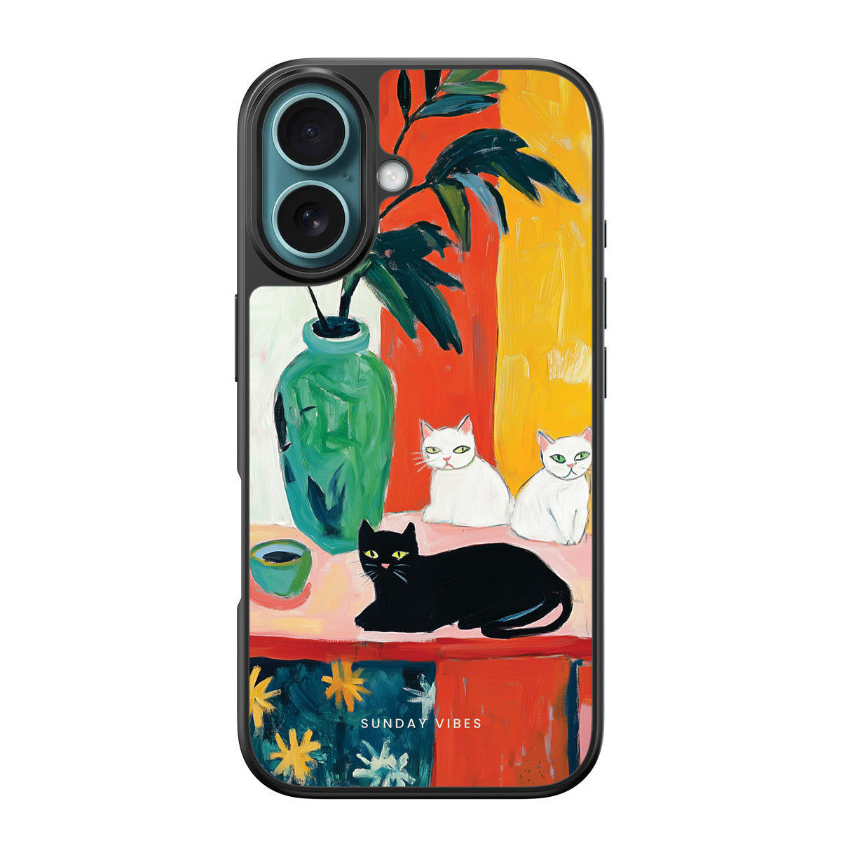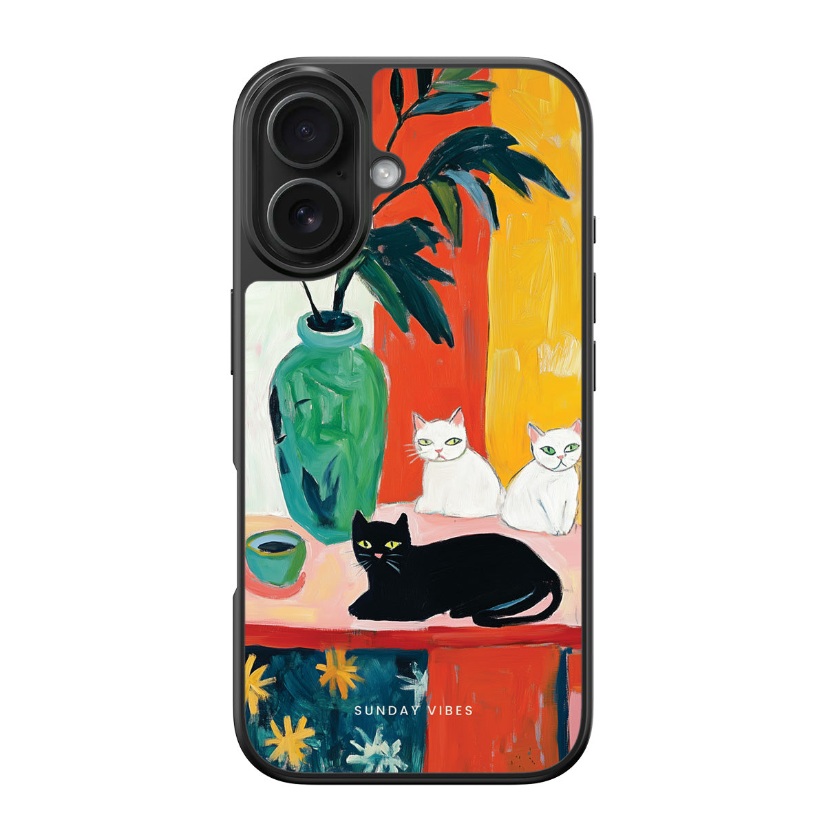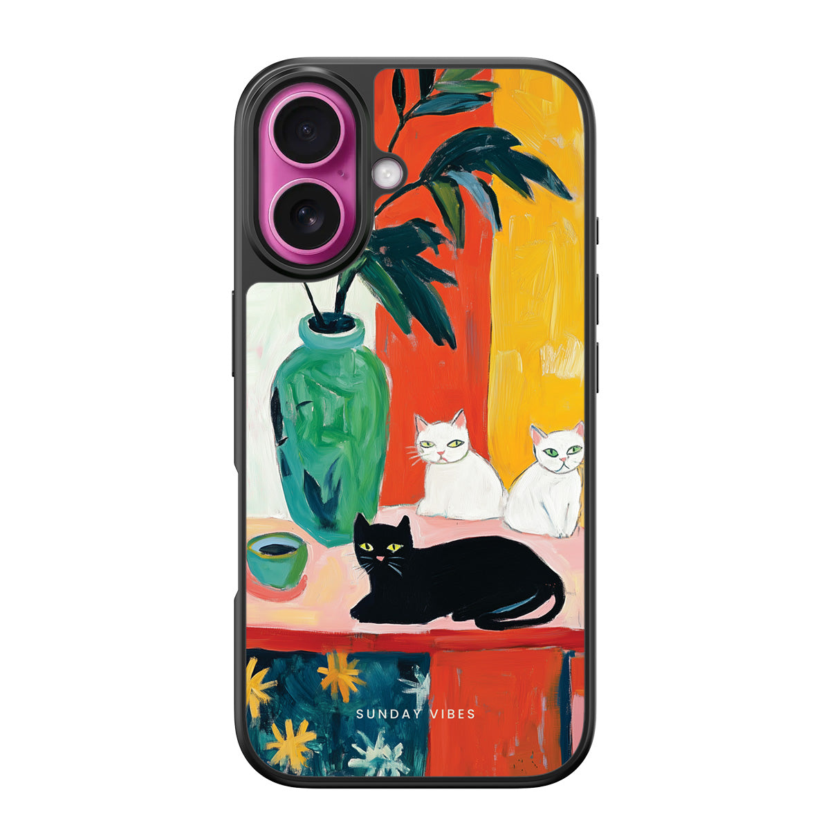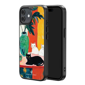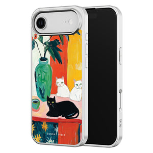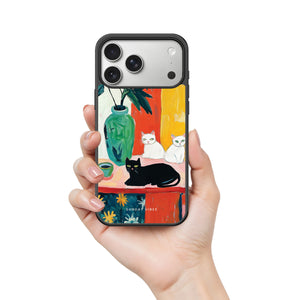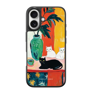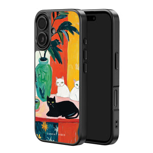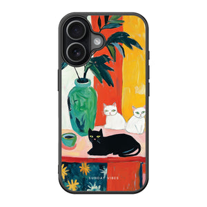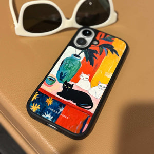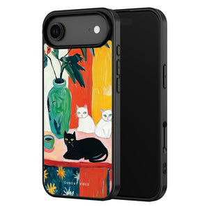 Indulge in a blend of art and feline charm with the Feline Artistry iPhone Case. Its surface is adorned with a vibrant, painterly scene featuring three cats - a sleek black one and two pristine white ones - set against a backdrop of bold colors and a lush green vase. The expressive brushstrokes and vivid palette create a lively, artistic atmosphere. Crafted with shock - absorbent edges, it offers reliable protection against daily impacts. The case's slim profile ensures easy portability, making it a perfect accessory for cat enthusiasts and lovers of artistic designs.