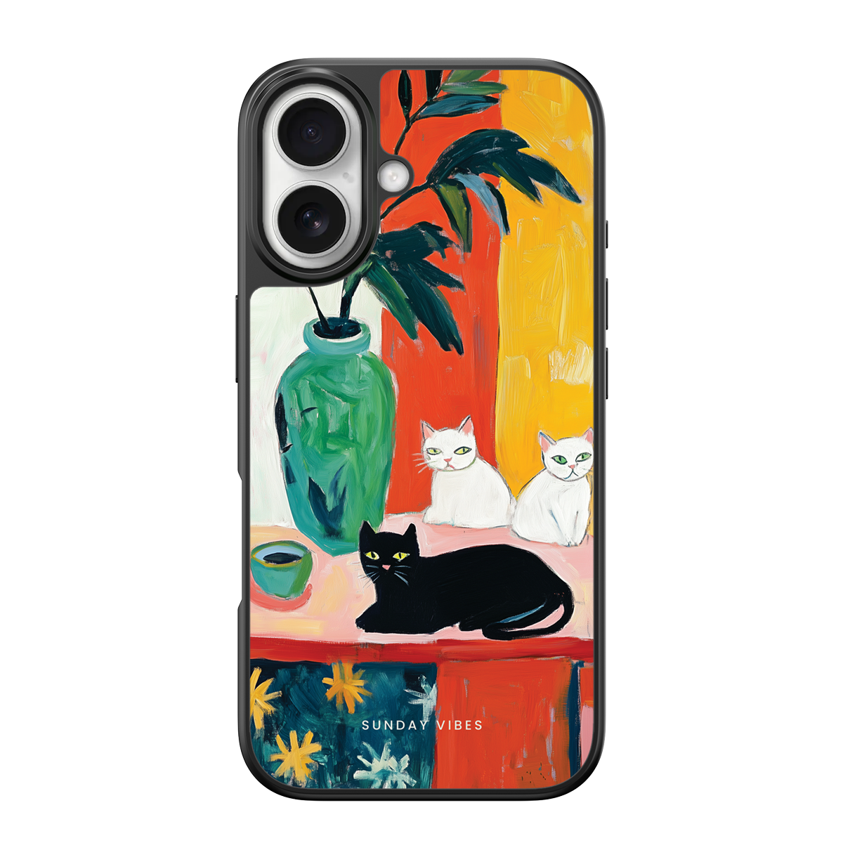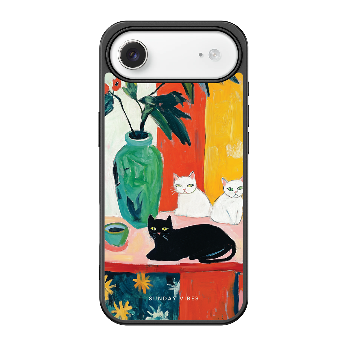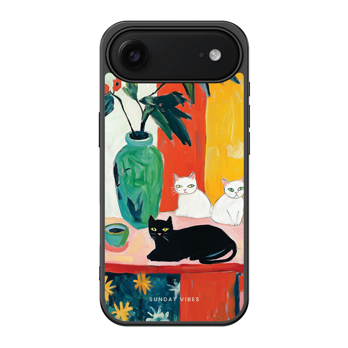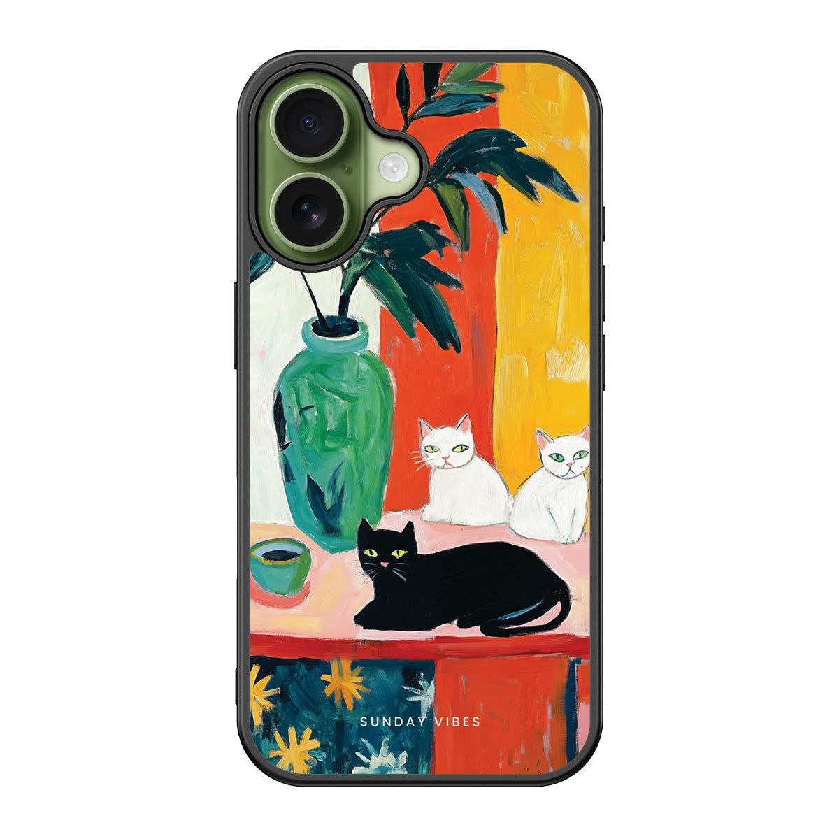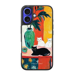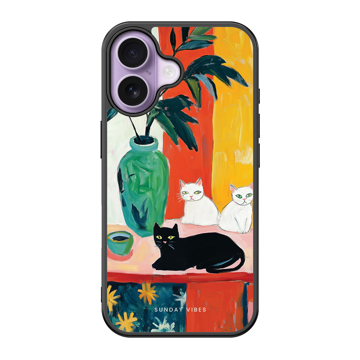 Indulge in a blend of art and feline charm with the Feline Artistry iPhone Case. Its surface is adorned with a vibrant, painterly scene featuring three cats - a sleek black one and two pristine white ones - set against a backdrop of bold colors and a lush green vase. The expressive brushstrokes and vivid palette create a lively, artistic atmosphere. Crafted with shock - absorbent edges, it offers reliable protection against daily impacts. The case's slim profile ensures easy portability, making it a perfect accessory for cat enthusiasts and lovers of artistic designs.