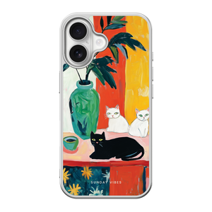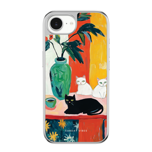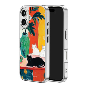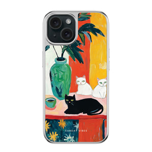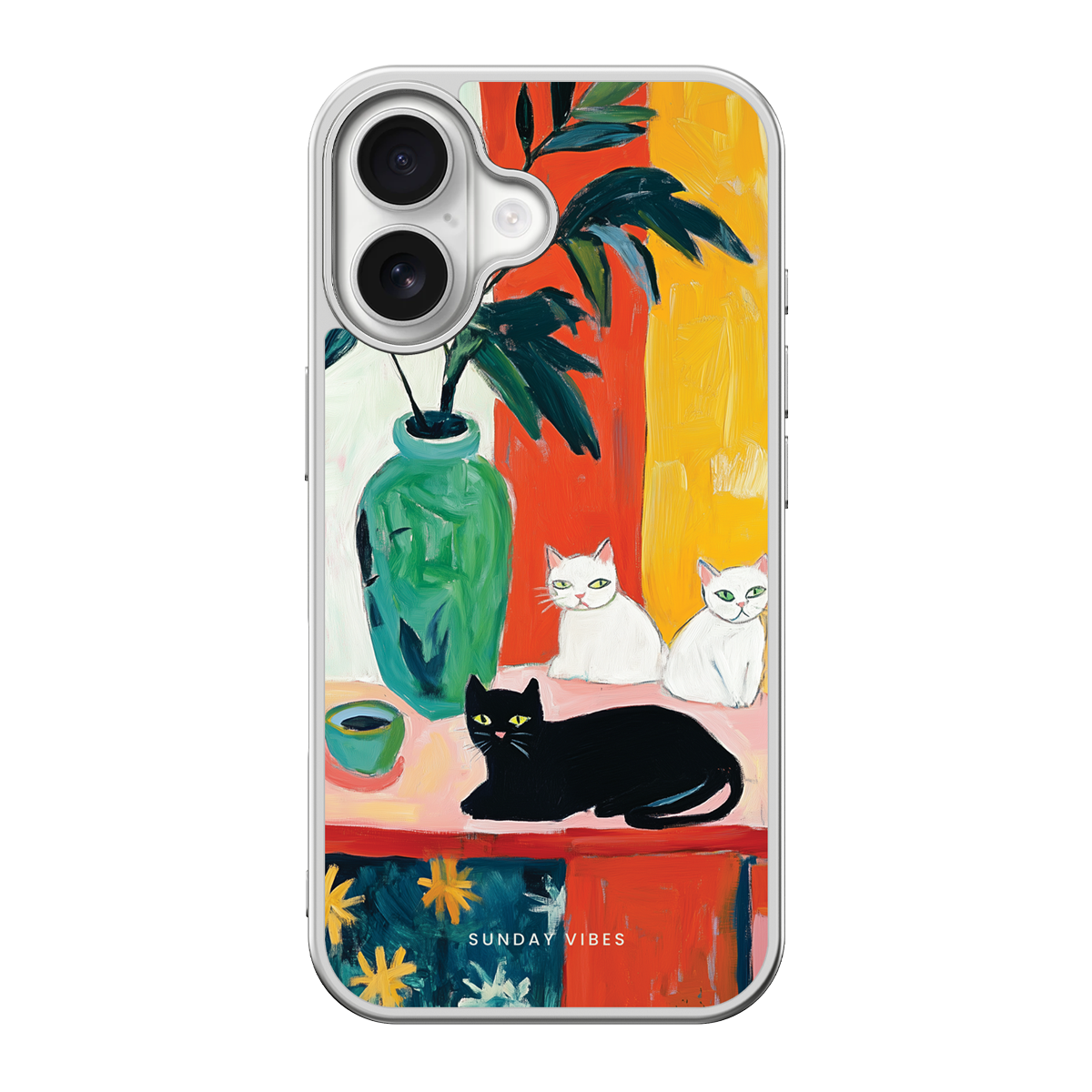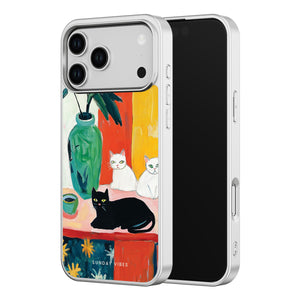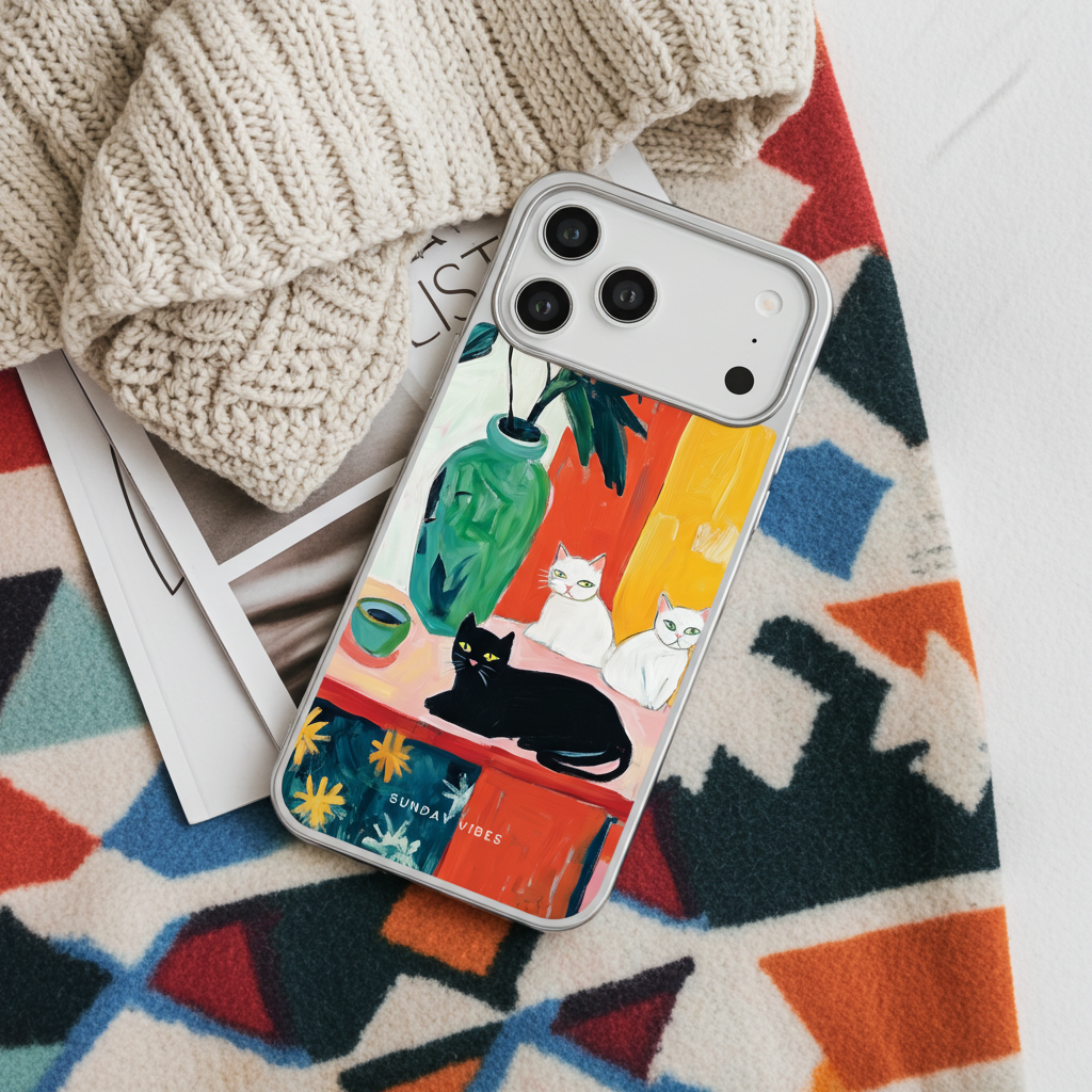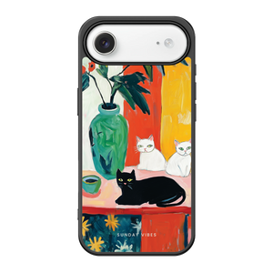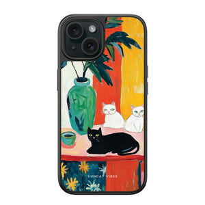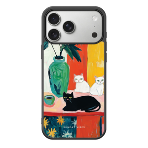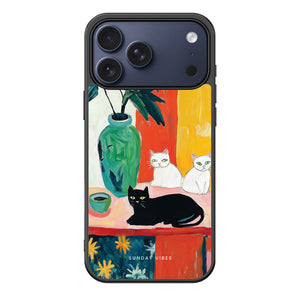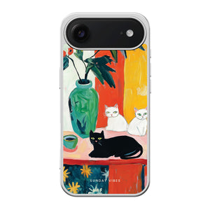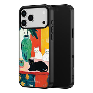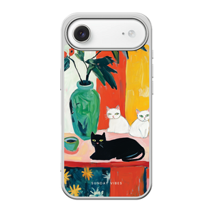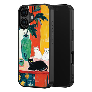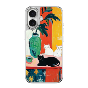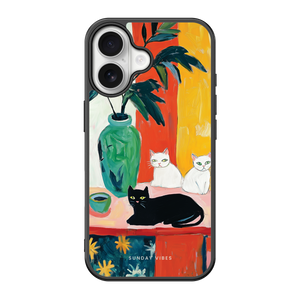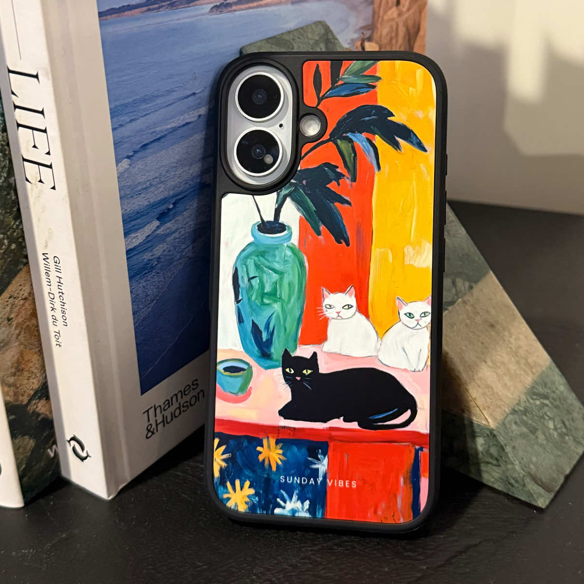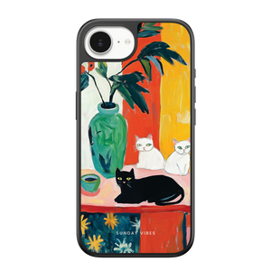 Indulge in a blend of art and feline charm with the Feline Artistry iPhone Case. Its surface is adorned with a vibrant, painterly scene featuring three cats - a sleek black one and two pristine white ones - set against a backdrop of bold colors and a lush green vase. The expressive brushstrokes and vivid palette create a lively, artistic atmosphere. Crafted with shock - absorbent edges, it offers reliable protection against daily impacts. The case's slim profile ensures easy portability, making it a perfect accessory for cat enthusiasts and lovers of artistic designs.