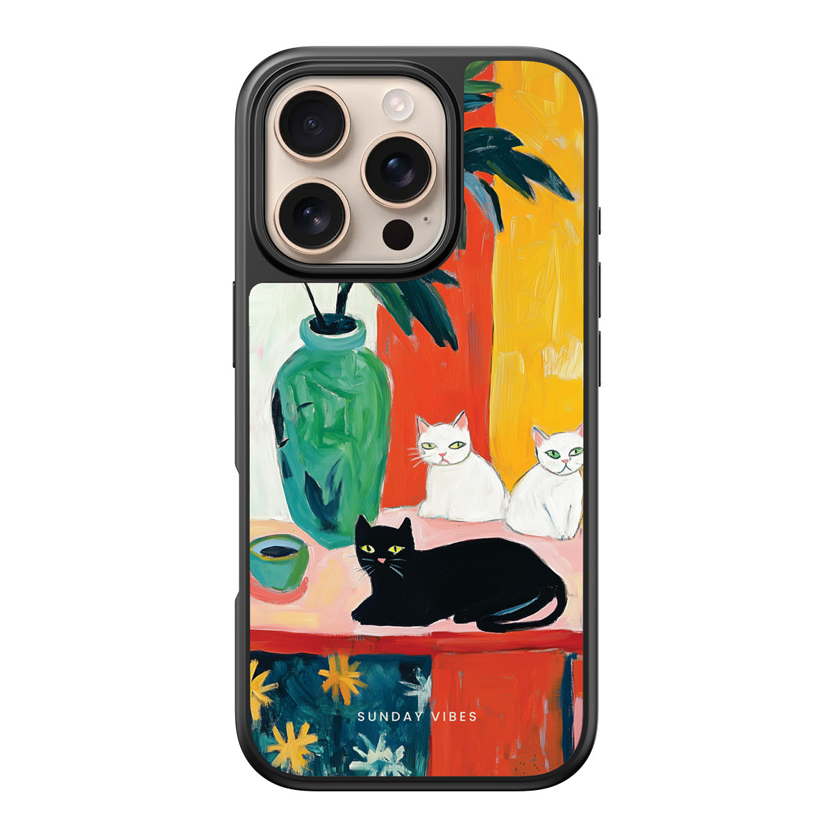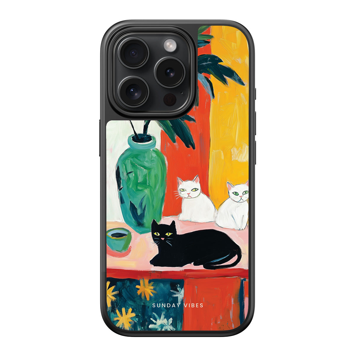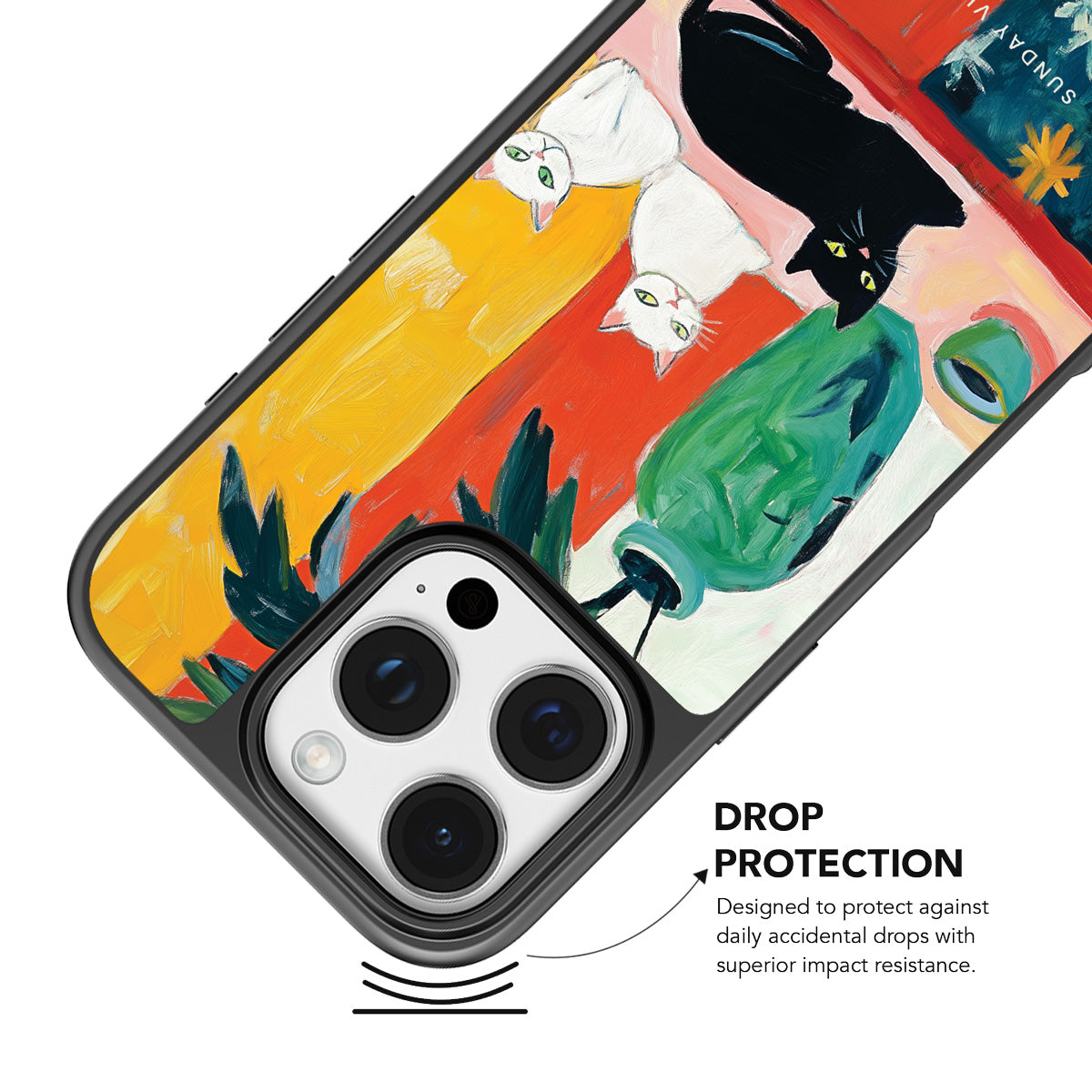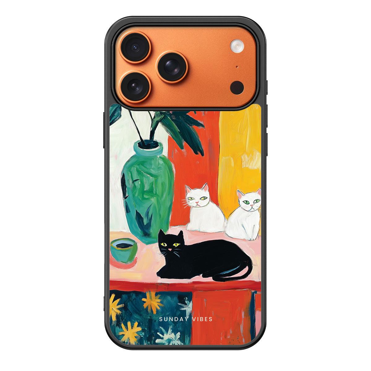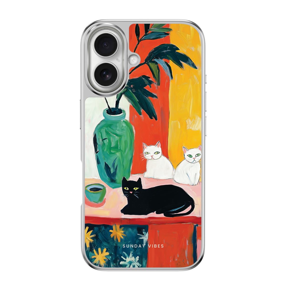 Indulge in a blend of art and feline charm with the Feline Artistry iPhone Case. Its surface is adorned with a vibrant, painterly scene featuring three cats - a sleek black one and two pristine white ones - set against a backdrop of bold colors and a lush green vase. The expressive brushstrokes and vivid palette create a lively, artistic atmosphere. Crafted with shock - absorbent edges, it offers reliable protection against daily impacts. The case's slim profile ensures easy portability, making it a perfect accessory for cat enthusiasts and lovers of artistic designs.
