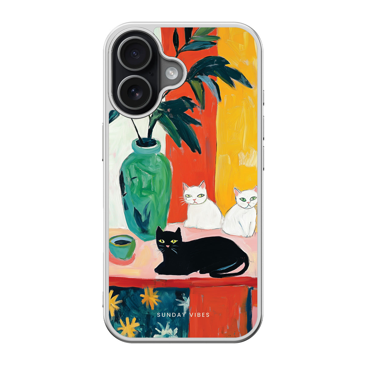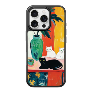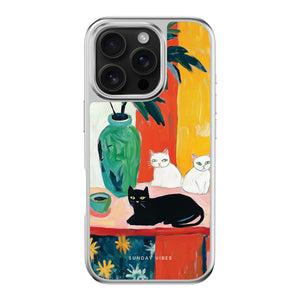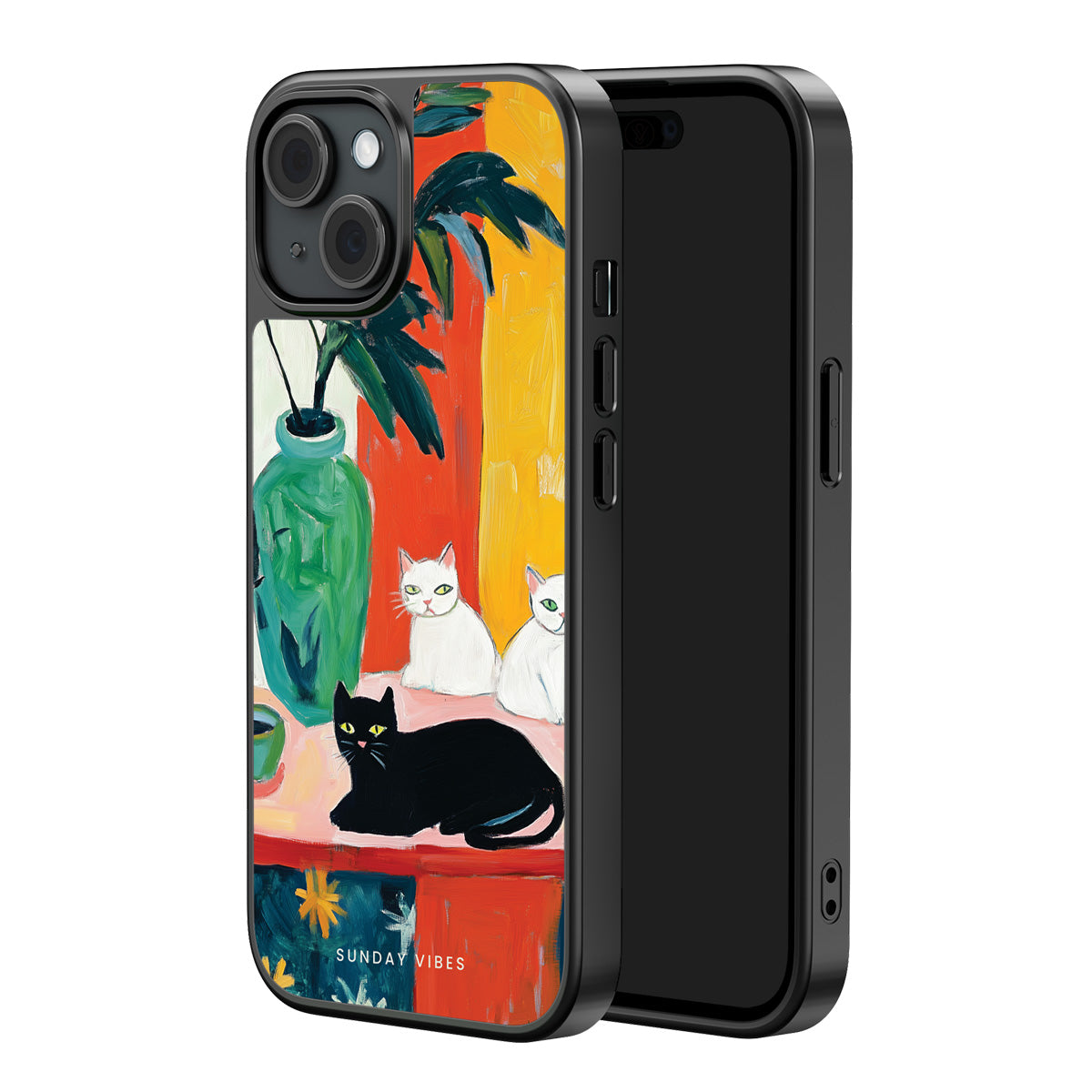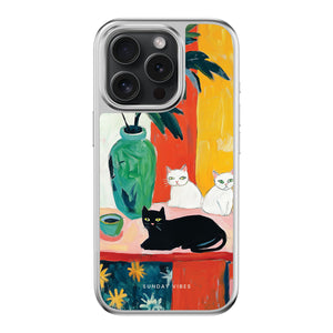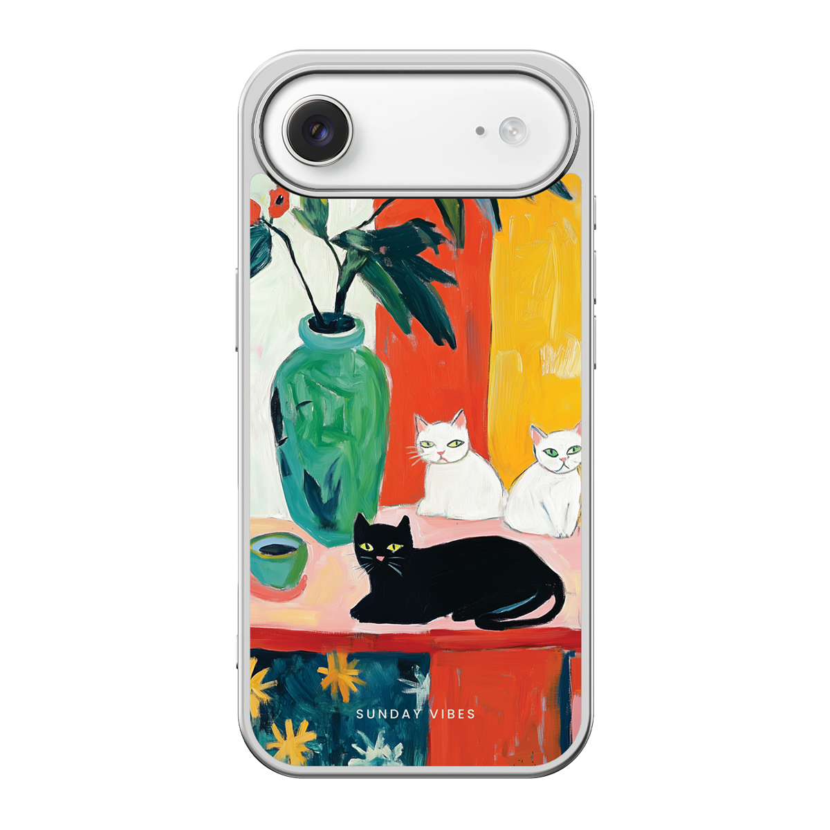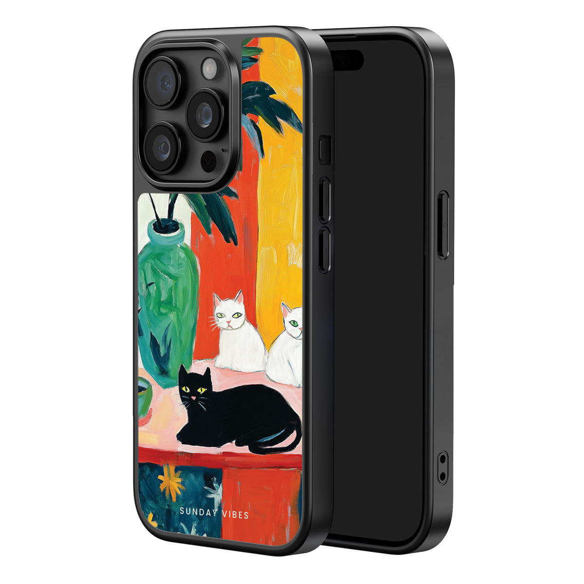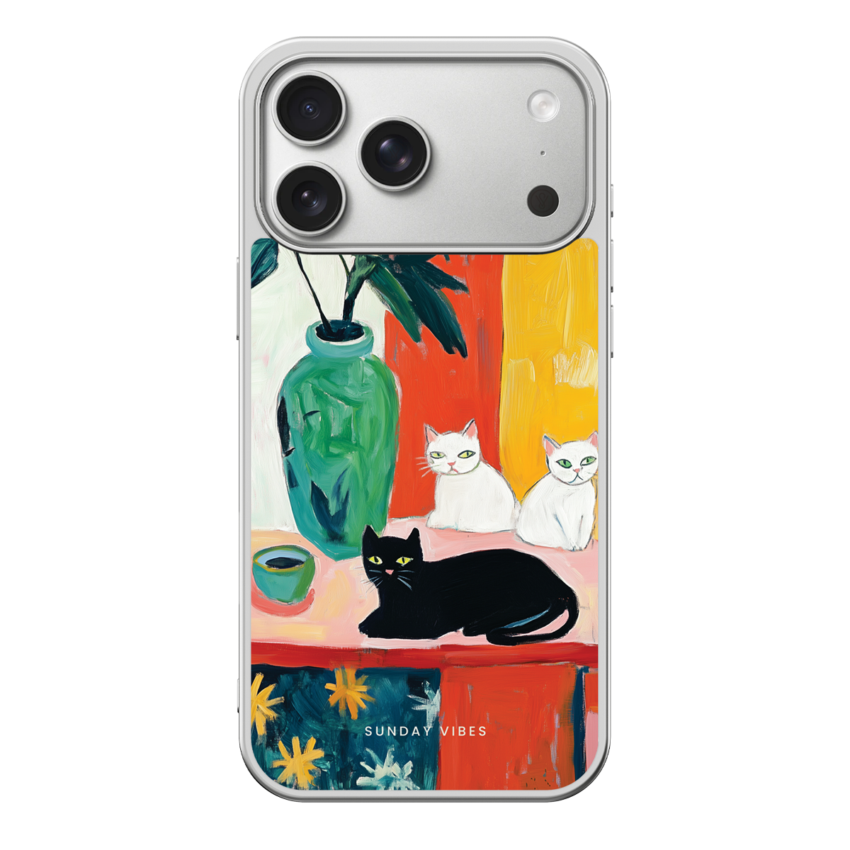Indulge in a blend of art and feline charm with the Feline Artistry iPhone Case. Its surface is adorned with a vibrant, painterly scene featuring three cats - a sleek black one and two pristine white ones - set against a backdrop of bold colors and a lush green vase. The expressive brushstrokes and vivid palette create a lively, artistic atmosphere. Crafted with shock - absorbent edges, it offers reliable protection against daily impacts. The case's slim profile ensures easy portability, making it a perfect accessory for cat enthusiasts and lovers of artistic designs.