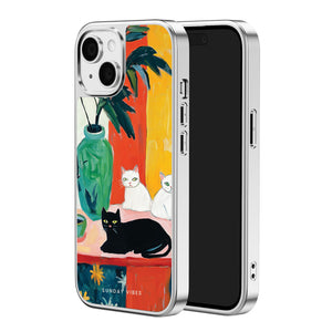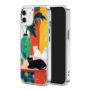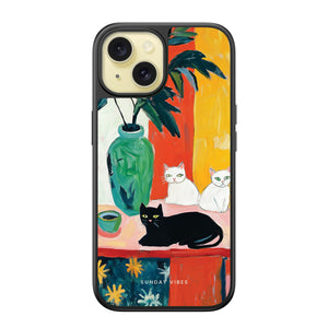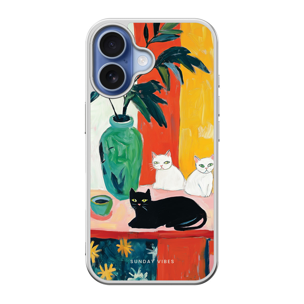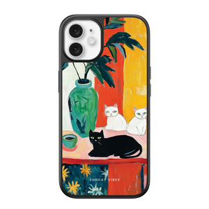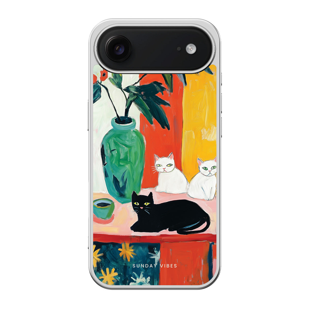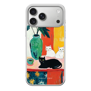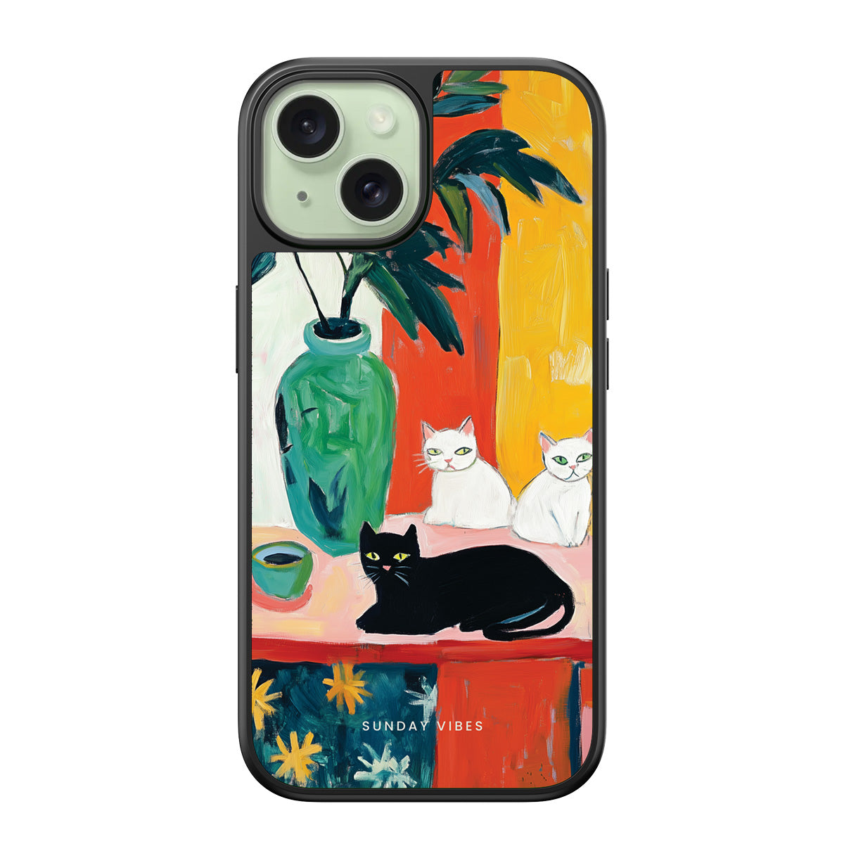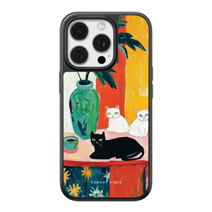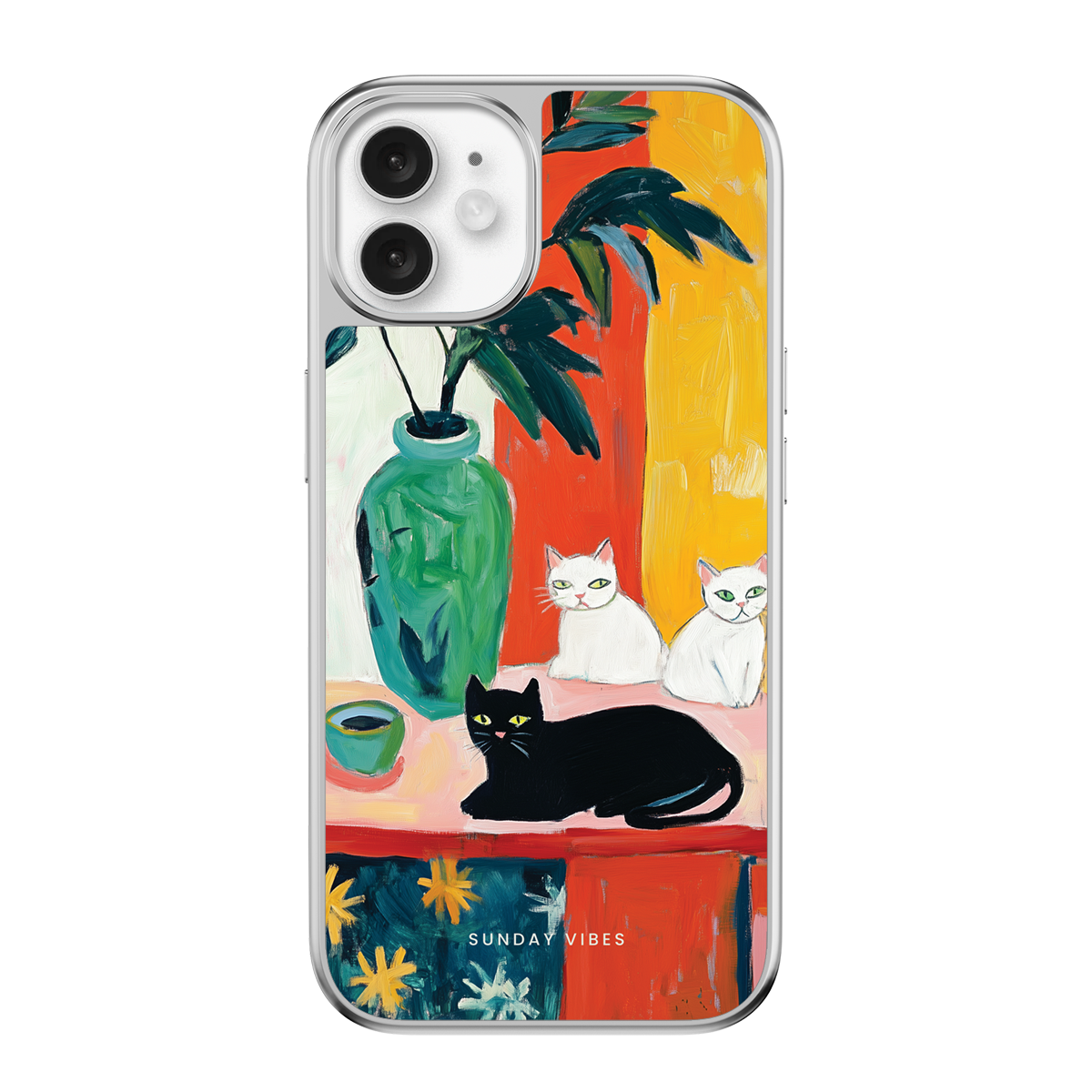 Indulge in a blend of art and feline charm with the Feline Artistry iPhone Case. Its surface is adorned with a vibrant, painterly scene featuring three cats - a sleek black one and two pristine white ones - set against a backdrop of bold colors and a lush green vase. The expressive brushstrokes and vivid palette create a lively, artistic atmosphere. Crafted with shock - absorbent edges, it offers reliable protection against daily impacts. The case's slim profile ensures easy portability, making it a perfect accessory for cat enthusiasts and lovers of artistic designs.