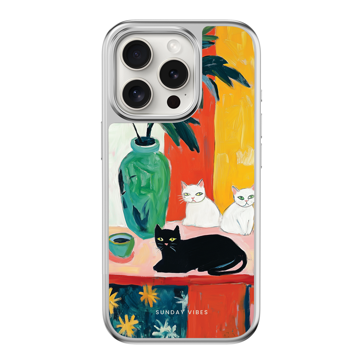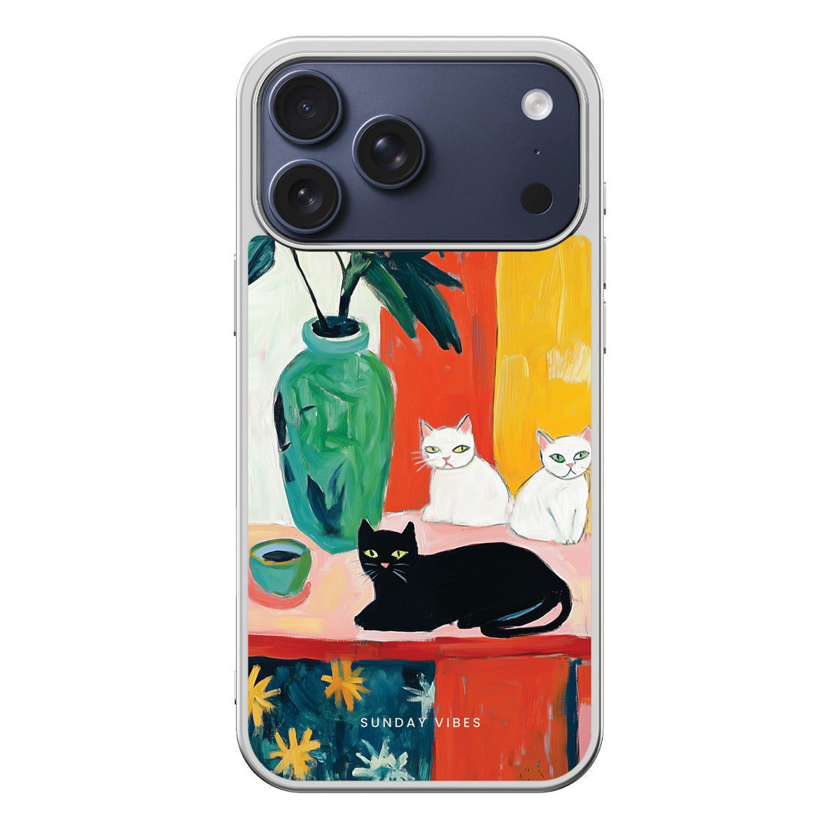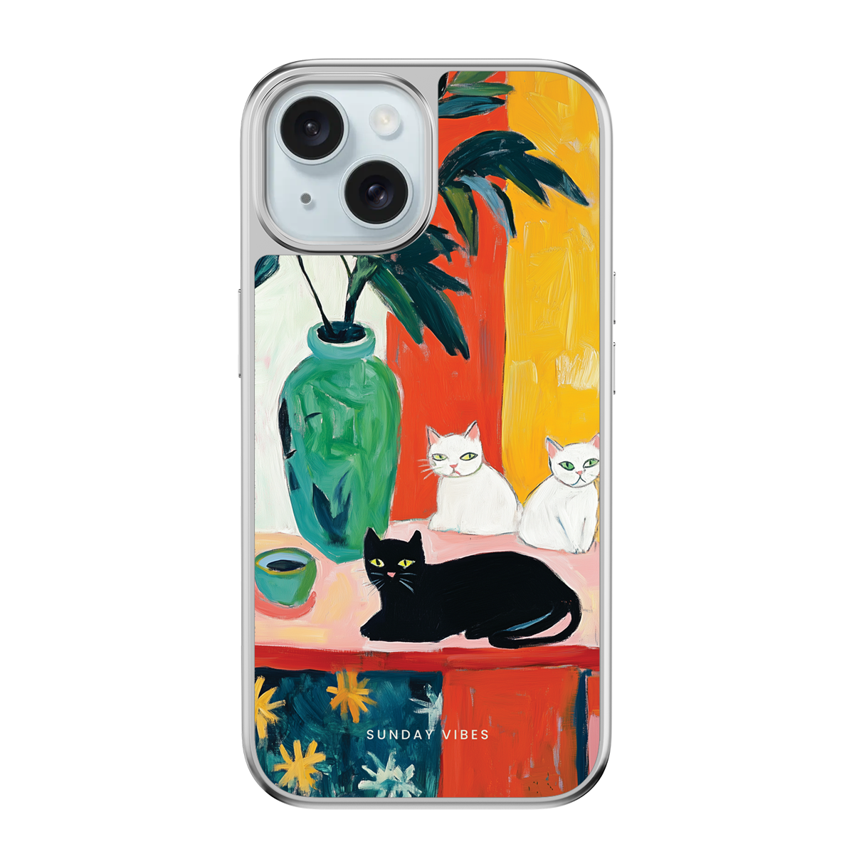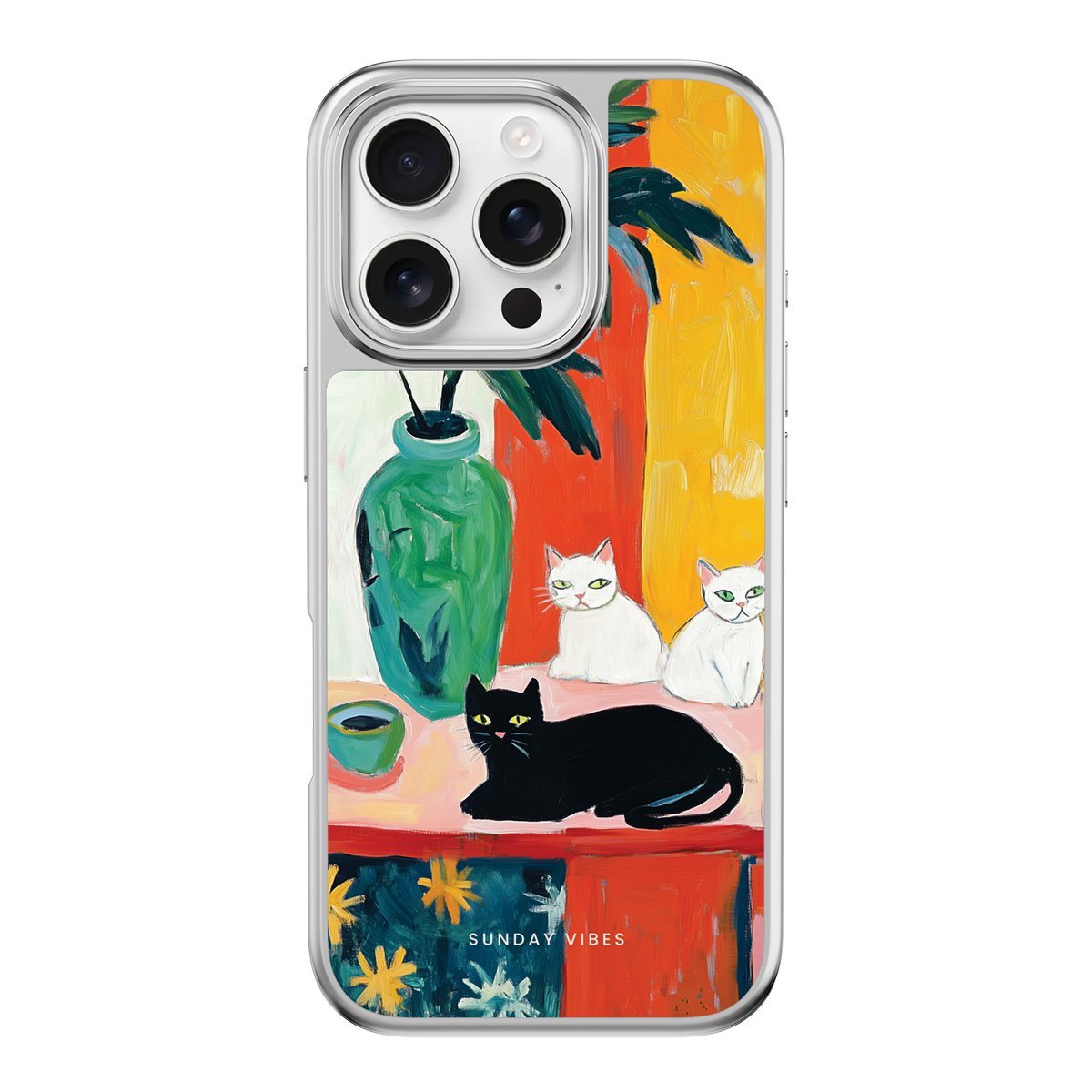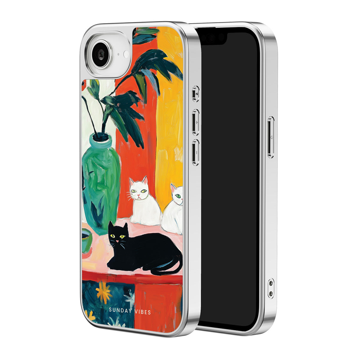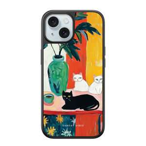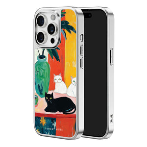 Indulge in a blend of art and feline charm with the Feline Artistry iPhone Case. Its surface is adorned with a vibrant, painterly scene featuring three cats - a sleek black one and two pristine white ones - set against a backdrop of bold colors and a lush green vase. The expressive brushstrokes and vivid palette create a lively, artistic atmosphere. Crafted with shock - absorbent edges, it offers reliable protection against daily impacts. The case's slim profile ensures easy portability, making it a perfect accessory for cat enthusiasts and lovers of artistic designs.