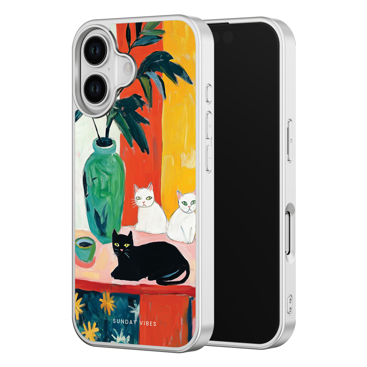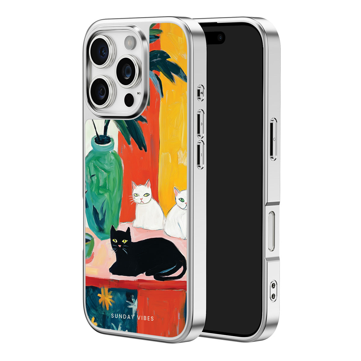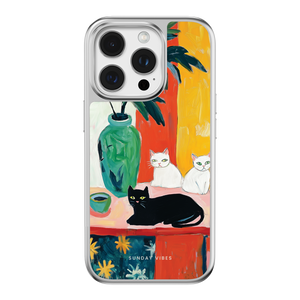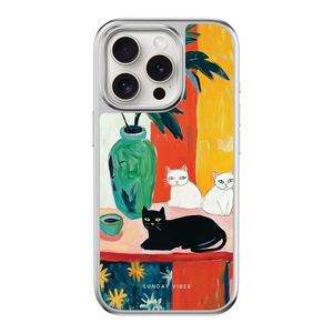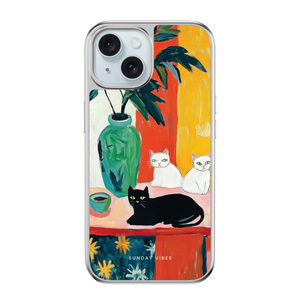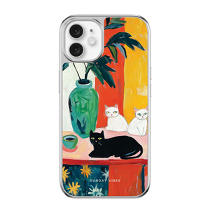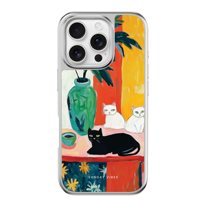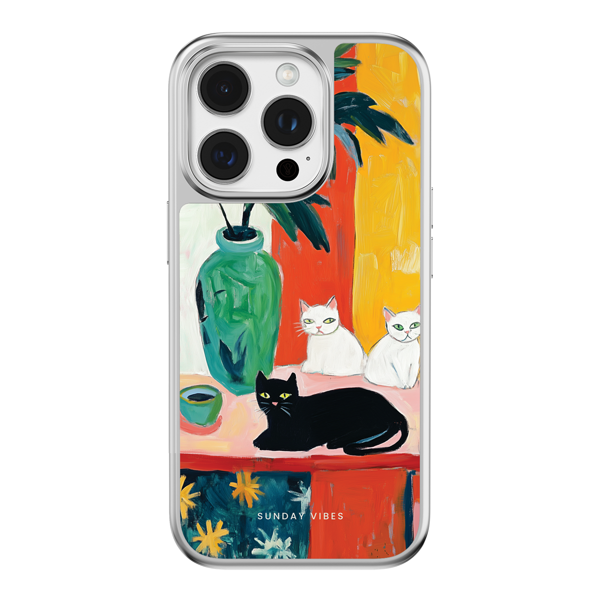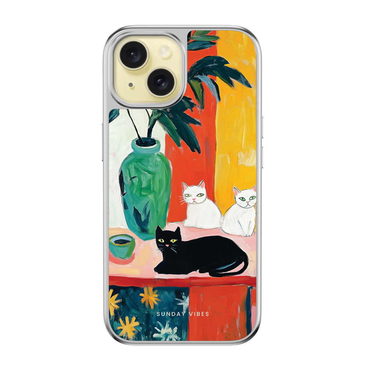 Indulge in a blend of art and feline charm with the Feline Artistry iPhone Case. Its surface is adorned with a vibrant, painterly scene featuring three cats - a sleek black one and two pristine white ones - set against a backdrop of bold colors and a lush green vase. The expressive brushstrokes and vivid palette create a lively, artistic atmosphere. Crafted with shock - absorbent edges, it offers reliable protection against daily impacts. The case's slim profile ensures easy portability, making it a perfect accessory for cat enthusiasts and lovers of artistic designs.