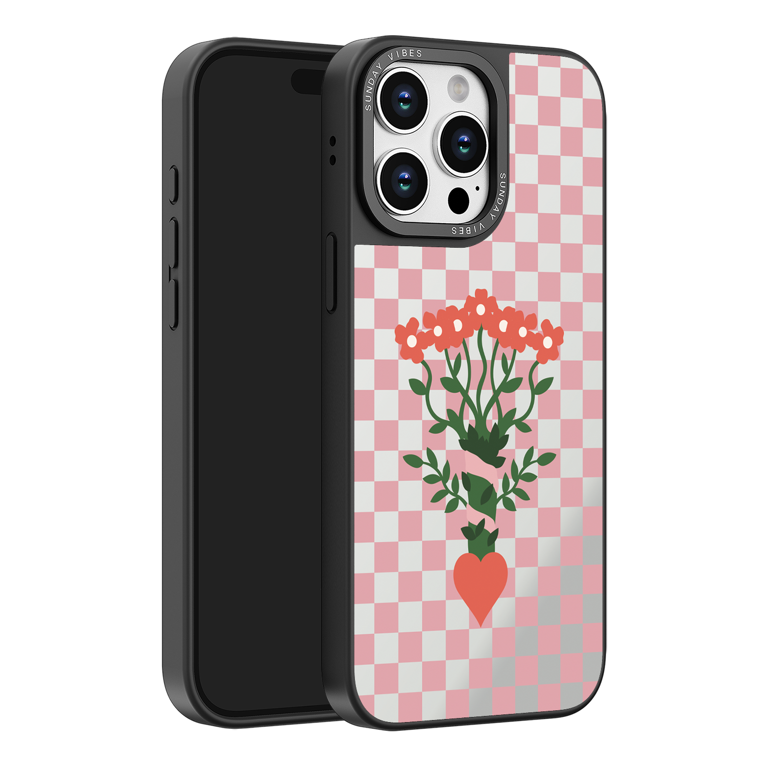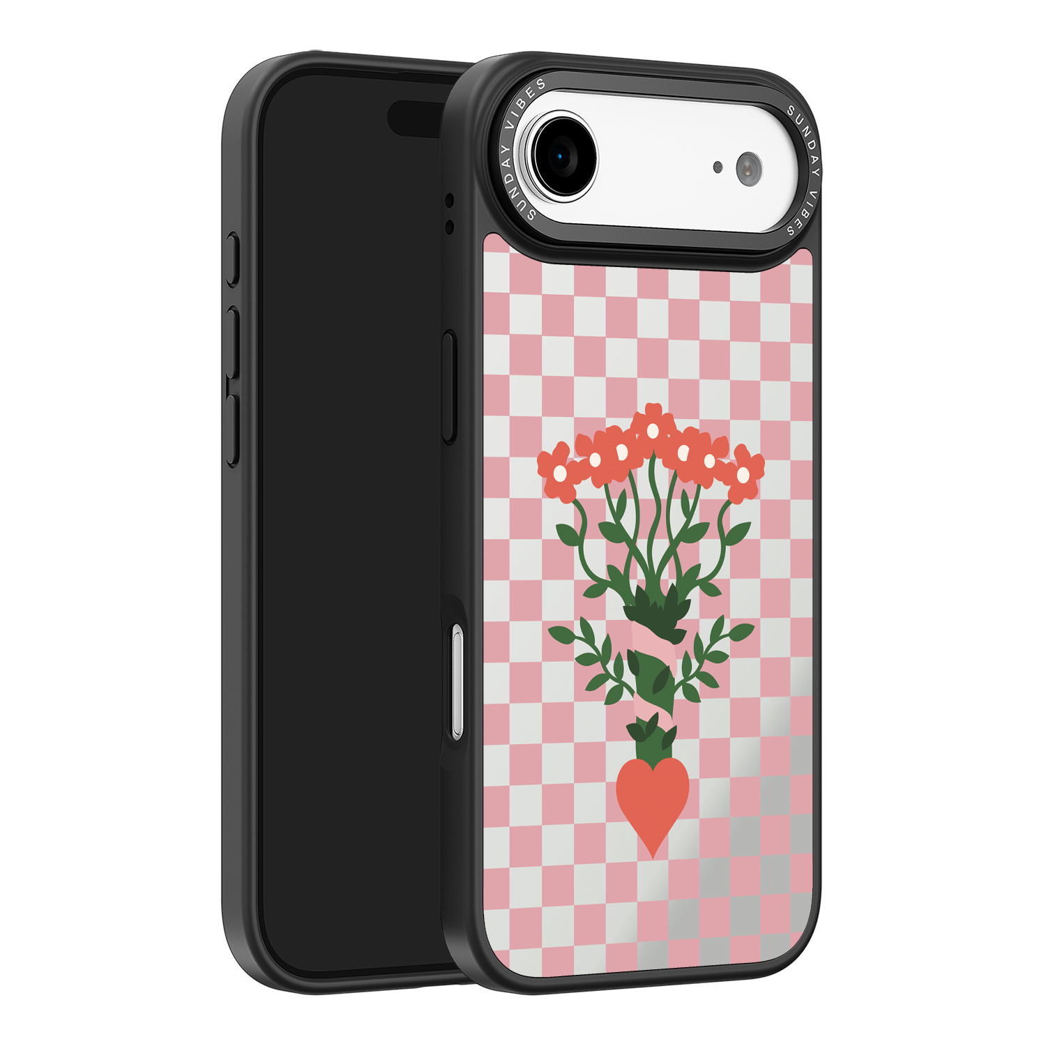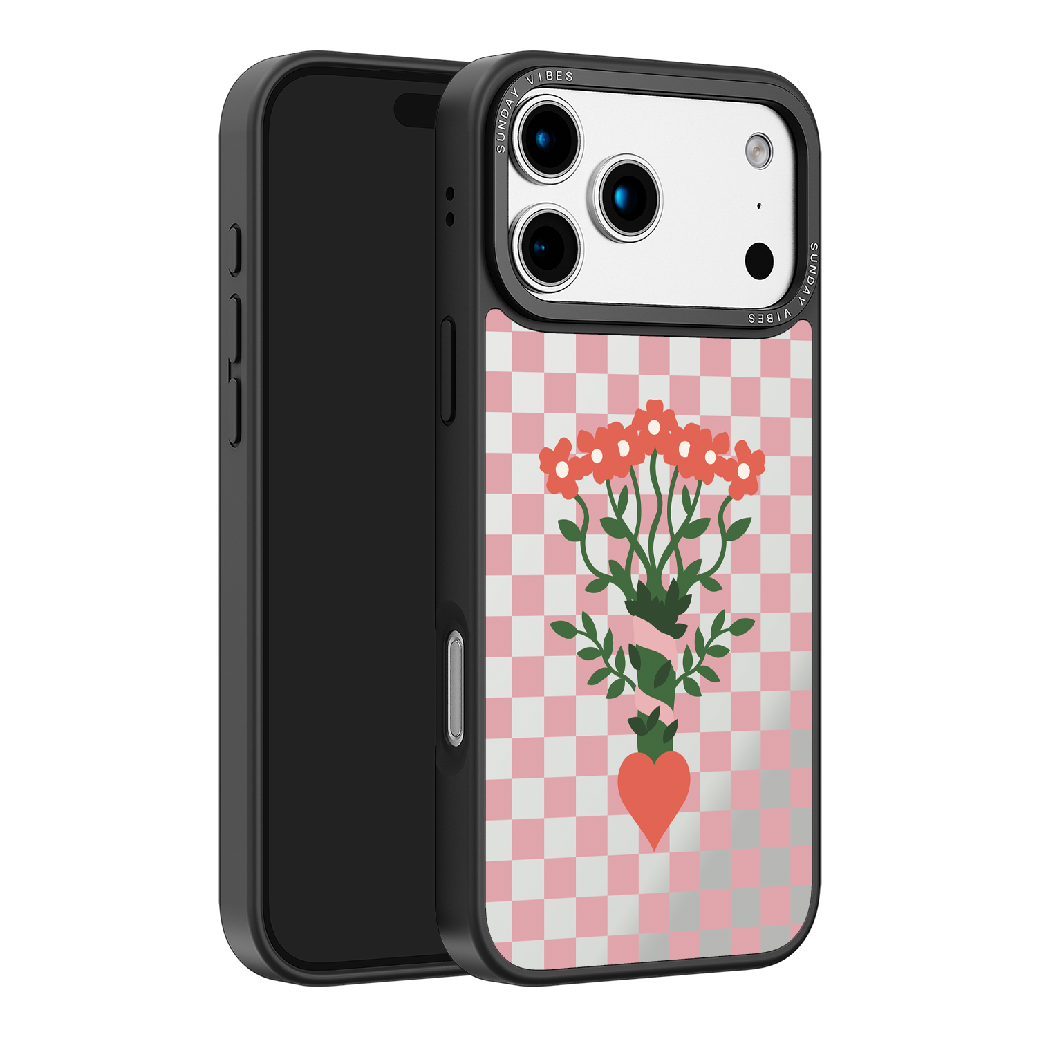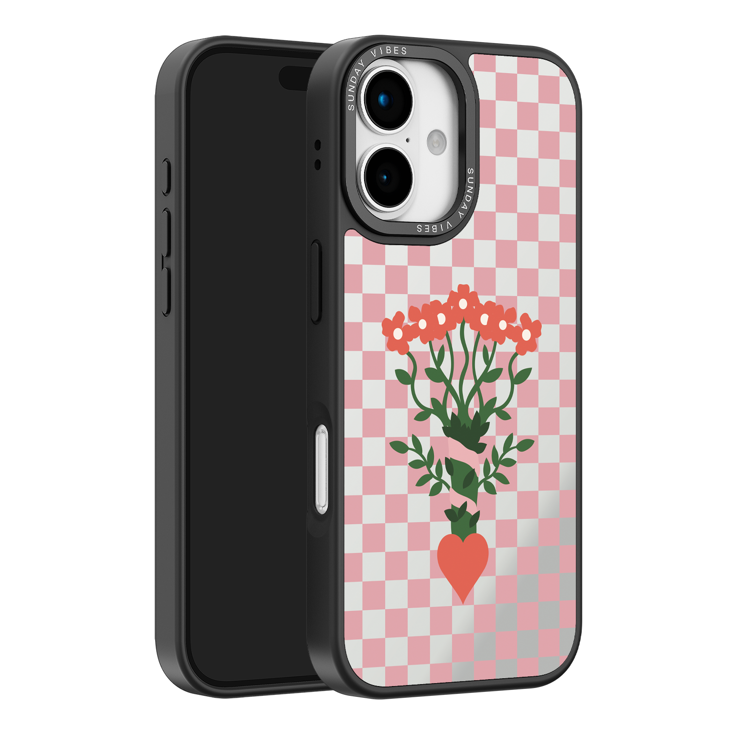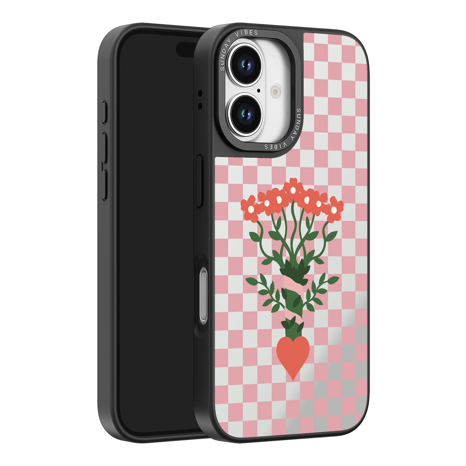 Adorn your device with the bold, romantic glamour of the Love Check iPhone Case. This striking design features a central illustration of a vibrant floral bouquet tied with a heart, set against a dazzling pink and silver checkerboard mirror backing. This unique fusion of sweetness and graphic boldness ensures you are always ready for a quick style check or selfie. The vibrant print and texture are applied directly onto the mirror surface for maximum visual impact.