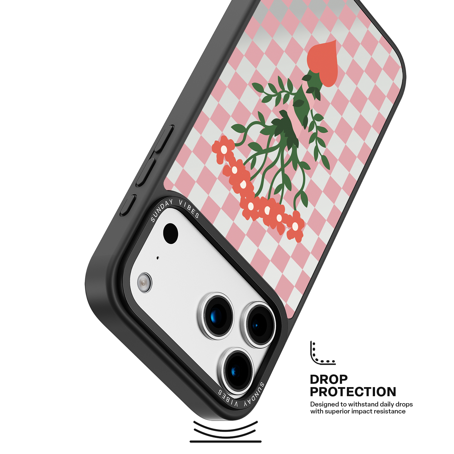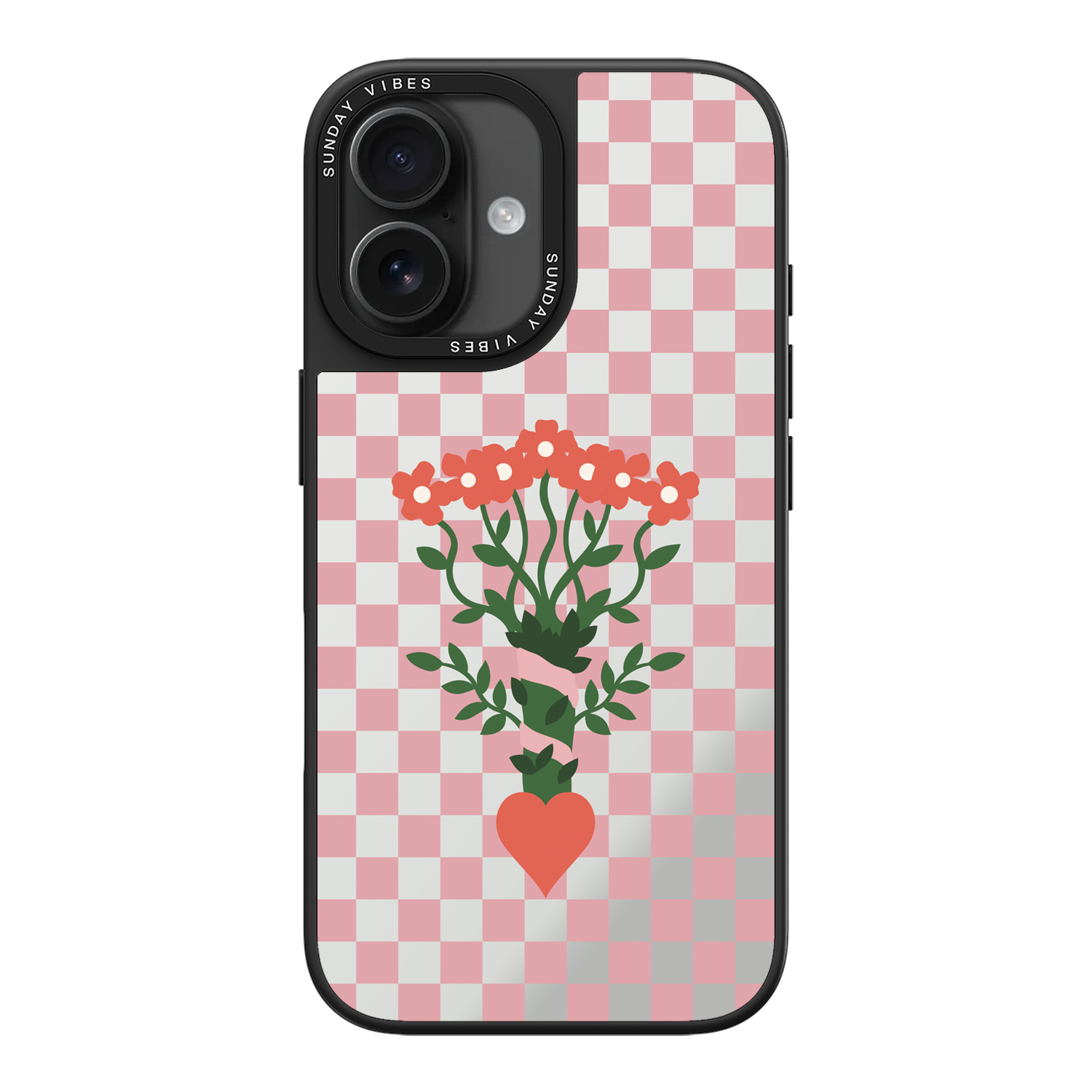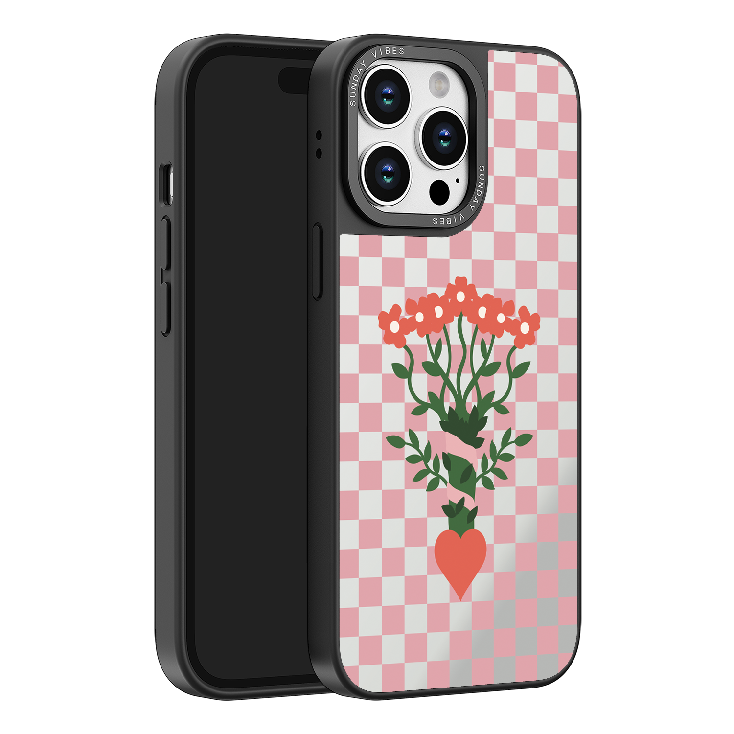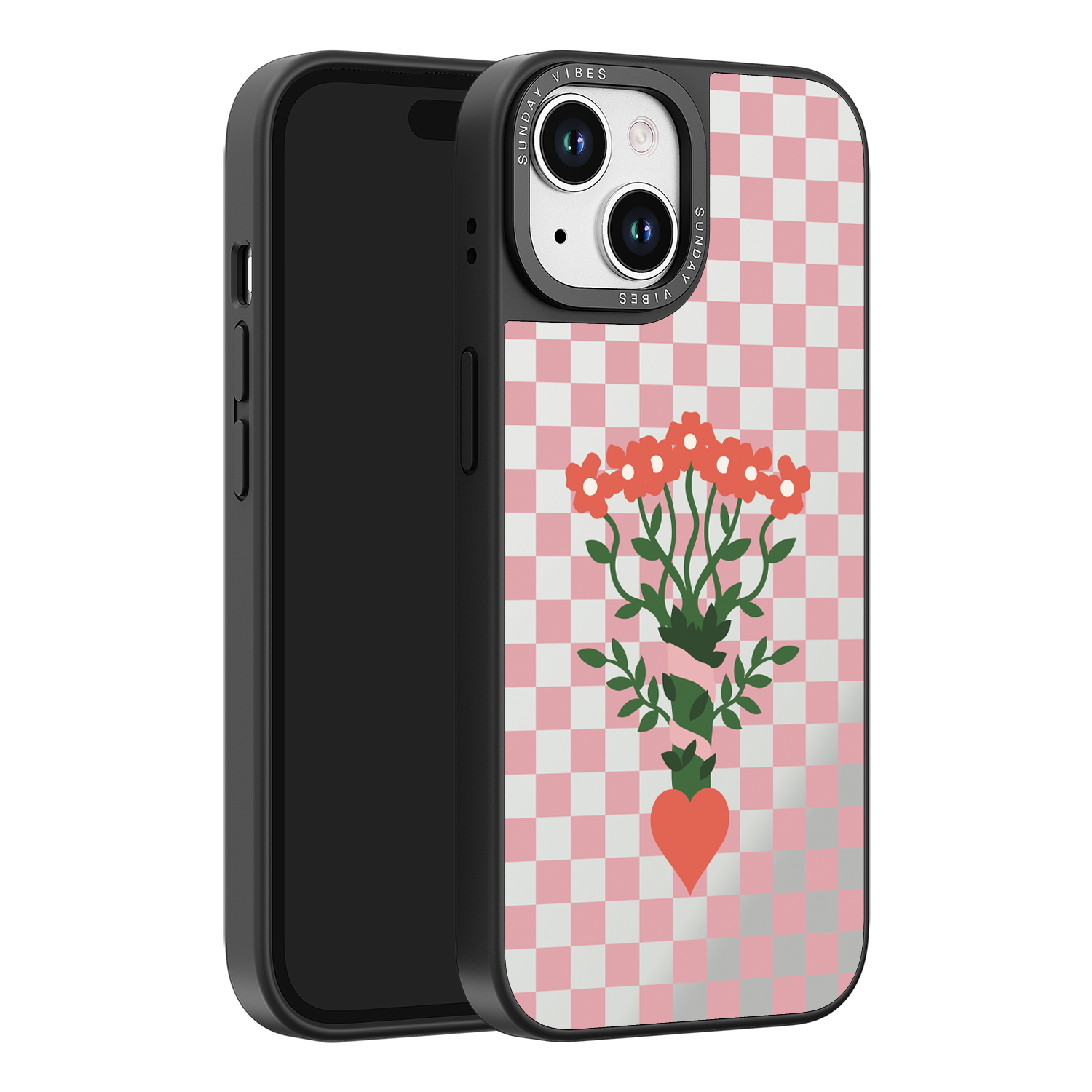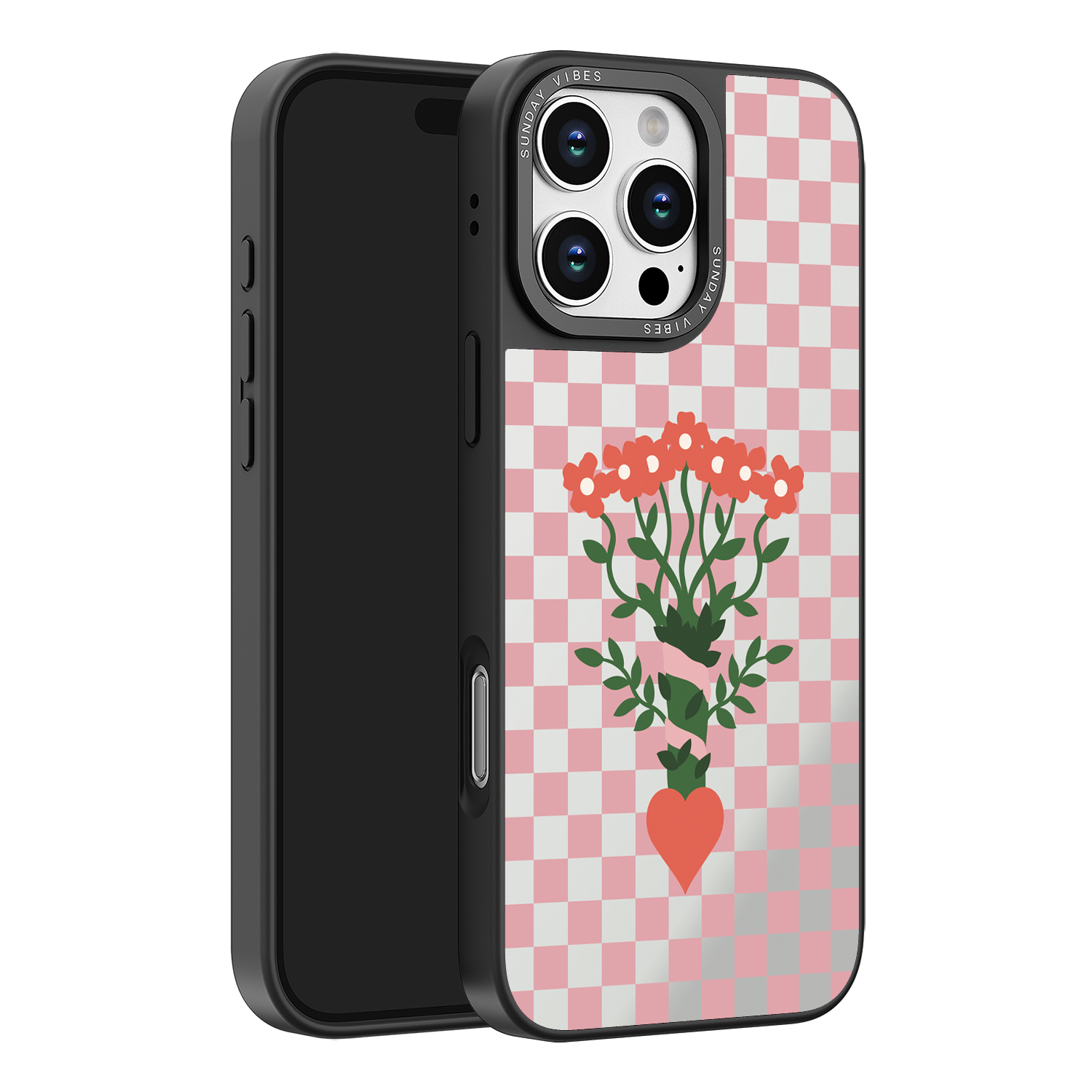 Adorn your device with the bold, romantic glamour of the Love Check iPhone Case. This striking design features a central illustration of a vibrant floral bouquet tied with a heart, set against a dazzling pink and silver checkerboard mirror backing. This unique fusion of sweetness and graphic boldness ensures you are always ready for a quick style check or selfie. The vibrant print and texture are applied directly onto the mirror surface for maximum visual impact.