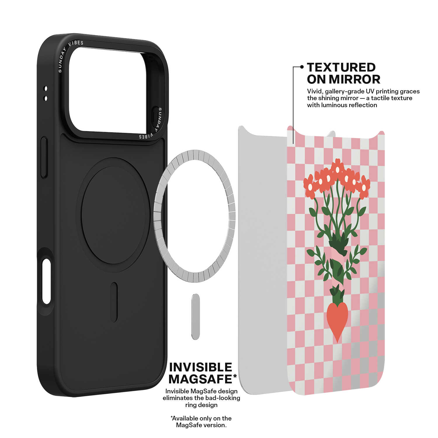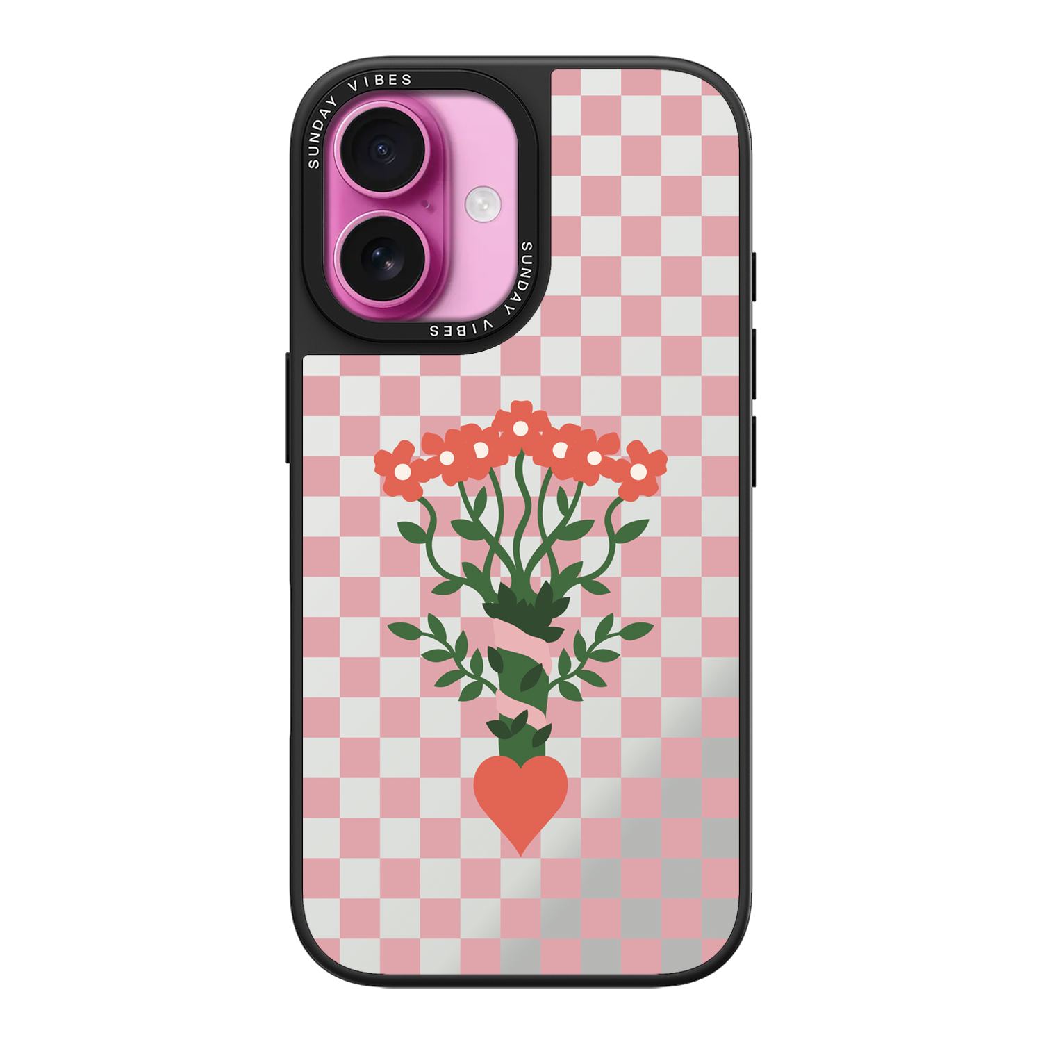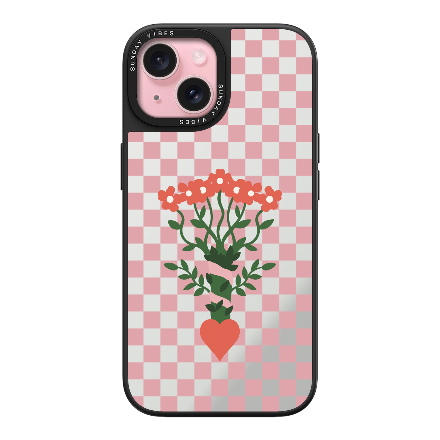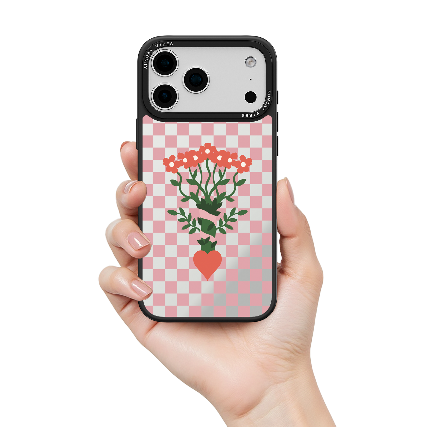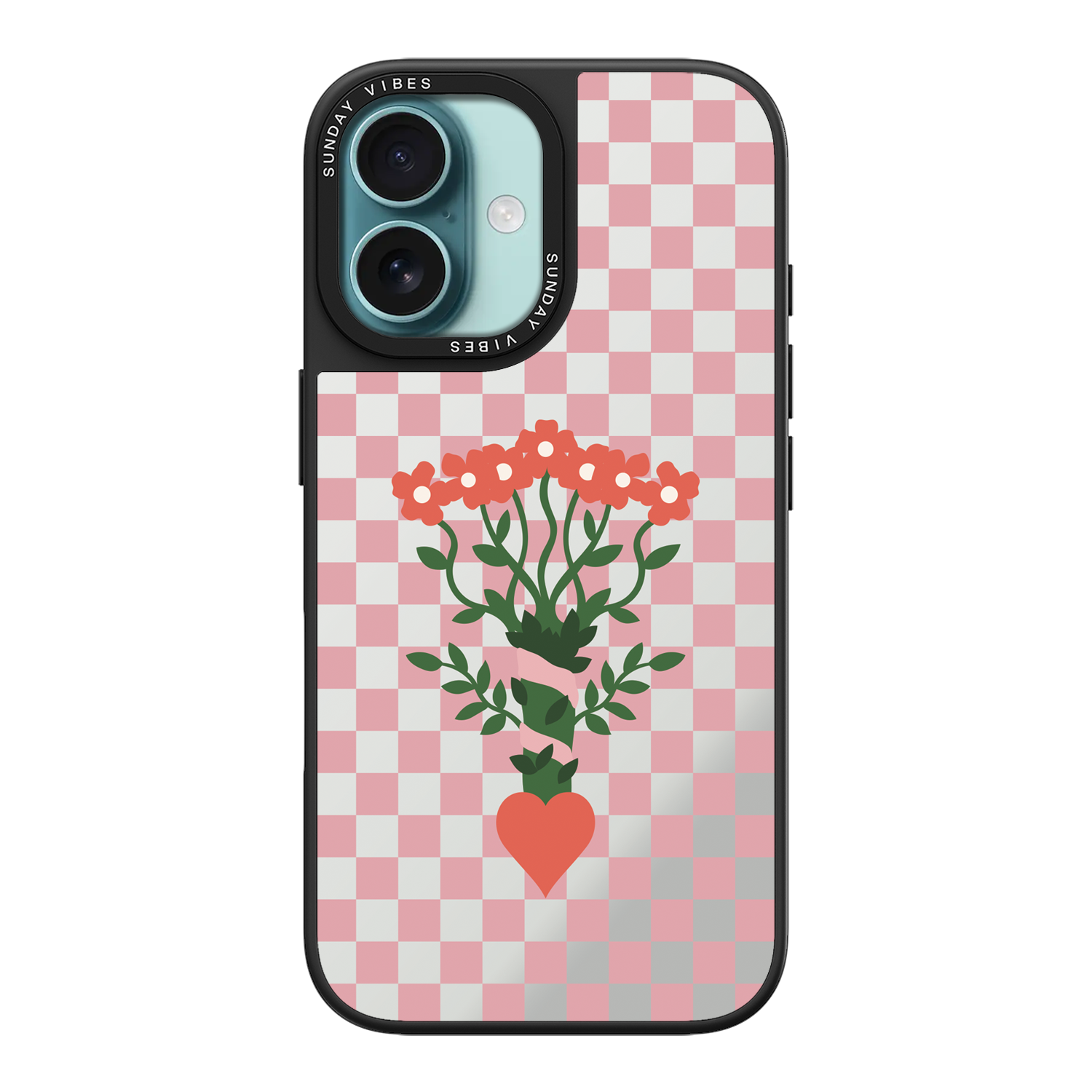 Adorn your device with the bold, romantic glamour of the Love Check iPhone Case. This striking design features a central illustration of a vibrant floral bouquet tied with a heart, set against a dazzling pink and silver checkerboard mirror backing. This unique fusion of sweetness and graphic boldness ensures you are always ready for a quick style check or selfie. The vibrant print and texture are applied directly onto the mirror surface for maximum visual impact.