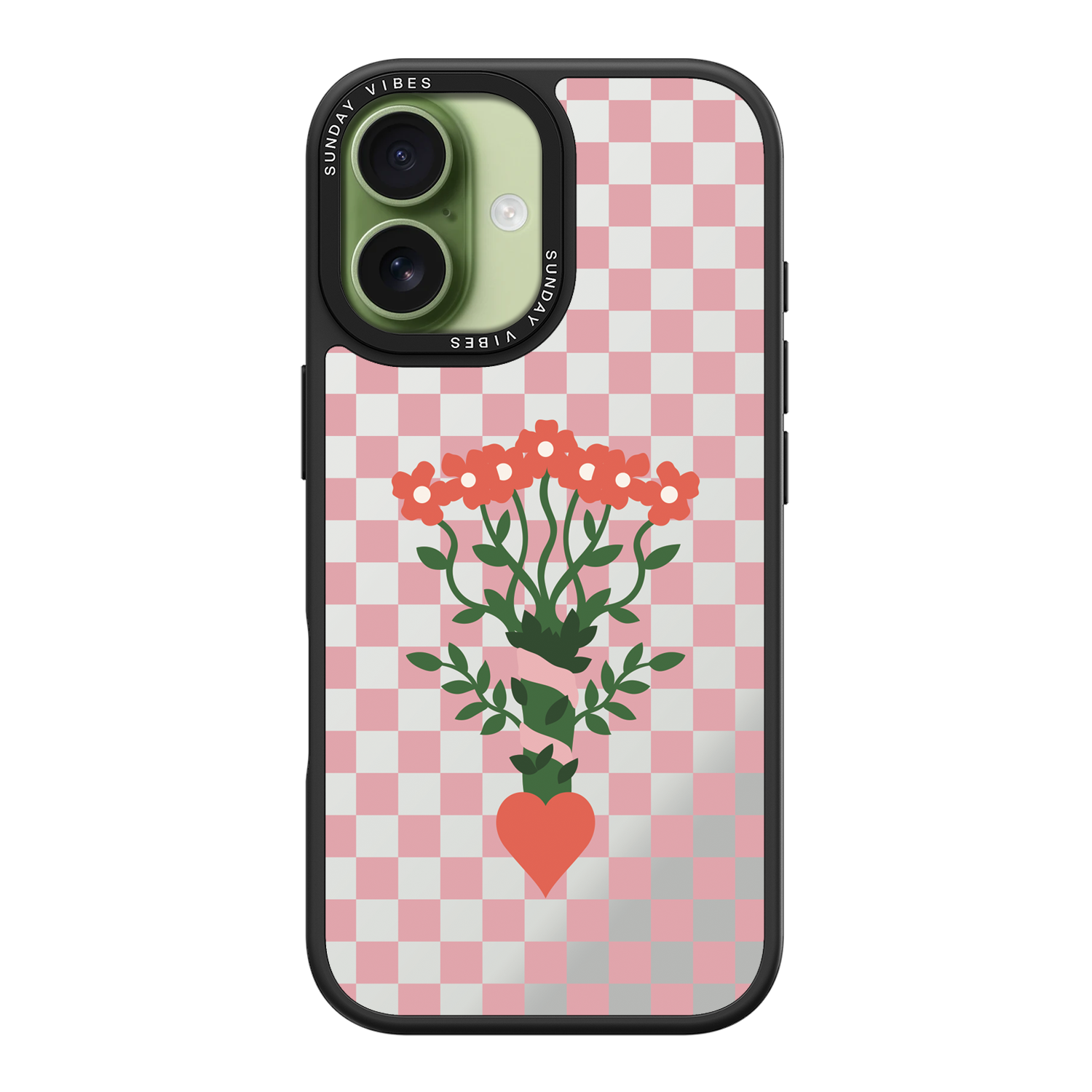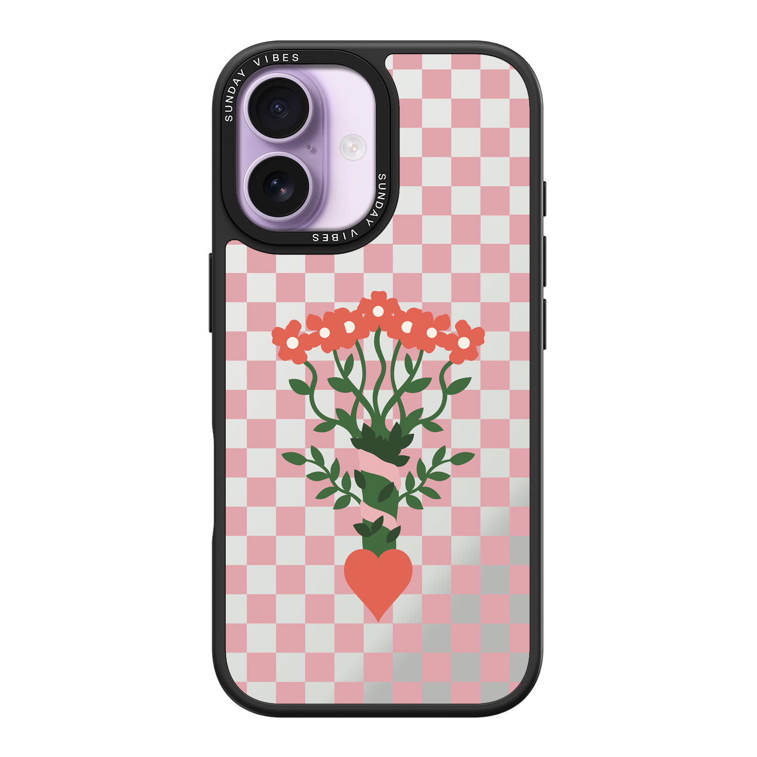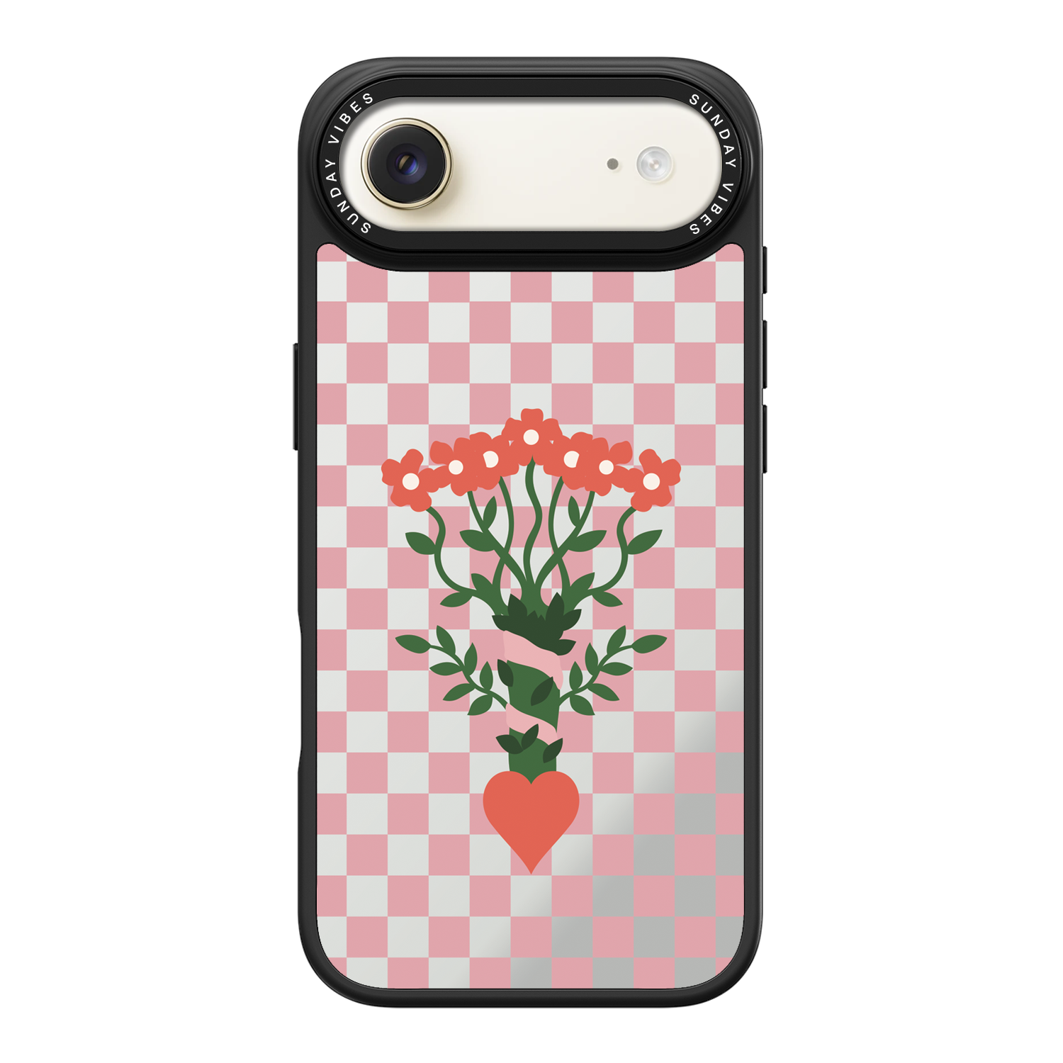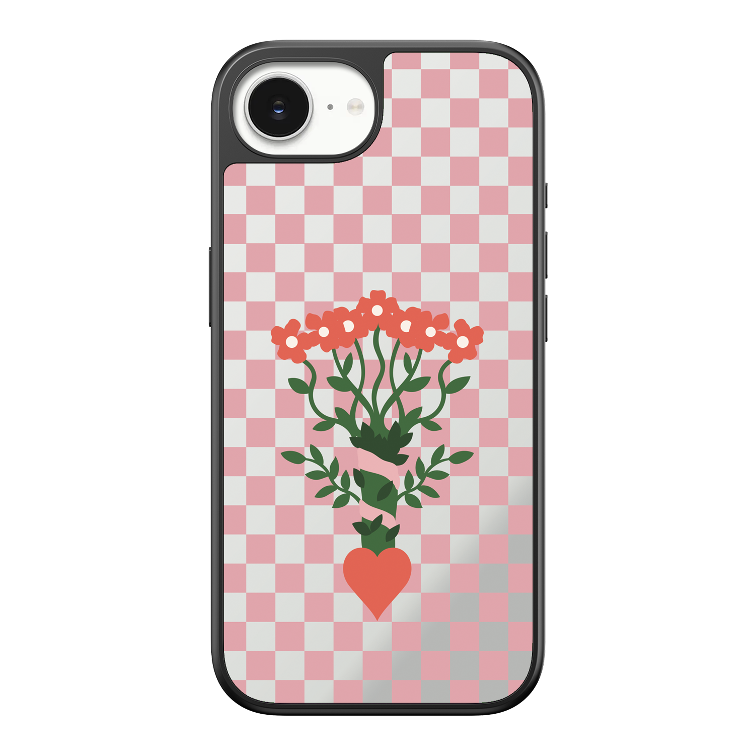 Adorn your device with the bold, romantic glamour of the Love Check iPhone Case. This striking design features a central illustration of a vibrant floral bouquet tied with a heart, set against a dazzling pink and silver checkerboard mirror backing. This unique fusion of sweetness and graphic boldness ensures you are always ready for a quick style check or selfie. The vibrant print and texture are applied directly onto the mirror surface for maximum visual impact.