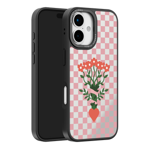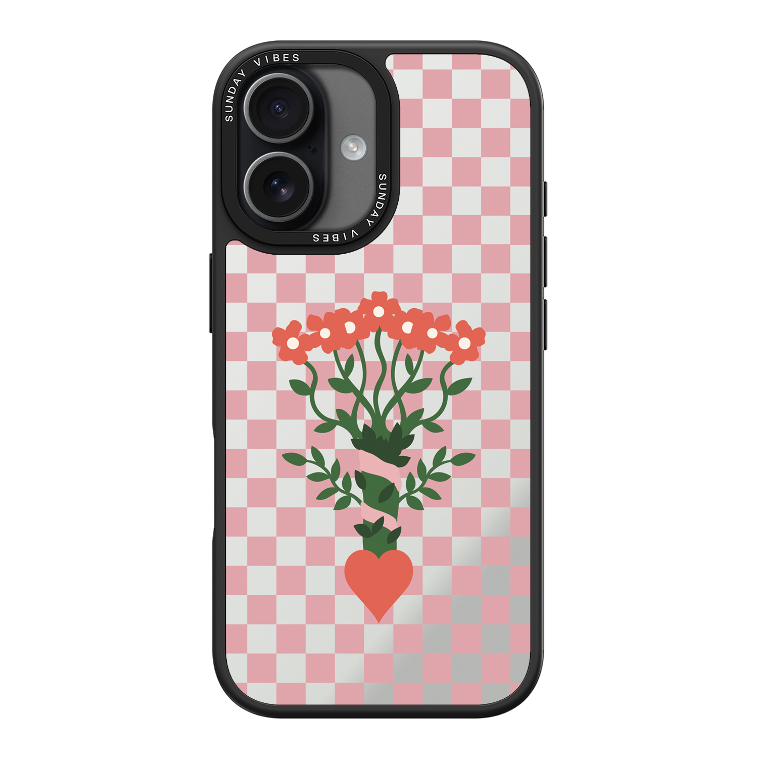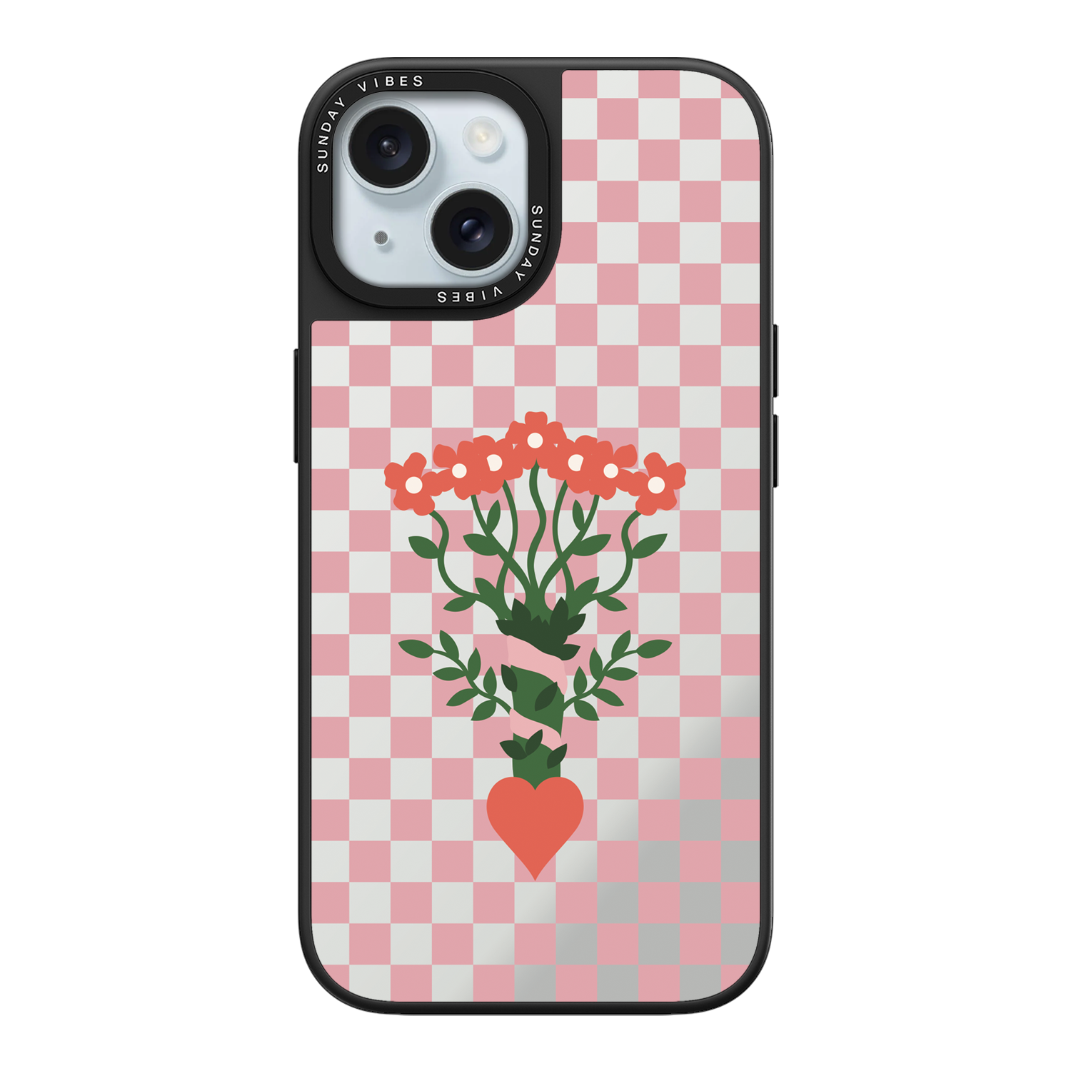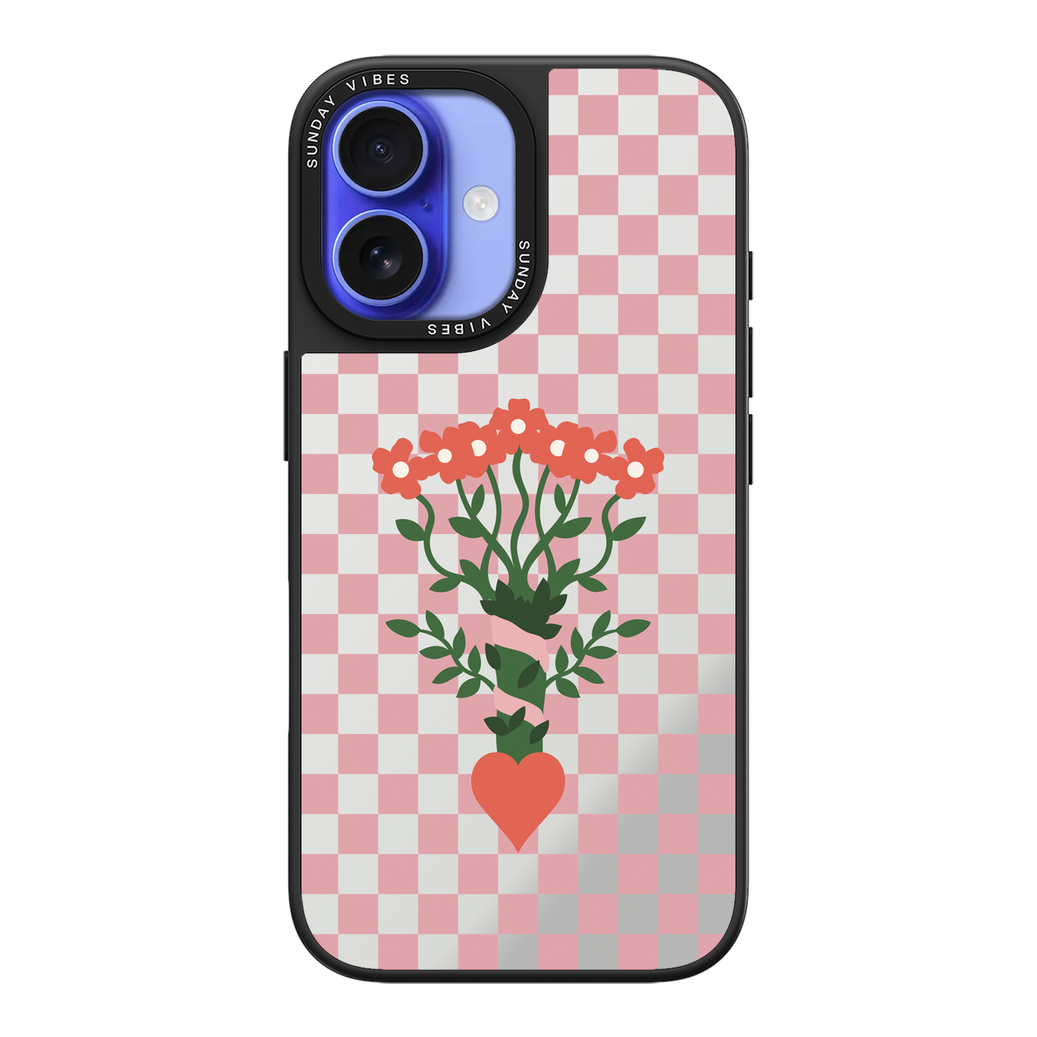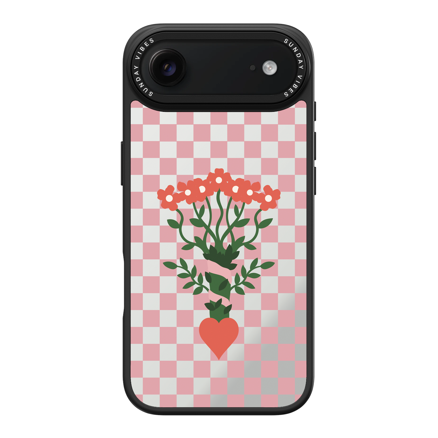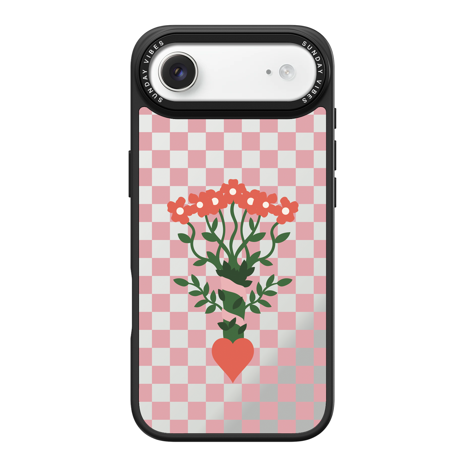 Adorn your device with the bold, romantic glamour of the Love Check iPhone Case. This striking design features a central illustration of a vibrant floral bouquet tied with a heart, set against a dazzling pink and silver checkerboard mirror backing. This unique fusion of sweetness and graphic boldness ensures you are always ready for a quick style check or selfie. The vibrant print and texture are applied directly onto the mirror surface for maximum visual impact.