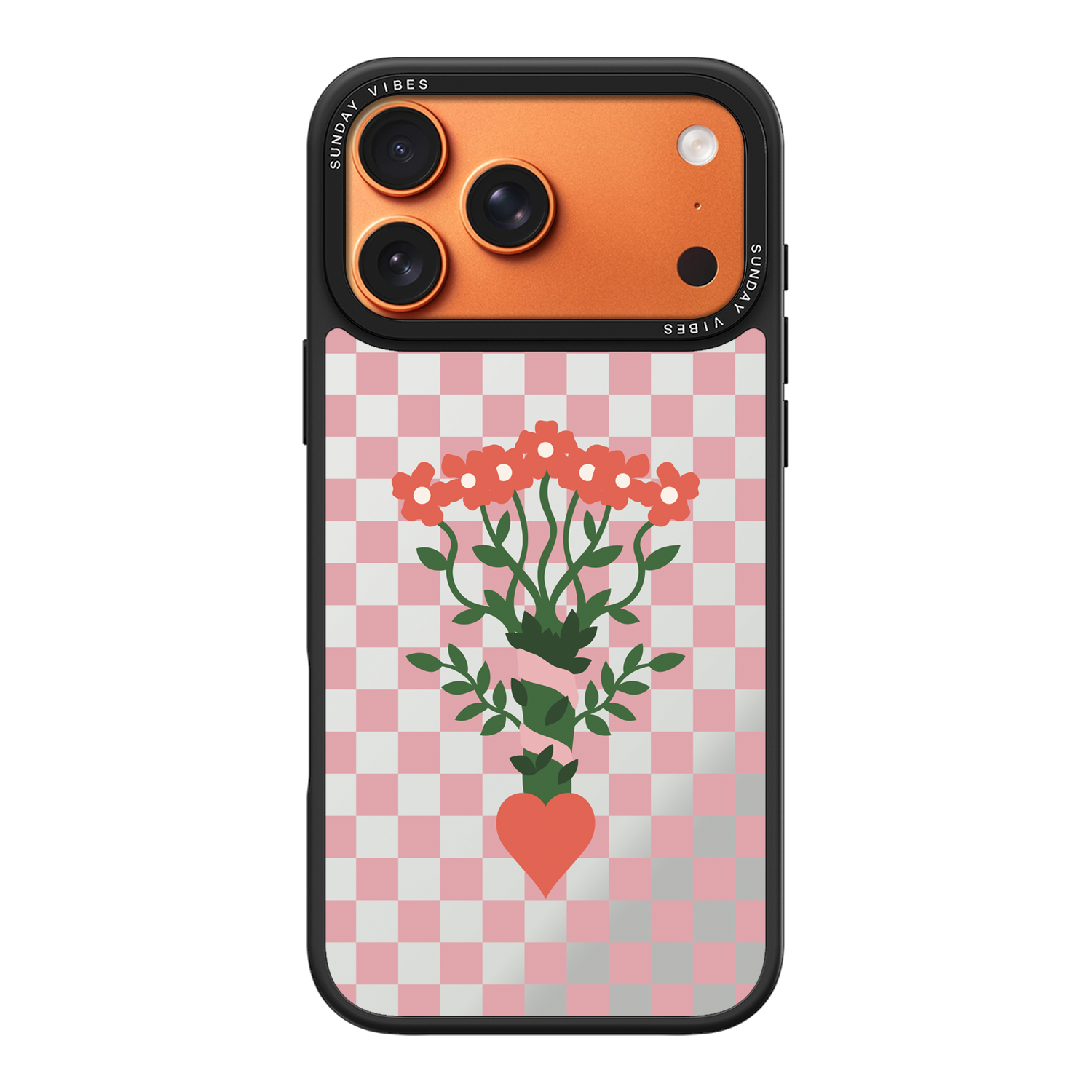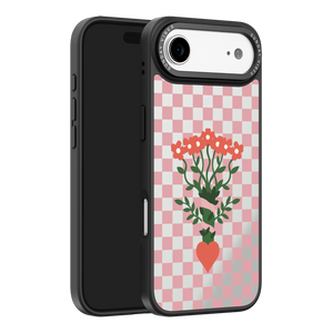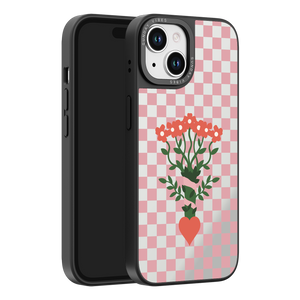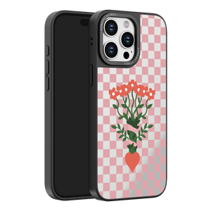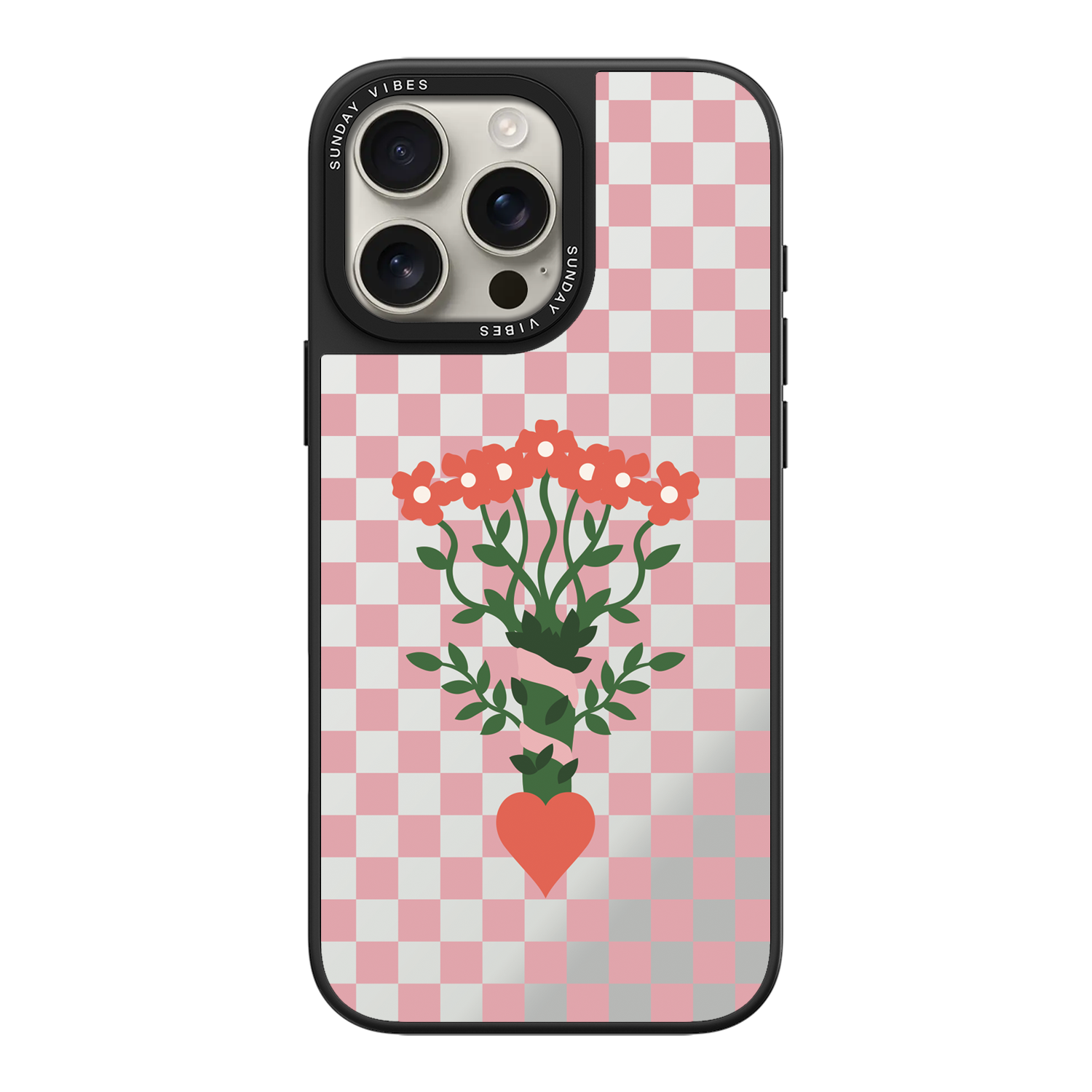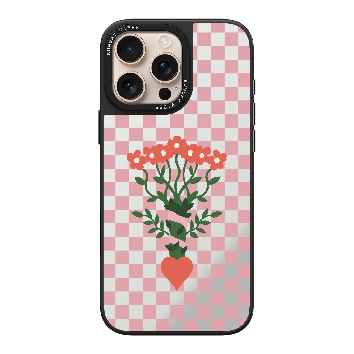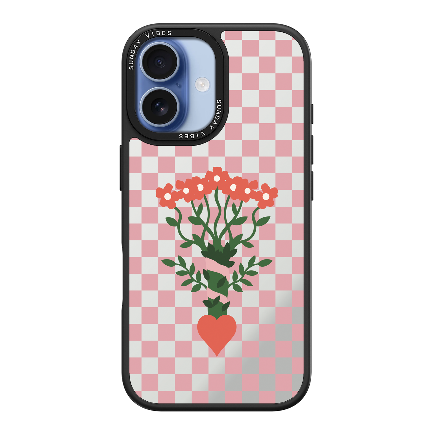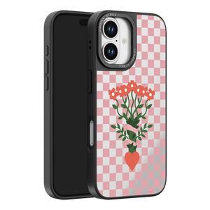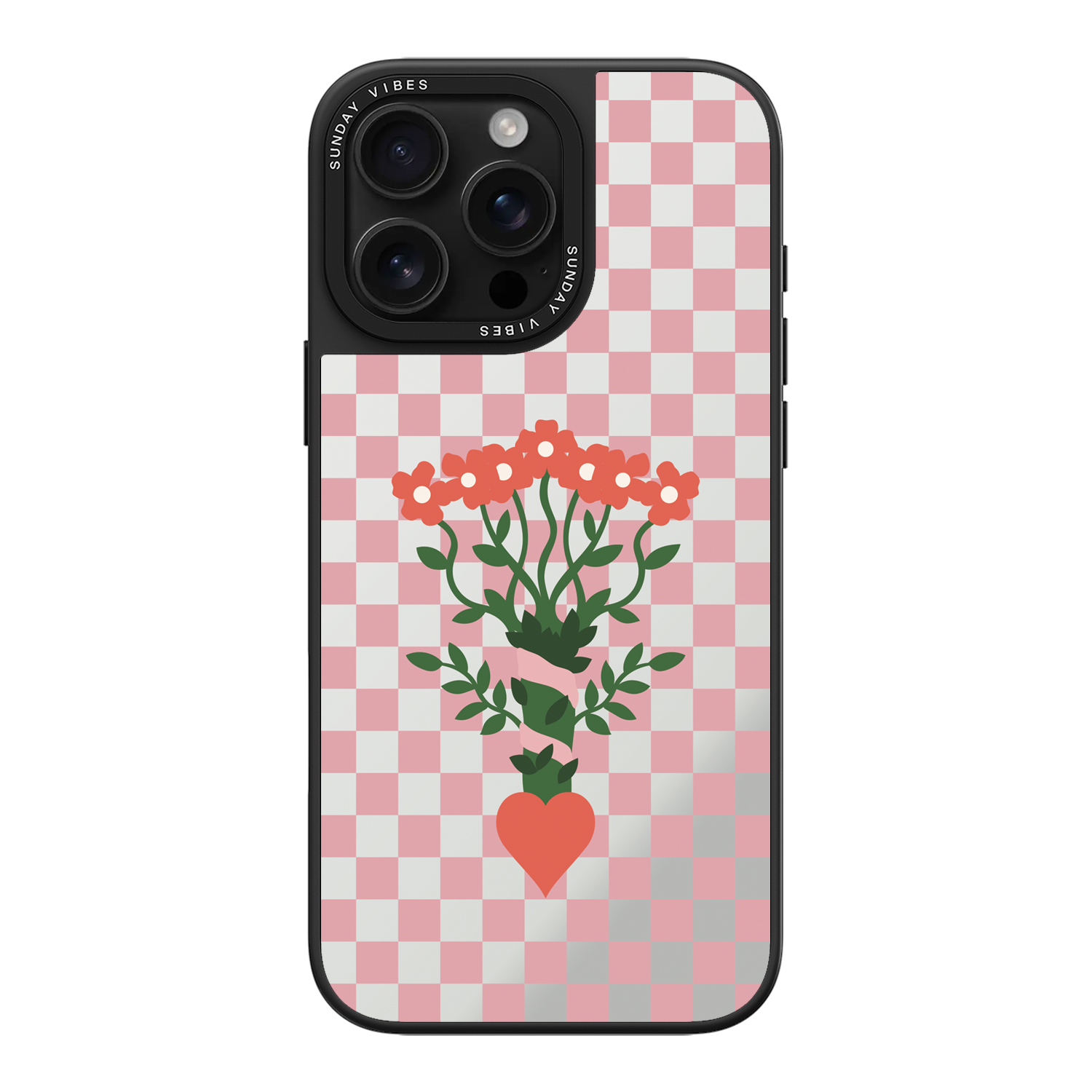 Adorn your device with the bold, romantic glamour of the Love Check iPhone Case. This striking design features a central illustration of a vibrant floral bouquet tied with a heart, set against a dazzling pink and silver checkerboard mirror backing. This unique fusion of sweetness and graphic boldness ensures you are always ready for a quick style check or selfie. The vibrant print and texture are applied directly onto the mirror surface for maximum visual impact.