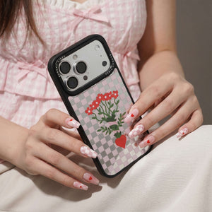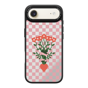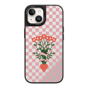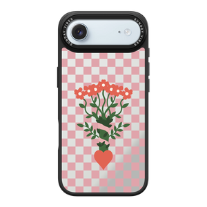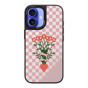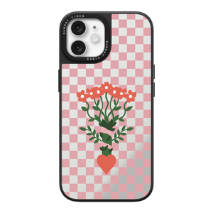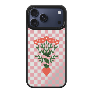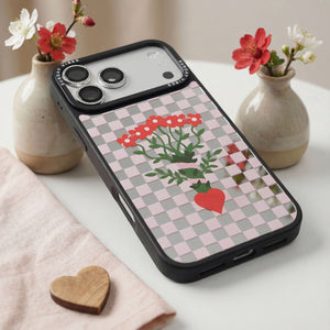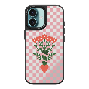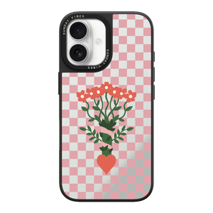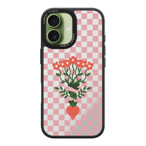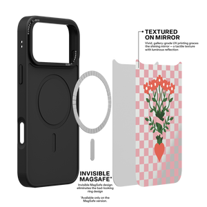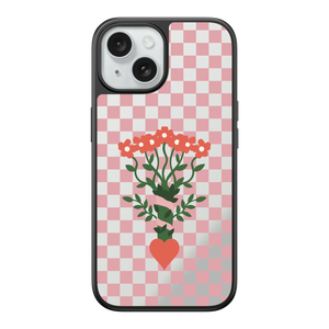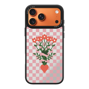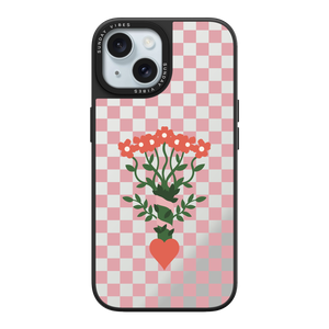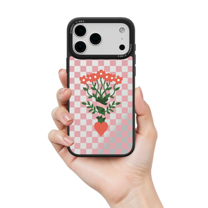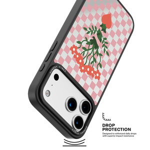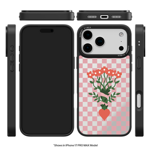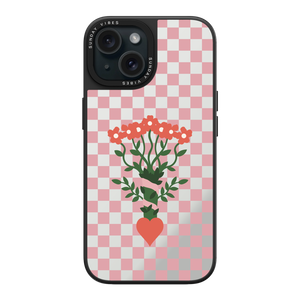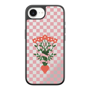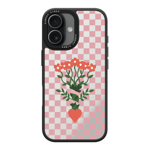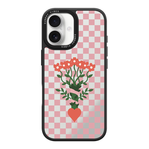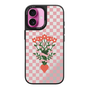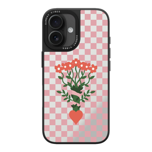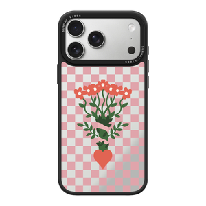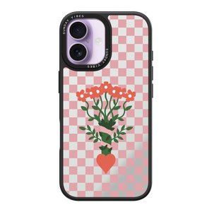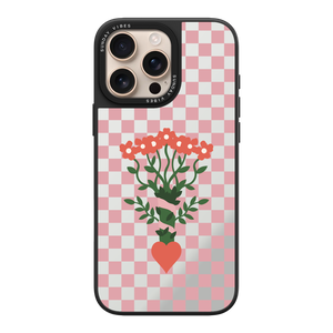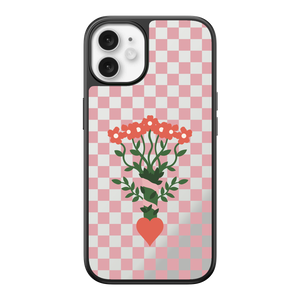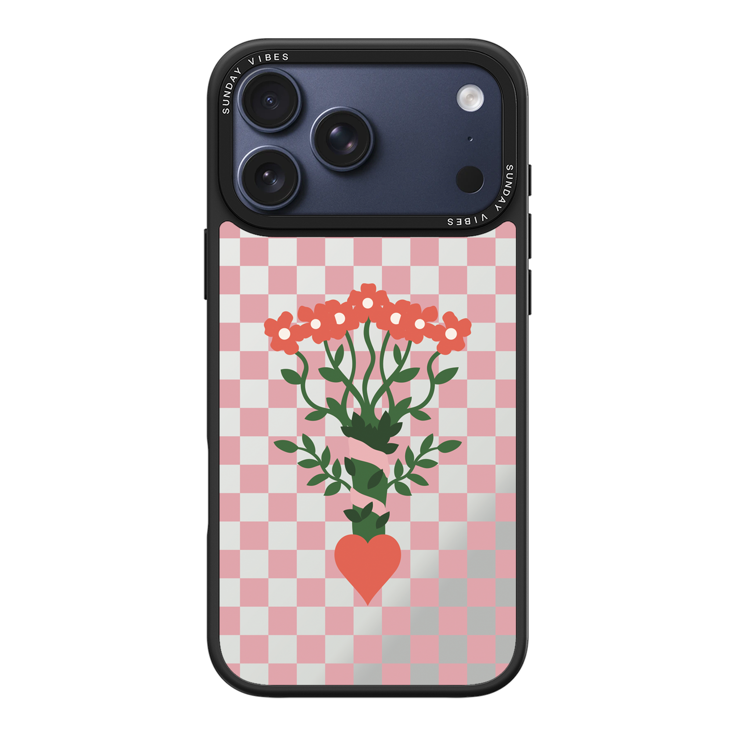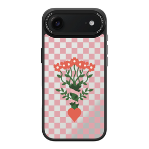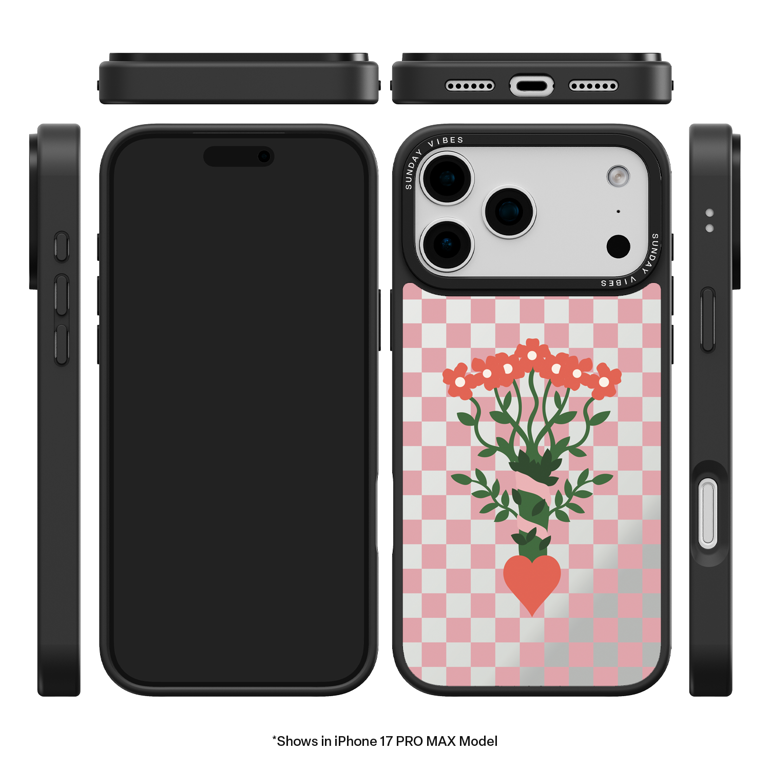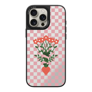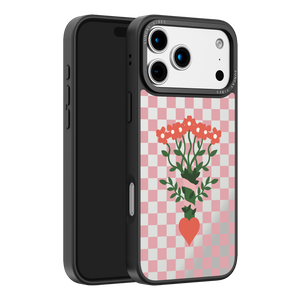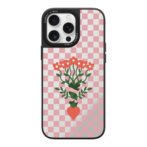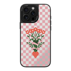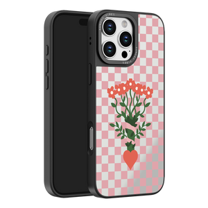 Adorn your device with the bold, romantic glamour of the Love Check iPhone Case. This striking design features a central illustration of a vibrant floral bouquet tied with a heart, set against a dazzling pink and silver checkerboard mirror backing. This unique fusion of sweetness and graphic boldness ensures you are always ready for a quick style check or selfie. The vibrant print and texture are applied directly onto the mirror surface for maximum visual impact.