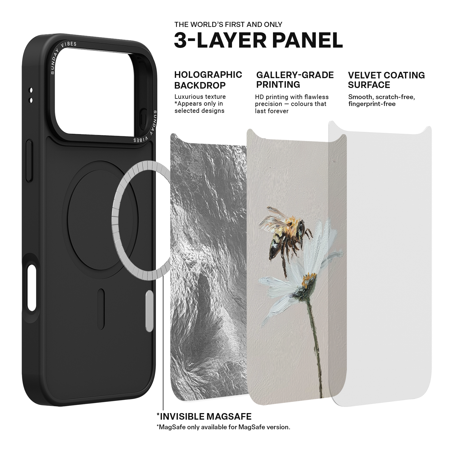Our globally pioneering three‑layer back panel technology combines: Laser‑textured base layer – adds depth and dimensionality to the design (effects may vary depending on artwork). Ultra‑high‑definition gallery‑grade print layer – delivers vivid, lifelike colours and striking detail. Velvet skin‑feel protective coating – provides scratch resistance and fingerprint protection while offering a soft, refined touch.