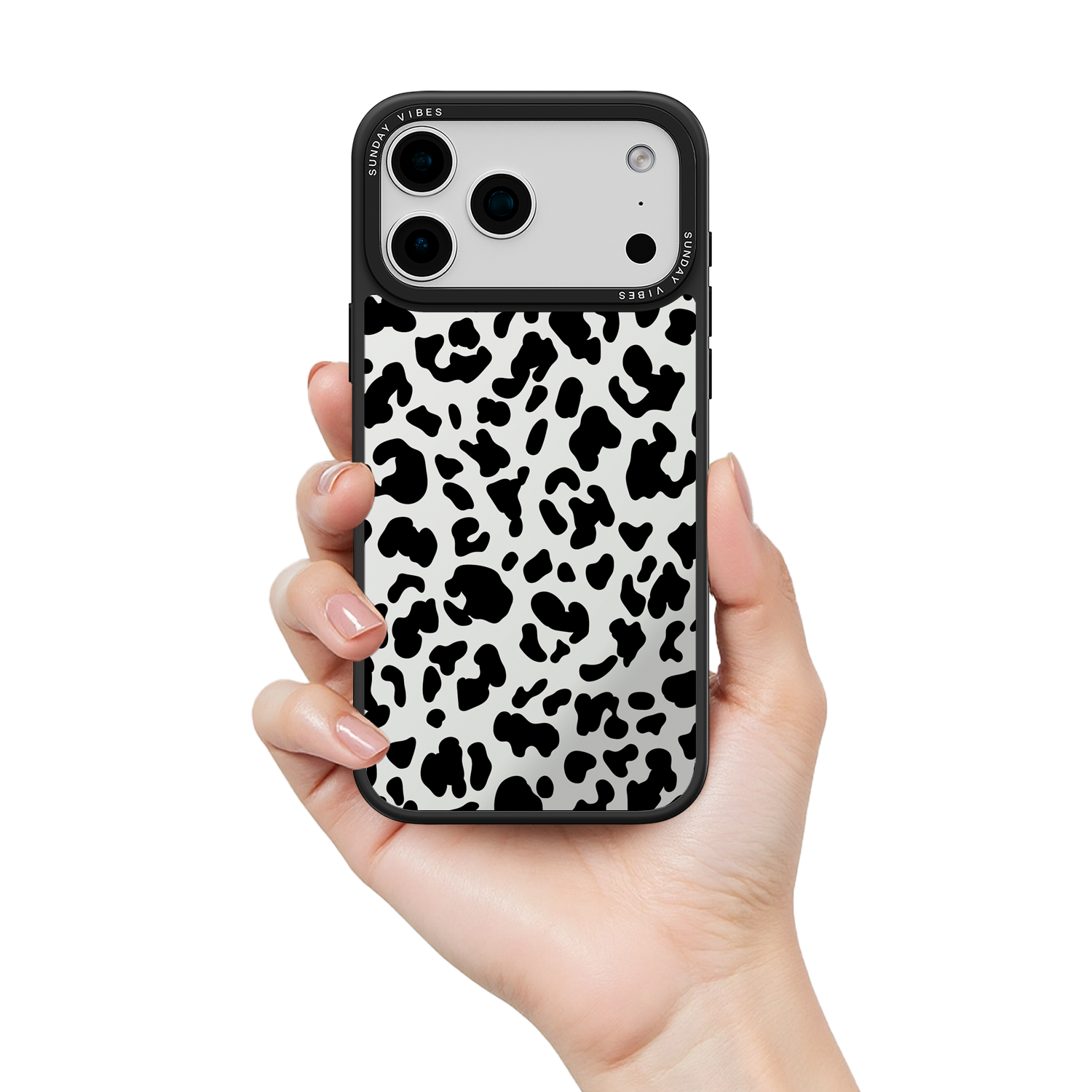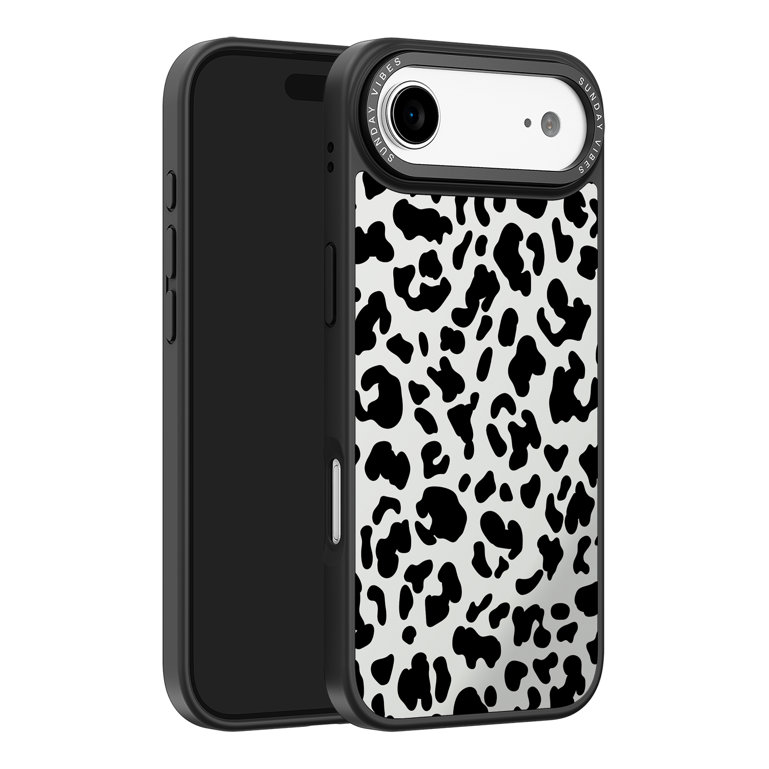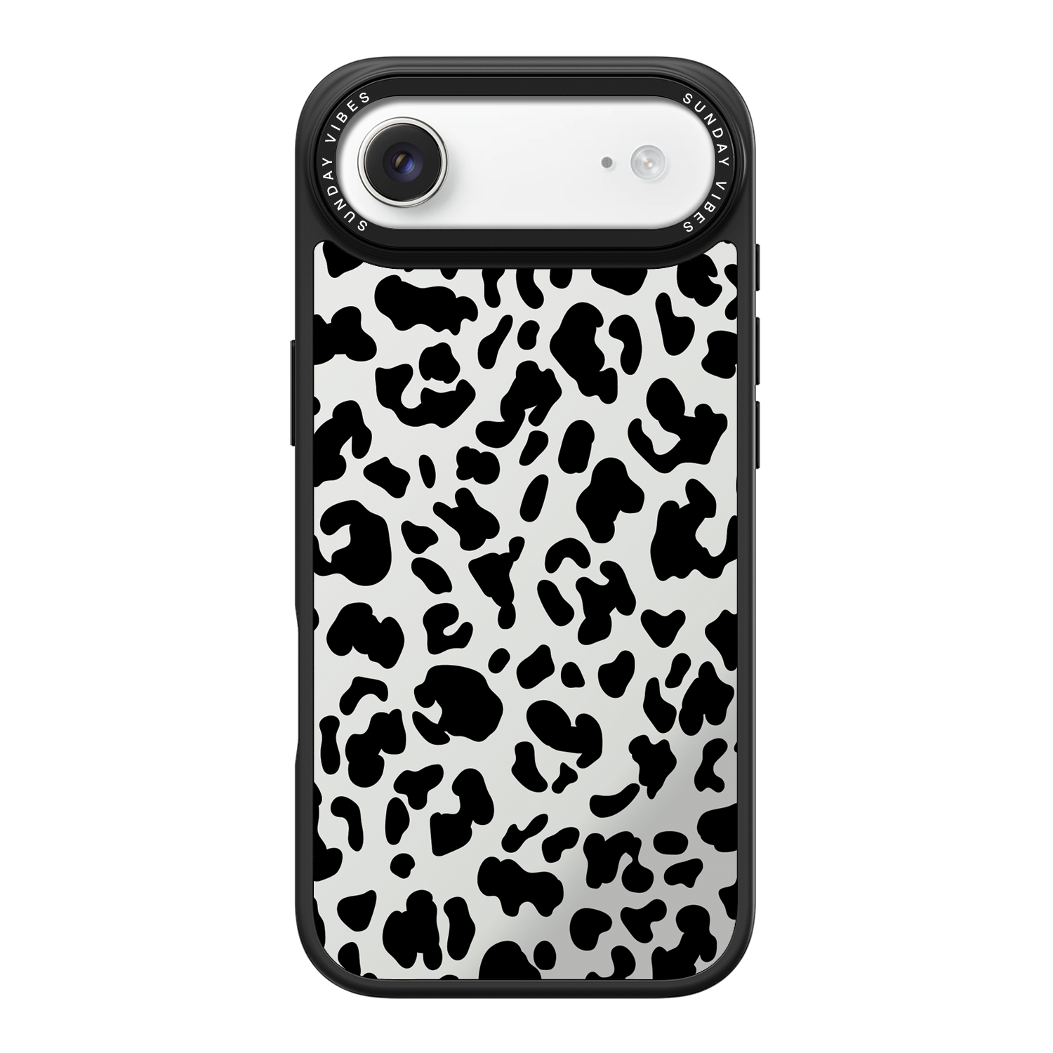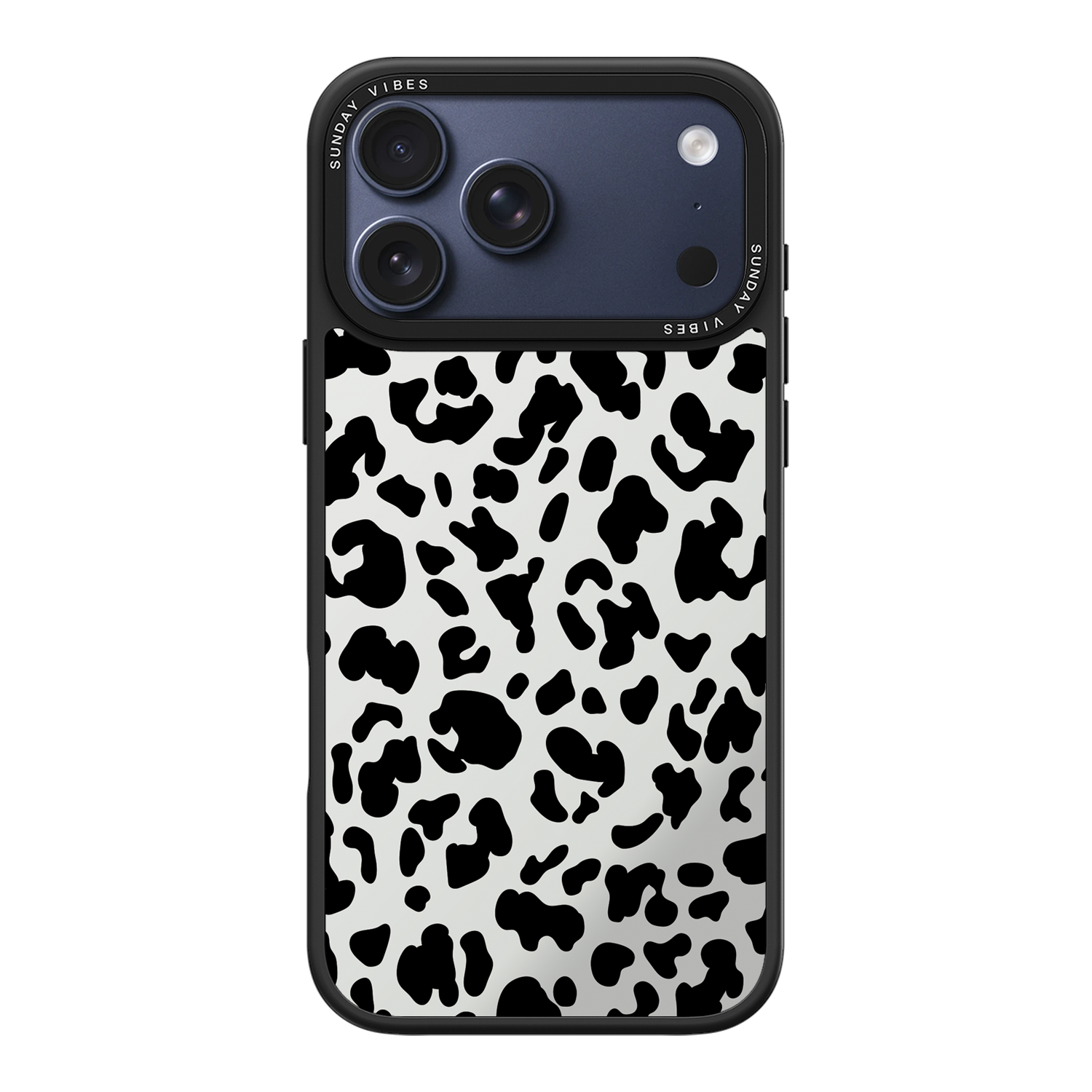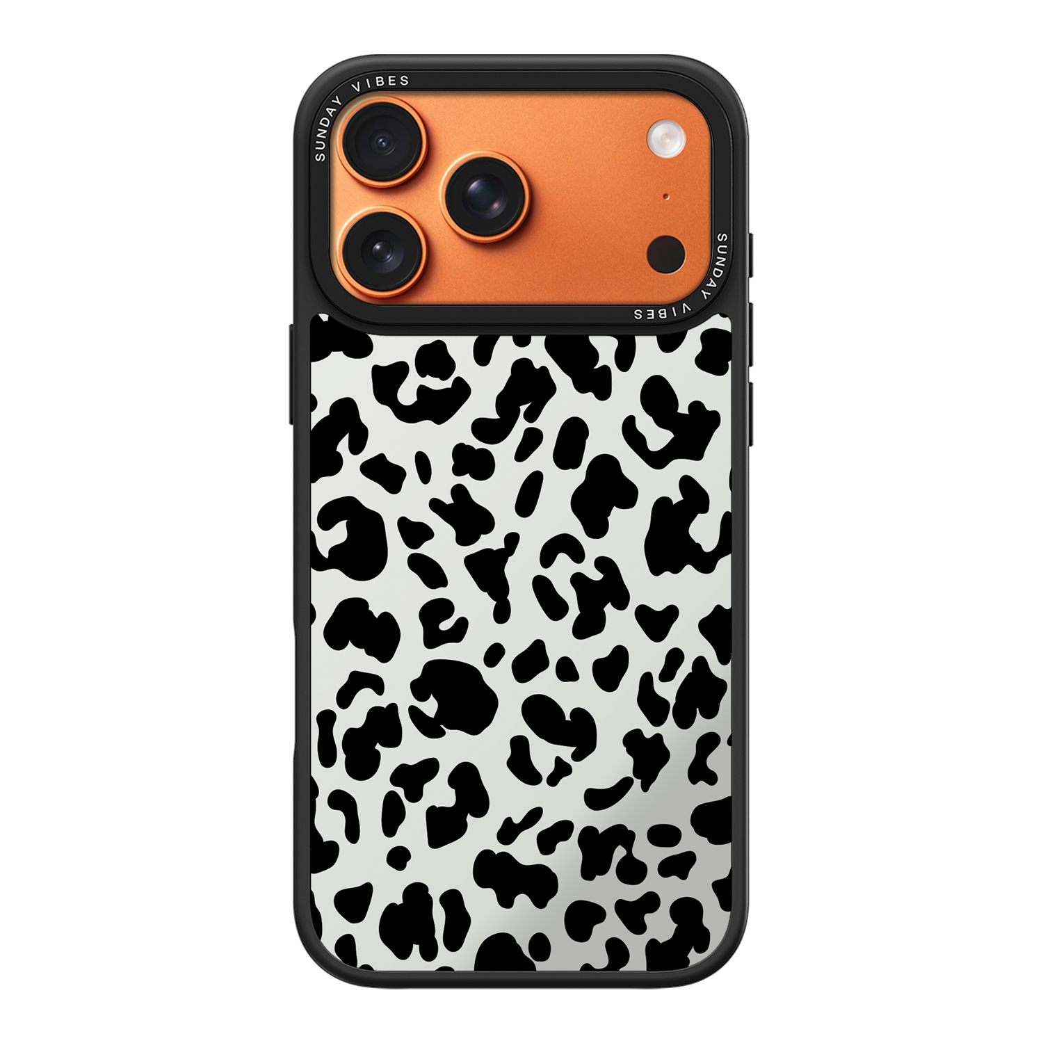 Adorn your device with the bold, quirky glamour of the Moo-dy Chic iPhone Case. This striking design features an abstract black-and-white print reminiscent of cow spots, set against a highly reflective, functional mirror backing. This fun, high-contrast aesthetic ensures you are always ready for a quick style check or selfie. The vibrant print and texture are applied directly onto the mirror surface for maximum visual impact.