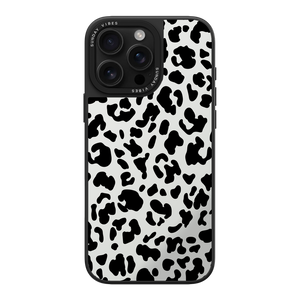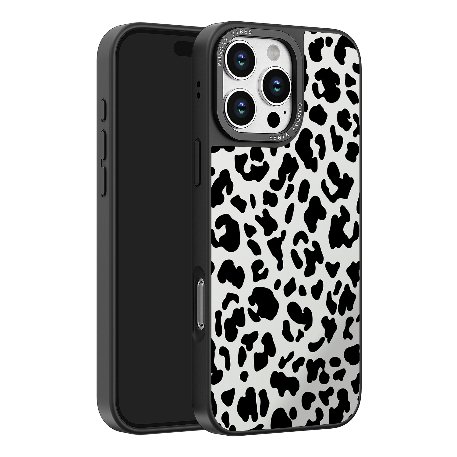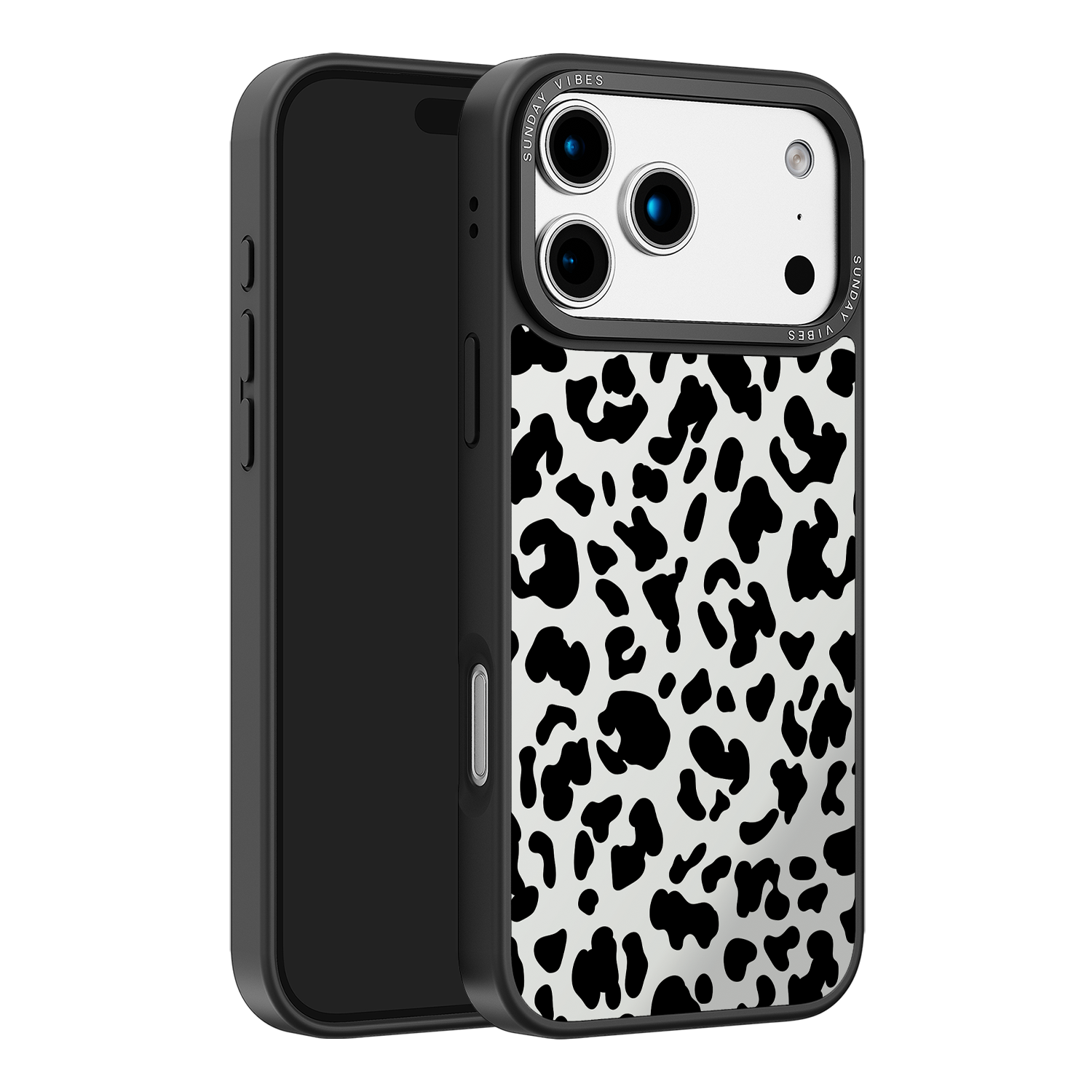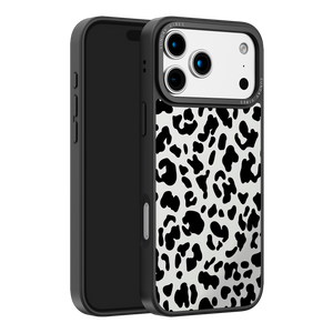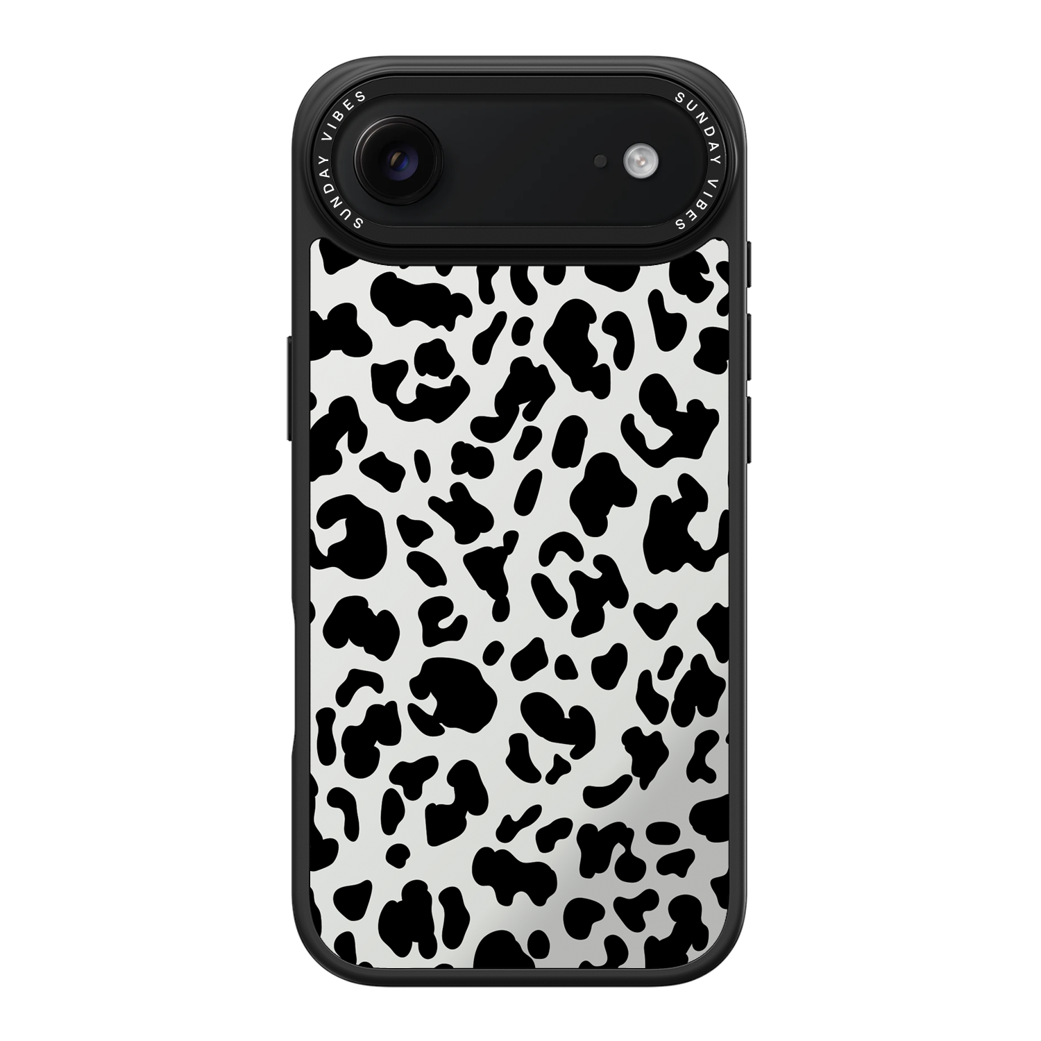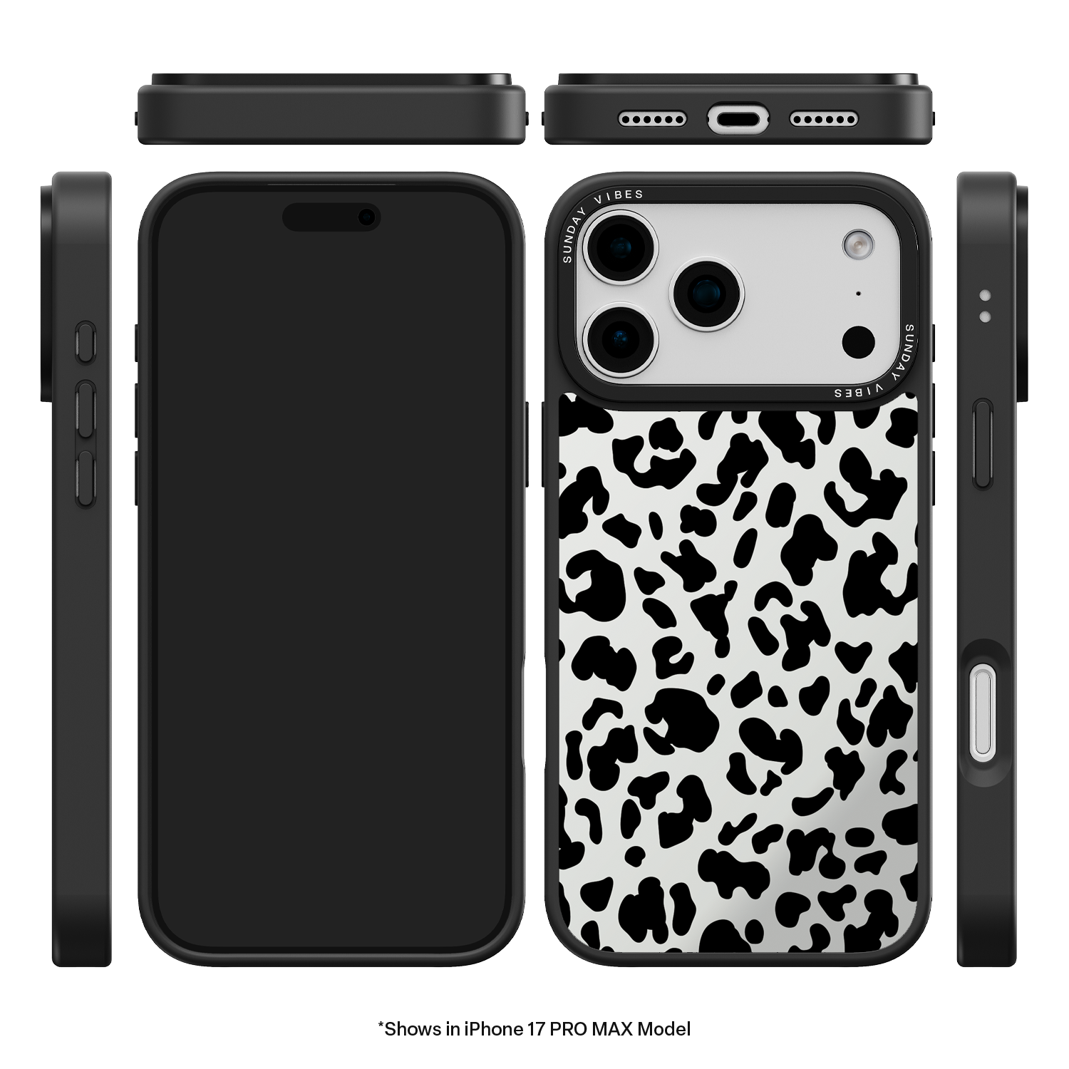 Adorn your device with the bold, quirky glamour of the Moo-dy Chic iPhone Case. This striking design features an abstract black-and-white print reminiscent of cow spots, set against a highly reflective, functional mirror backing. This fun, high-contrast aesthetic ensures you are always ready for a quick style check or selfie. The vibrant print and texture are applied directly onto the mirror surface for maximum visual impact.