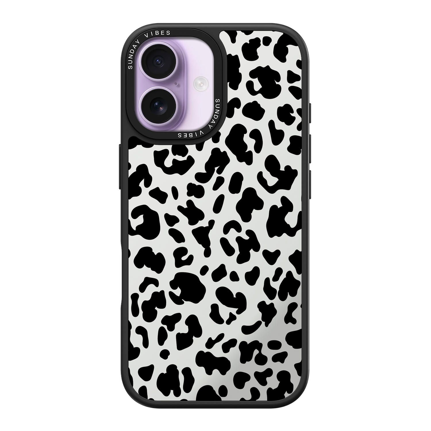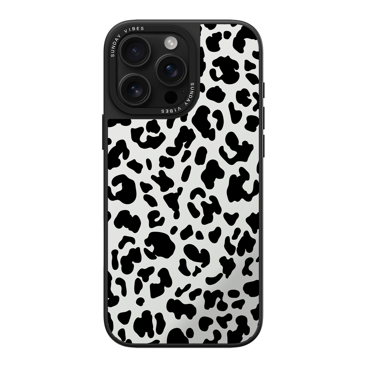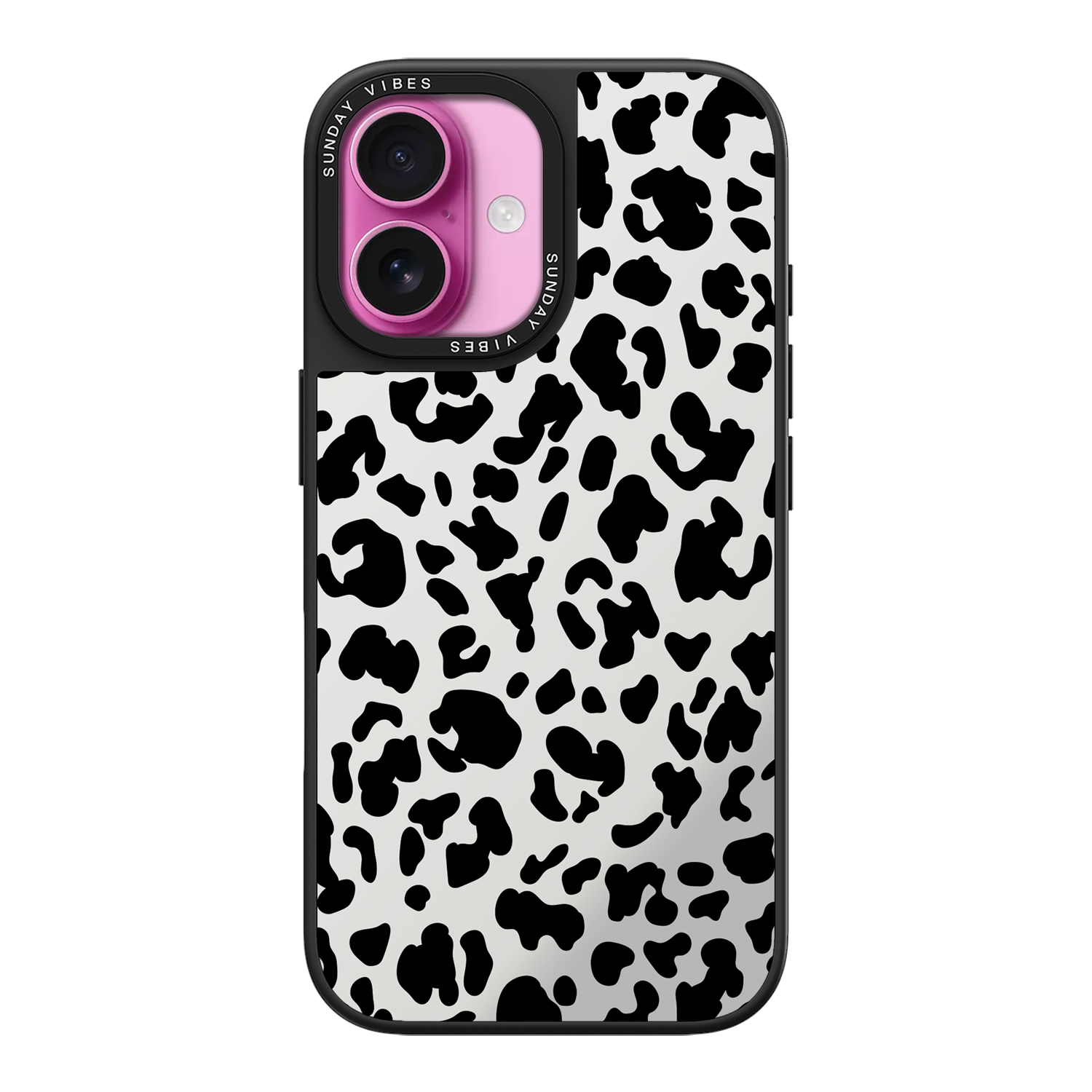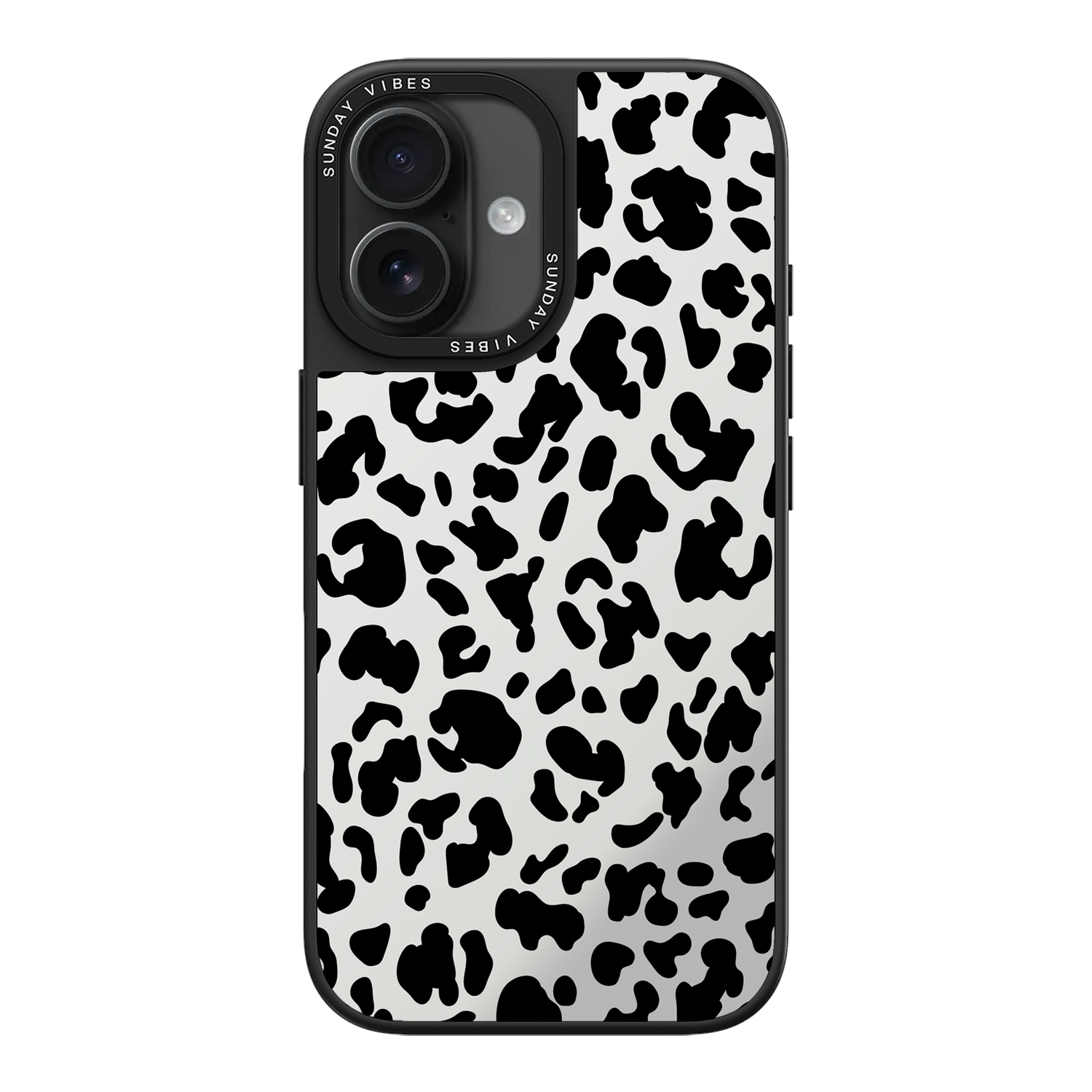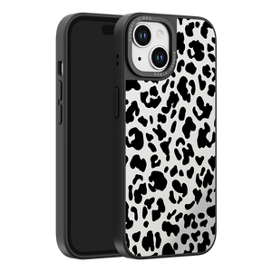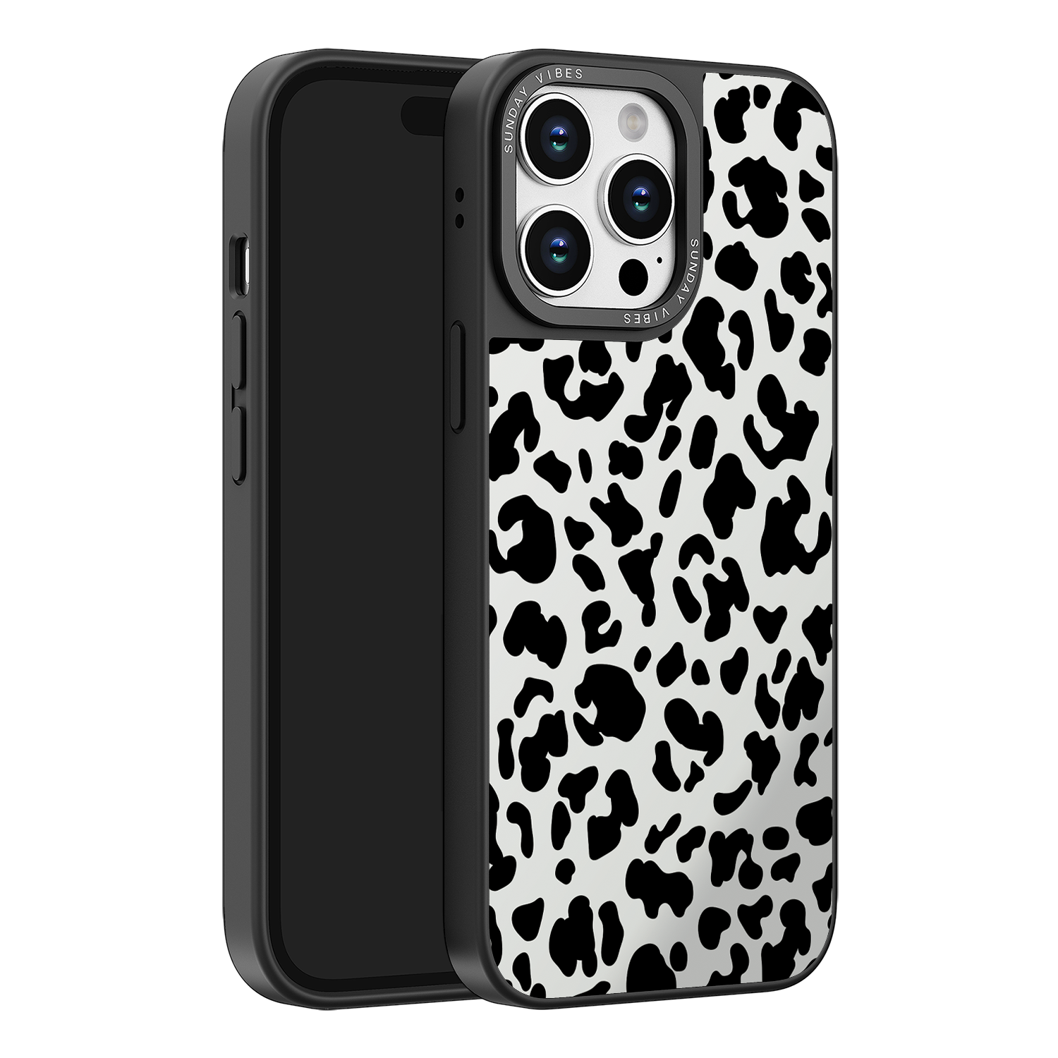Adorn your device with the bold, quirky glamour of the Moo-dy Chic iPhone Case. This striking design features an abstract black-and-white print reminiscent of cow spots, set against a highly reflective, functional mirror backing. This fun, high-contrast aesthetic ensures you are always ready for a quick style check or selfie. The vibrant print and texture are applied directly onto the mirror surface for maximum visual impact.