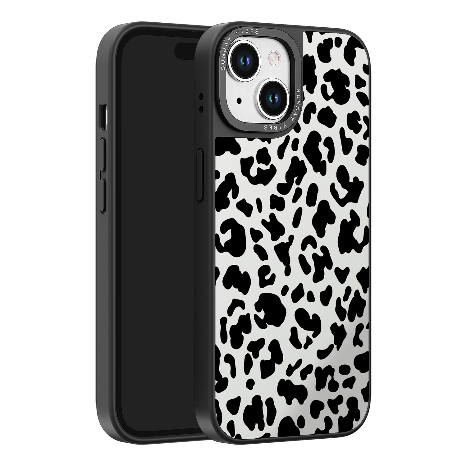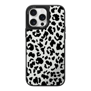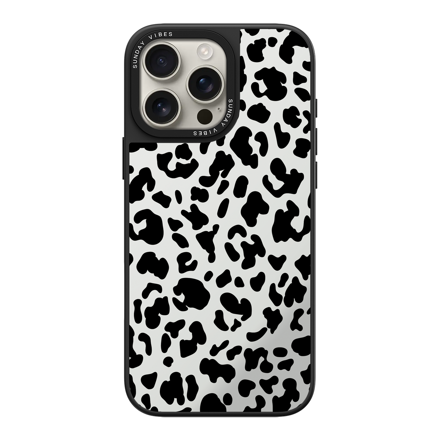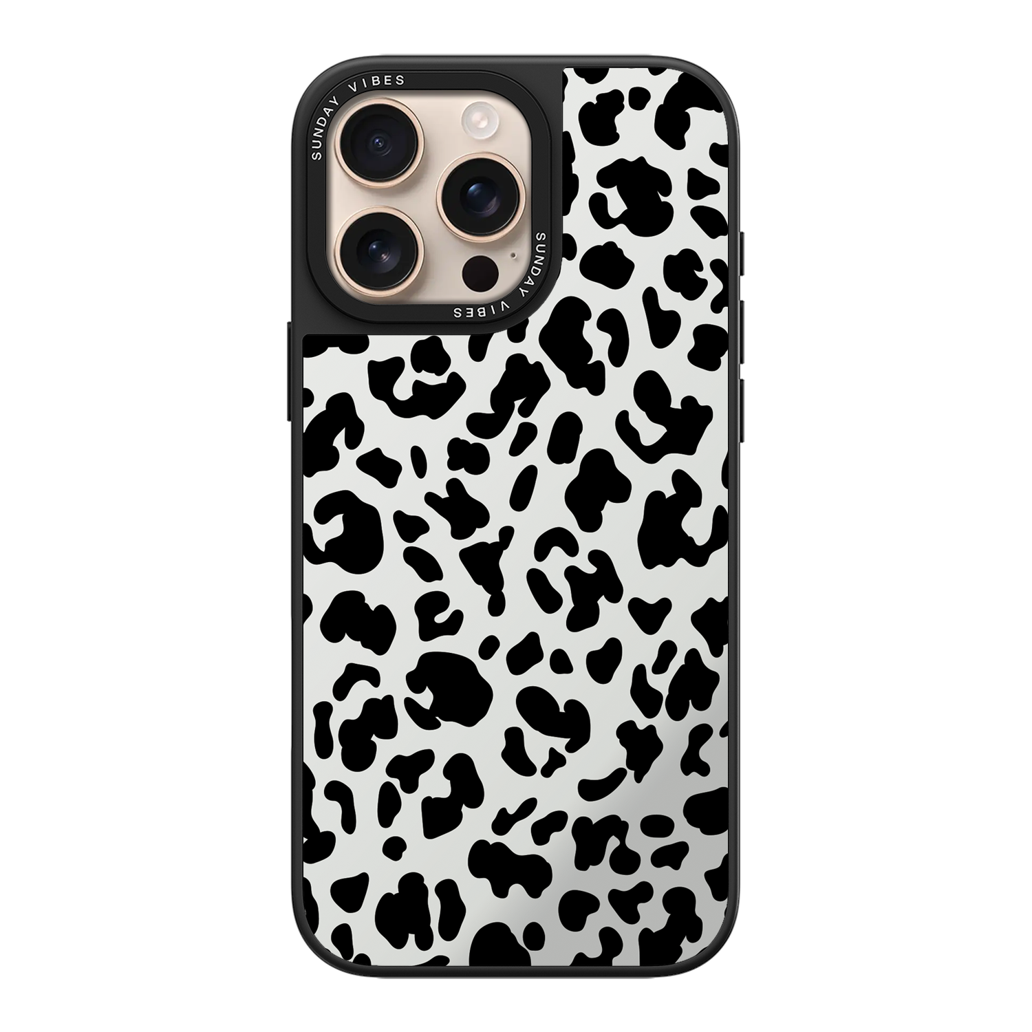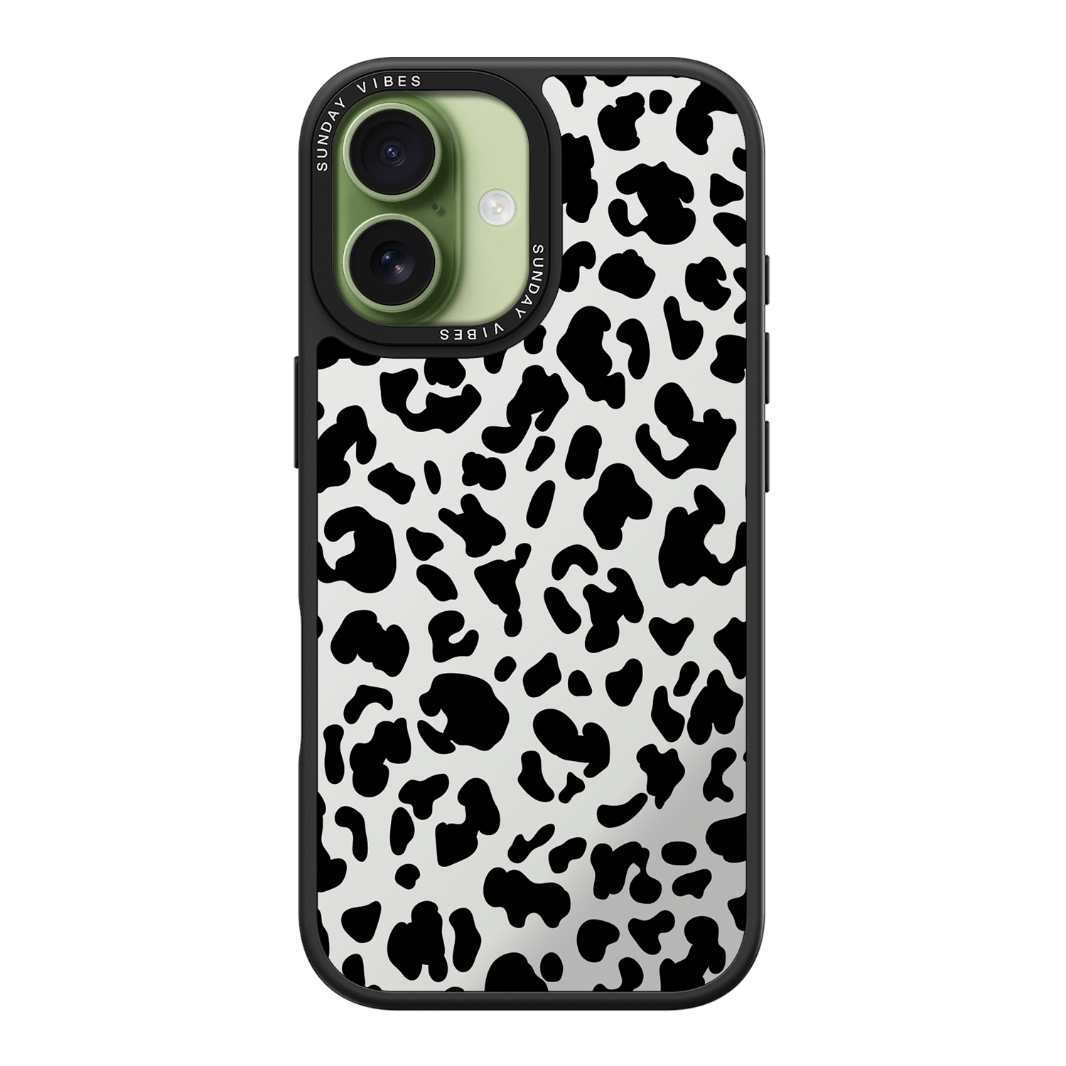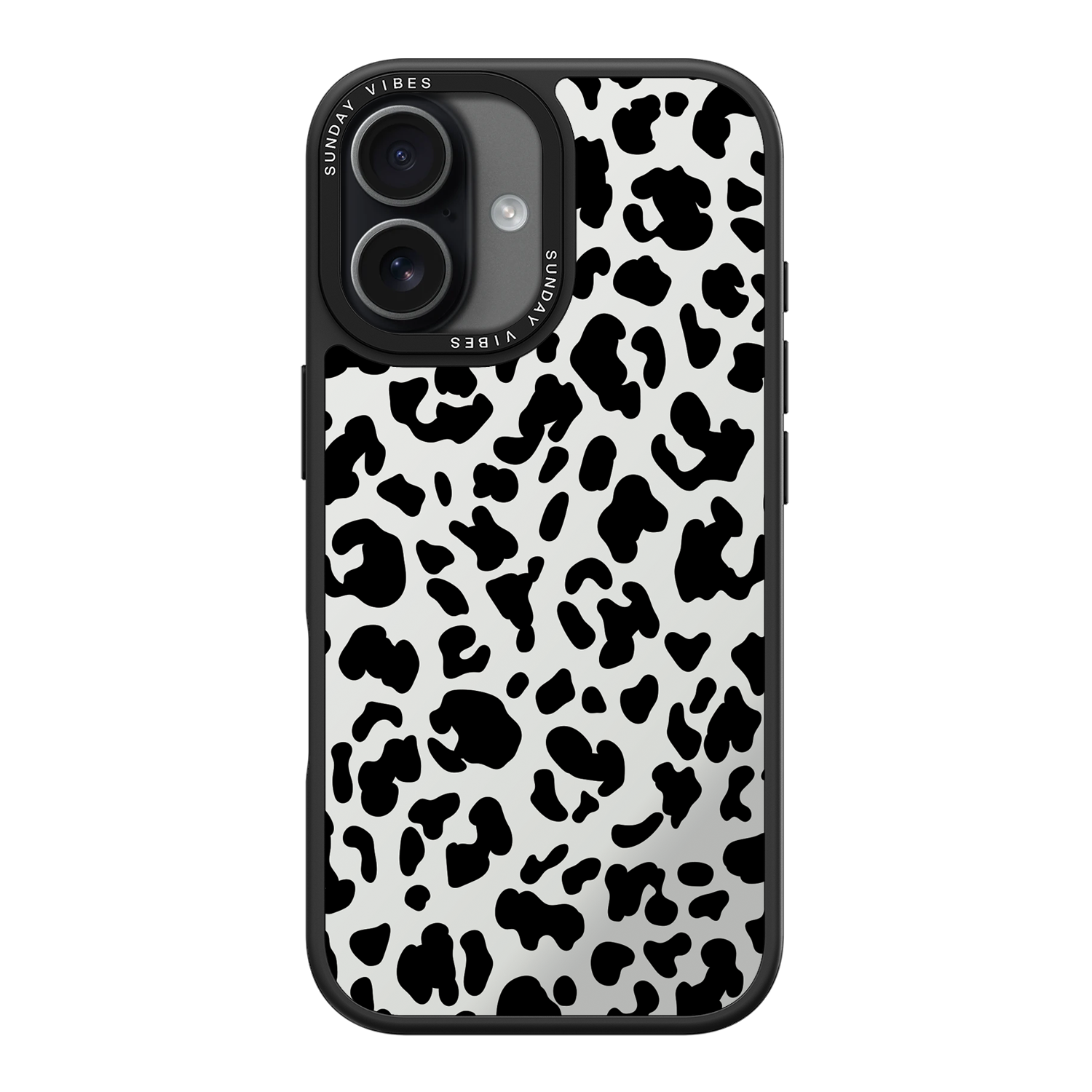 Adorn your device with the bold, quirky glamour of the Moo-dy Chic iPhone Case. This striking design features an abstract black-and-white print reminiscent of cow spots, set against a highly reflective, functional mirror backing. This fun, high-contrast aesthetic ensures you are always ready for a quick style check or selfie. The vibrant print and texture are applied directly onto the mirror surface for maximum visual impact.
