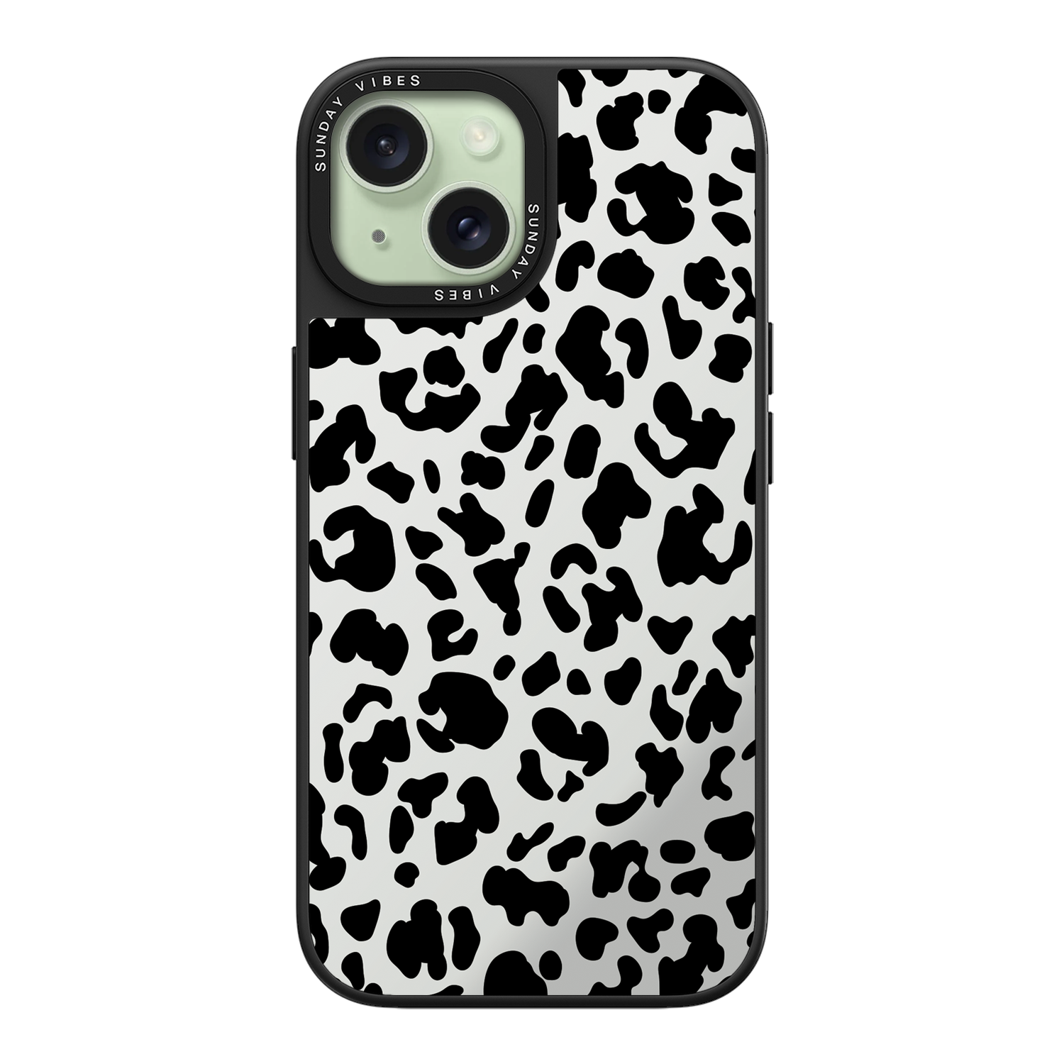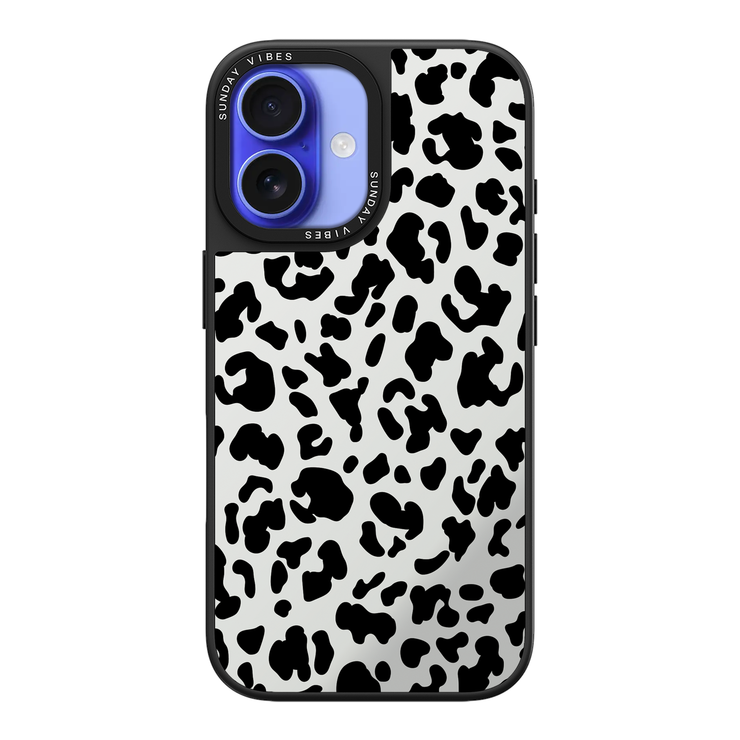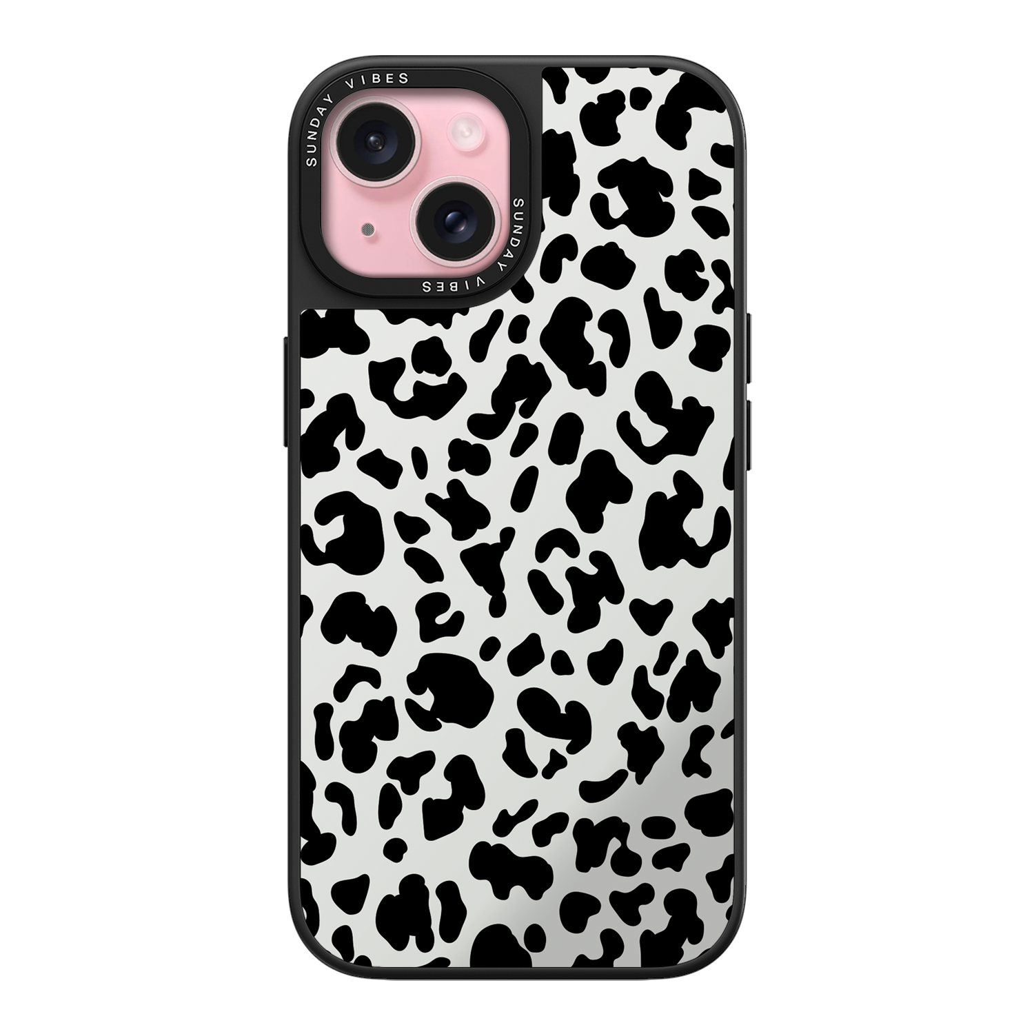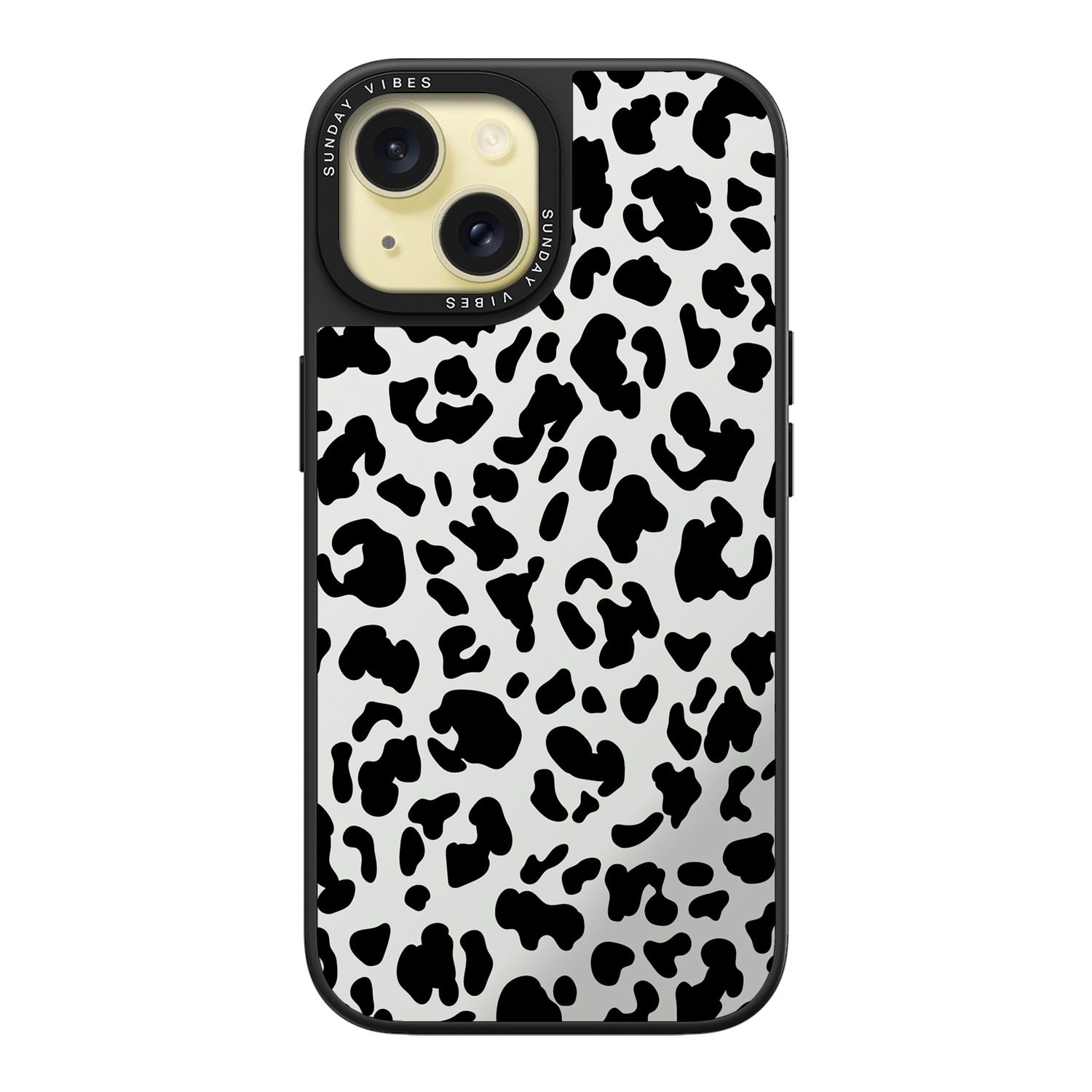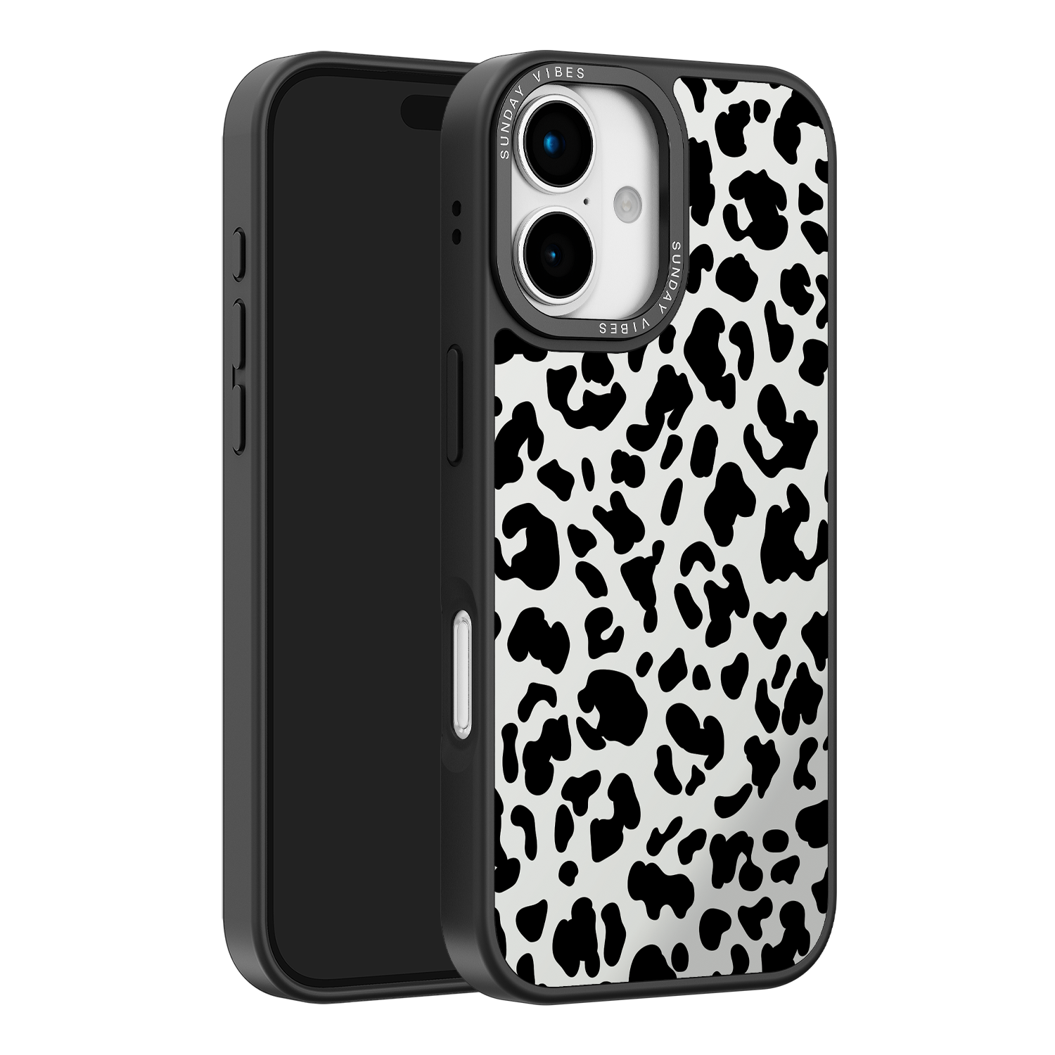 Adorn your device with the bold, quirky glamour of the Moo-dy Chic iPhone Case. This striking design features an abstract black-and-white print reminiscent of cow spots, set against a highly reflective, functional mirror backing. This fun, high-contrast aesthetic ensures you are always ready for a quick style check or selfie. The vibrant print and texture are applied directly onto the mirror surface for maximum visual impact.