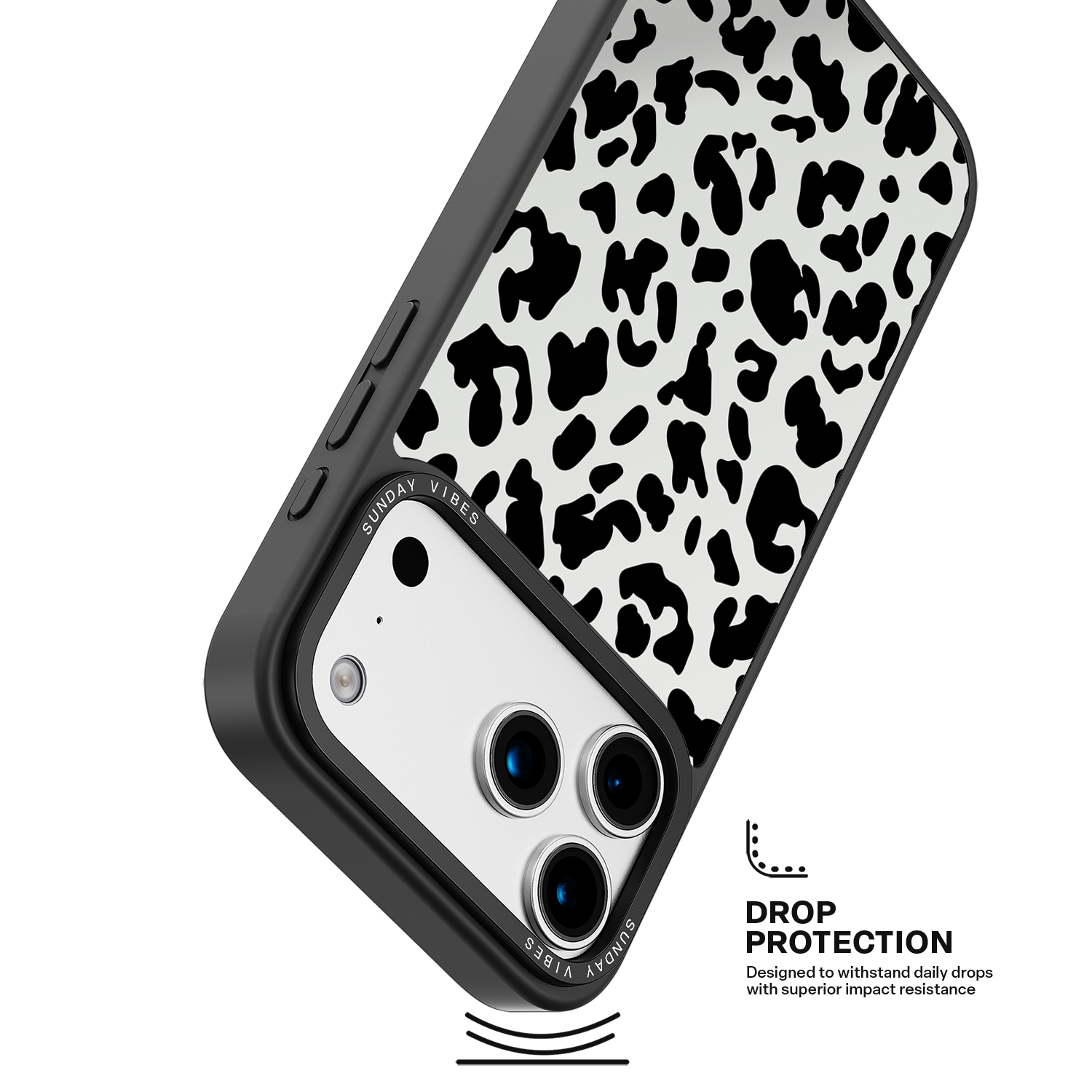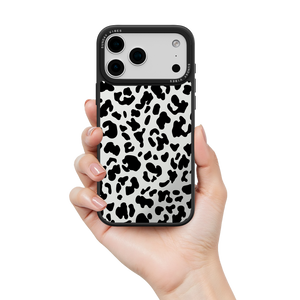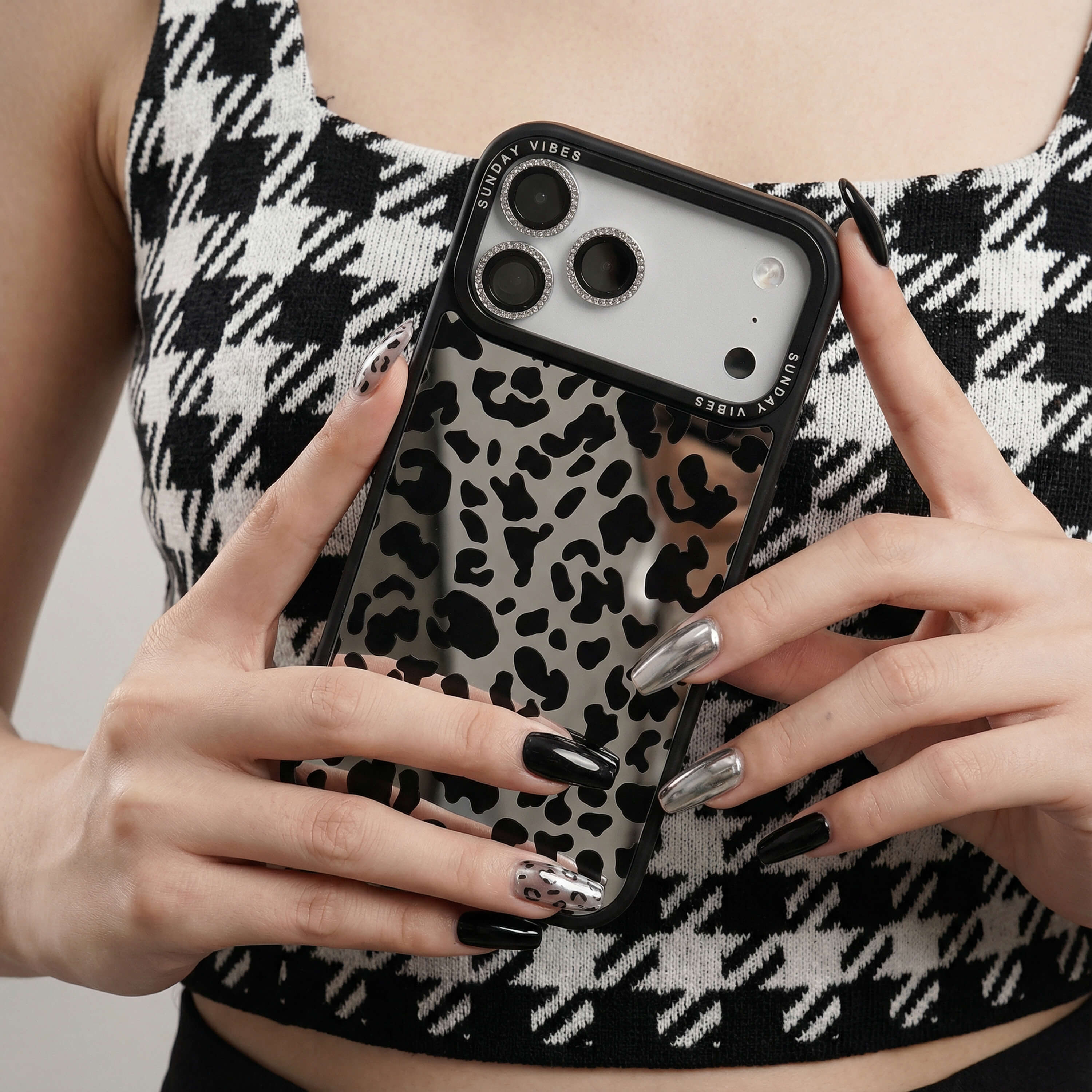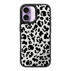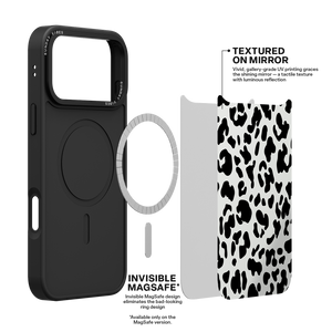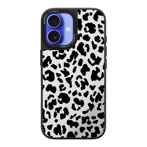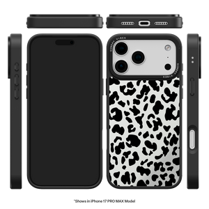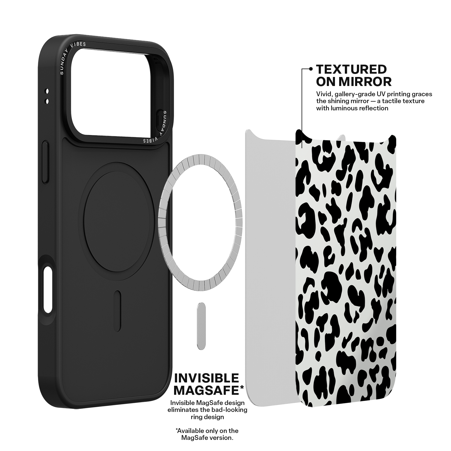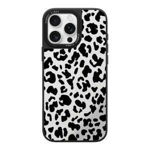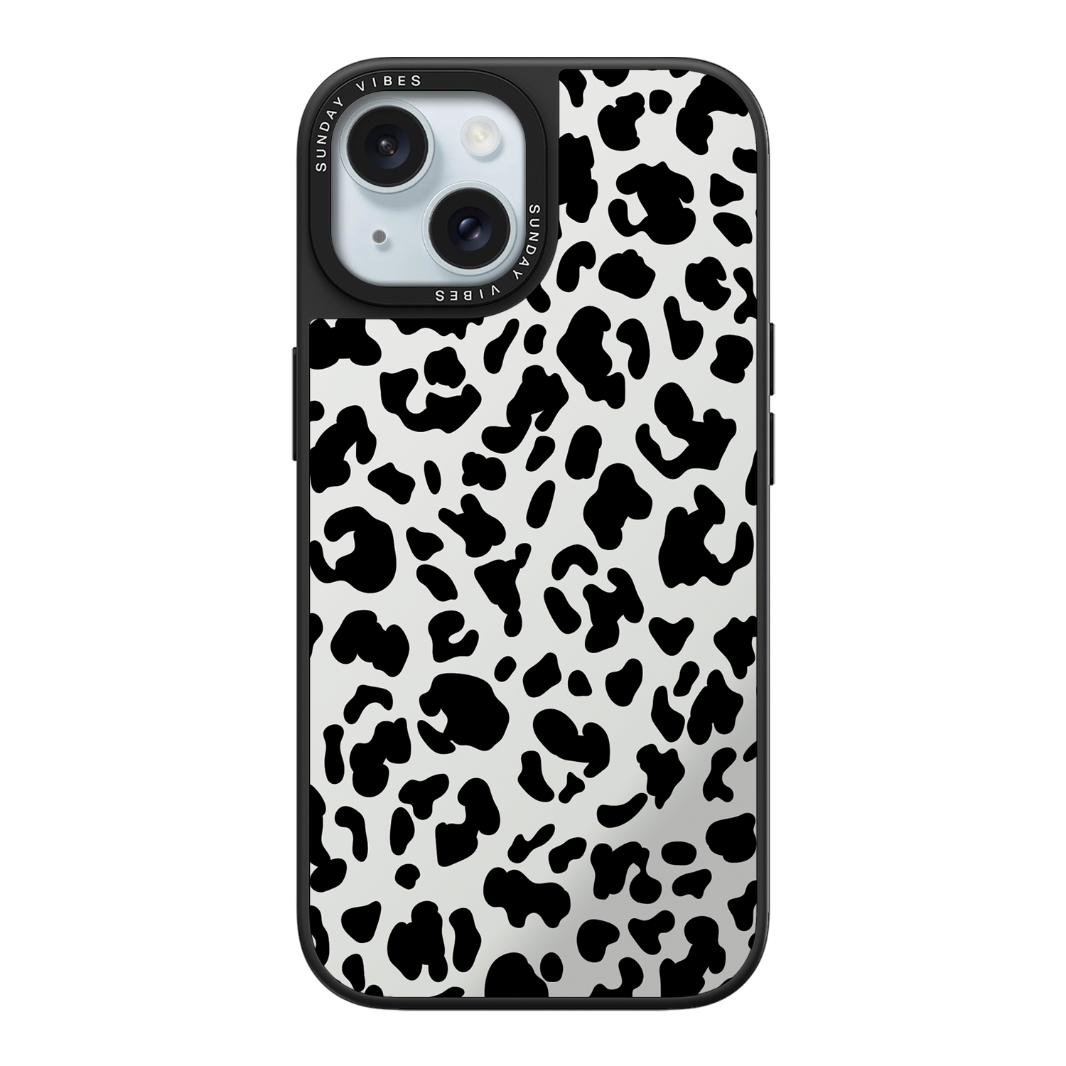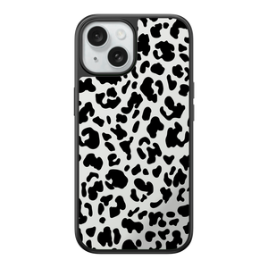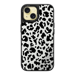 Adorn your device with the bold, quirky glamour of the Moo-dy Chic iPhone Case. This striking design features an abstract black-and-white print reminiscent of cow spots, set against a highly reflective, functional mirror backing. This fun, high-contrast aesthetic ensures you are always ready for a quick style check or selfie. The vibrant print and texture are applied directly onto the mirror surface for maximum visual impact.