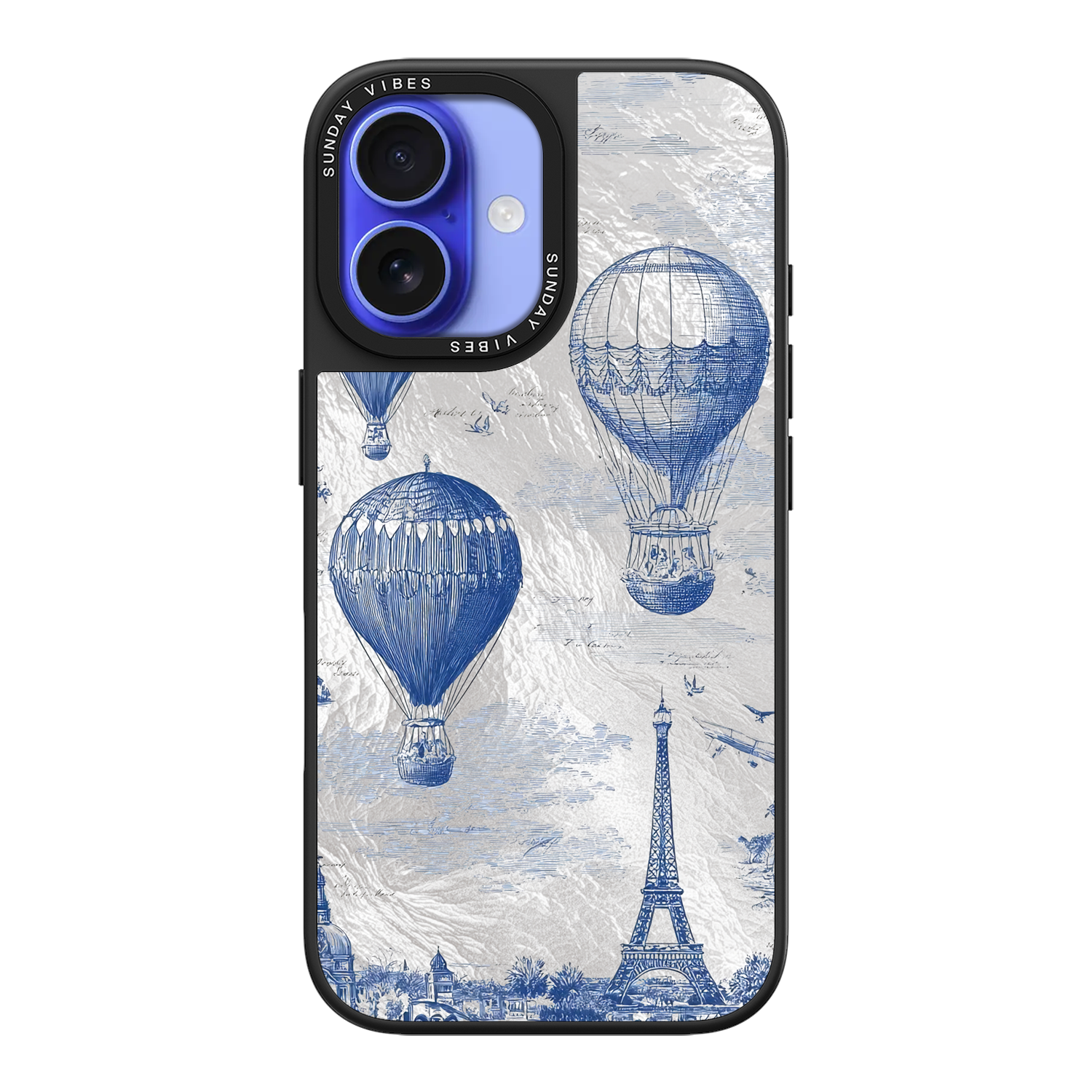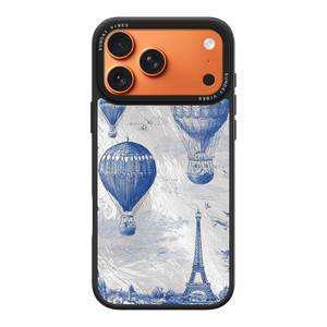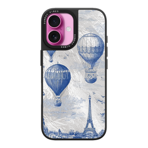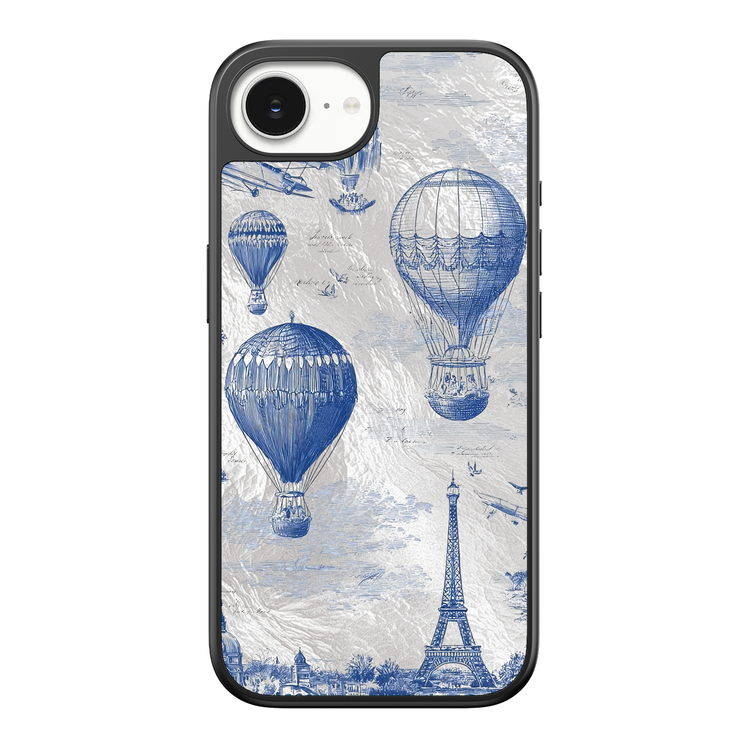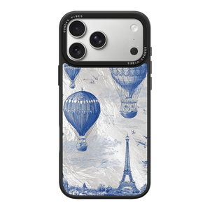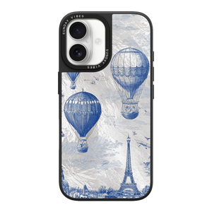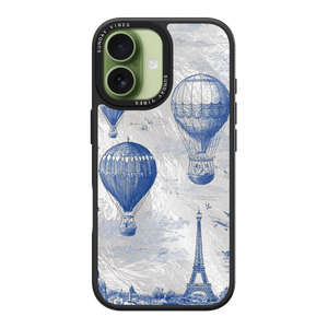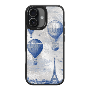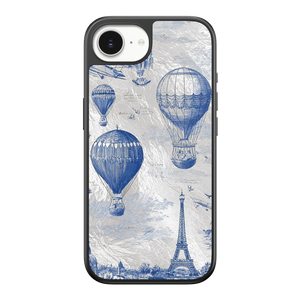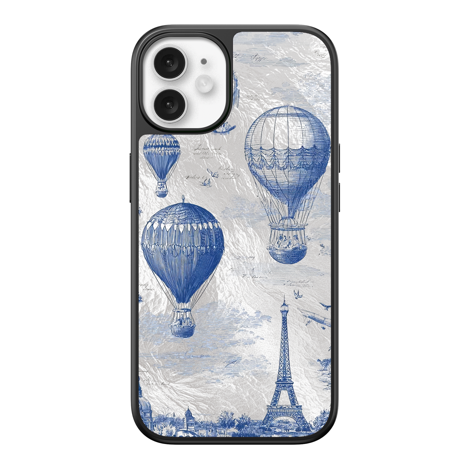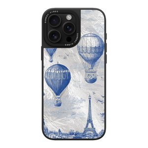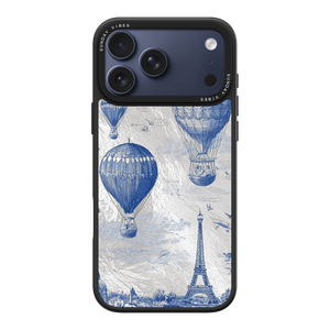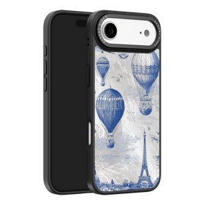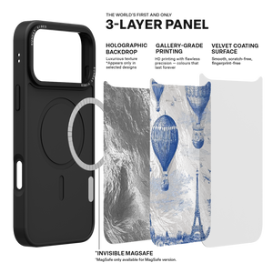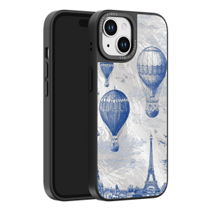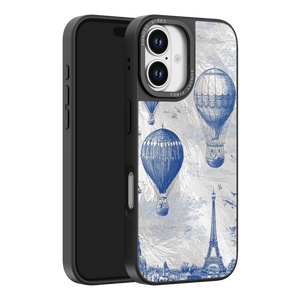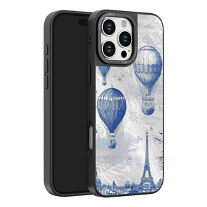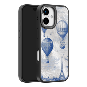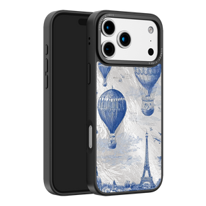 Step into the timeless romance of travel with the Paris Dreams iPhone Case. This exquisite design showcases a detailed blue toile print of hot air balloons drifting above the Parisian skyline, instantly transporting you to the City of Light. The stunning imagery is set against a dramatically textured, silver holographic background that shimmers and shifts, perfectly blending old-world elegance with a contemporary metallic aesthetic. The case's structural integrity is delivered via a premium 3-layer back panel: featuring a base holographic layer with texture, a middle ultra HD gallery print layer, and a velvet smooth anti-scratch and anti-fingerprint top coating.