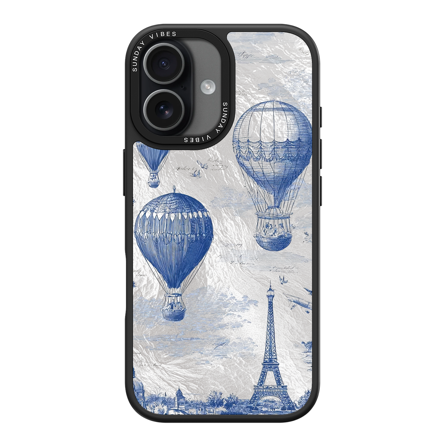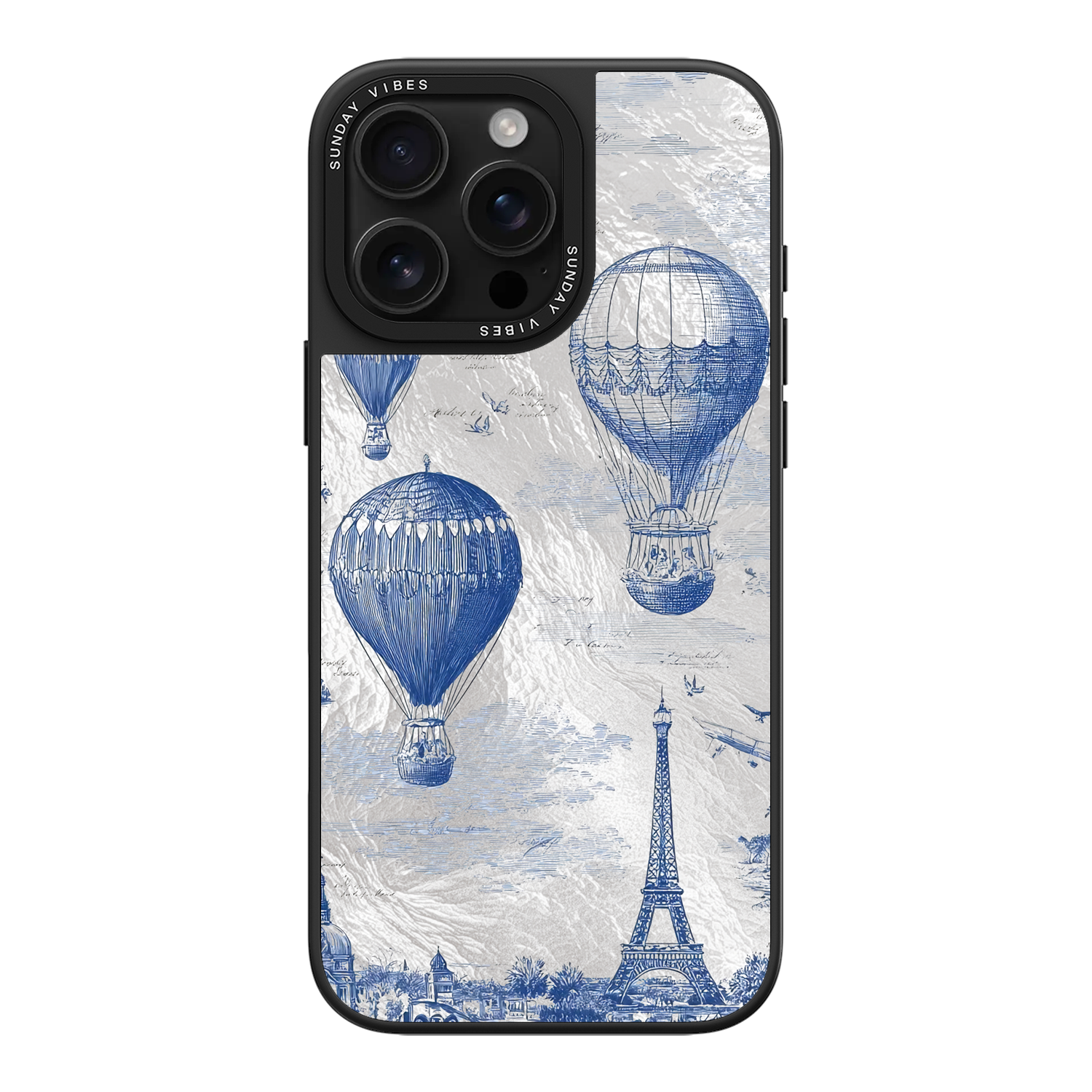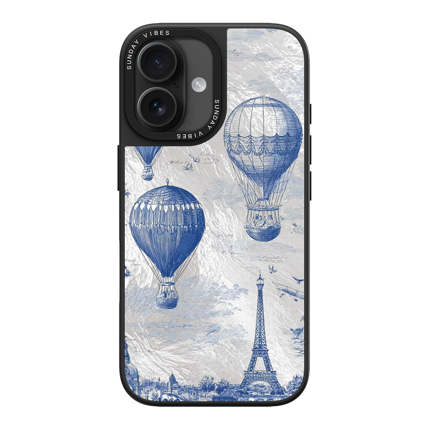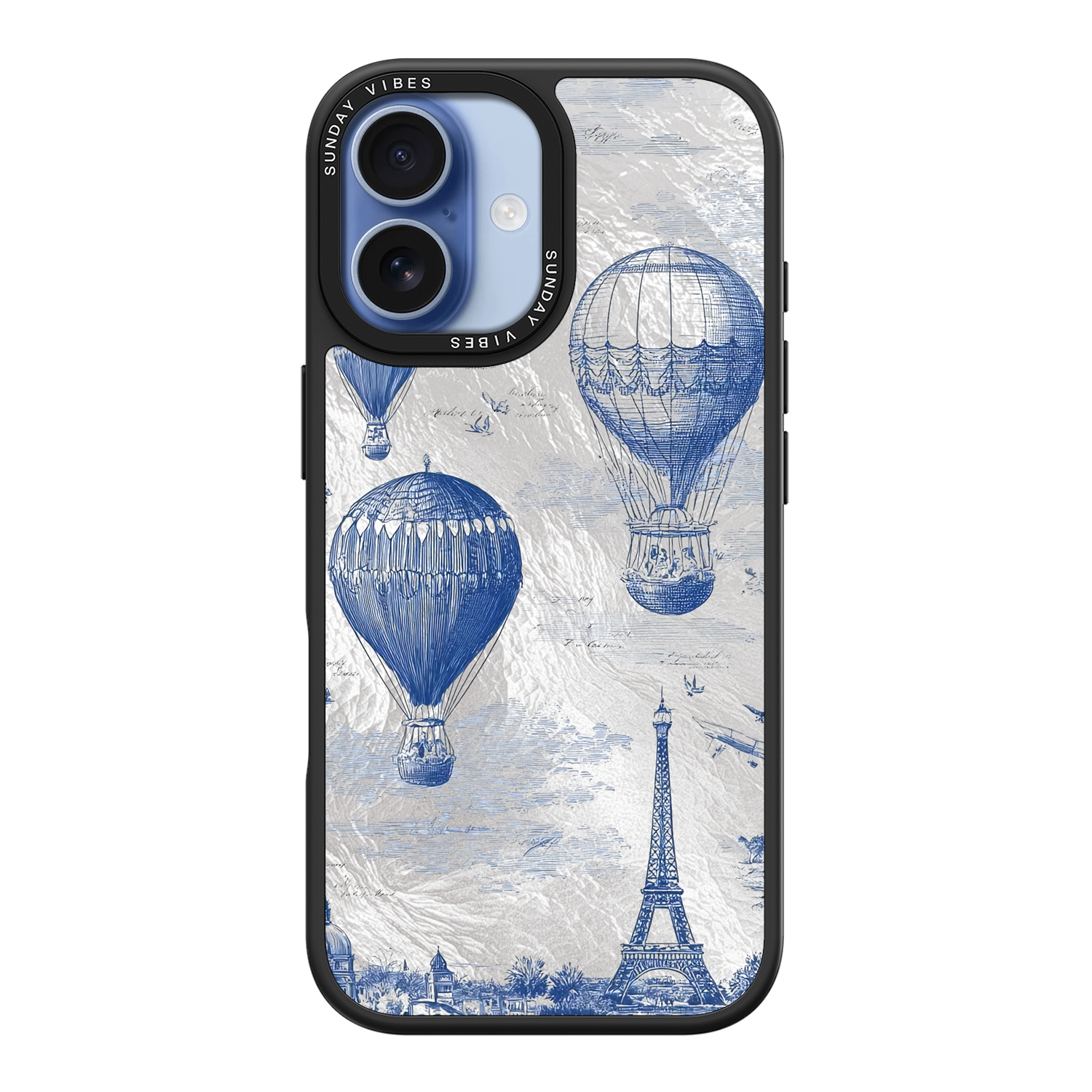 Step into the timeless romance of travel with the Paris Dreams iPhone Case. This exquisite design showcases a detailed blue toile print of hot air balloons drifting above the Parisian skyline, instantly transporting you to the City of Light. The stunning imagery is set against a dramatically textured, silver holographic background that shimmers and shifts, perfectly blending old-world elegance with a contemporary metallic aesthetic. The case's structural integrity is delivered via a premium 3-layer back panel: featuring a base holographic layer with texture, a middle ultra HD gallery print layer, and a velvet smooth anti-scratch and anti-fingerprint top coating.