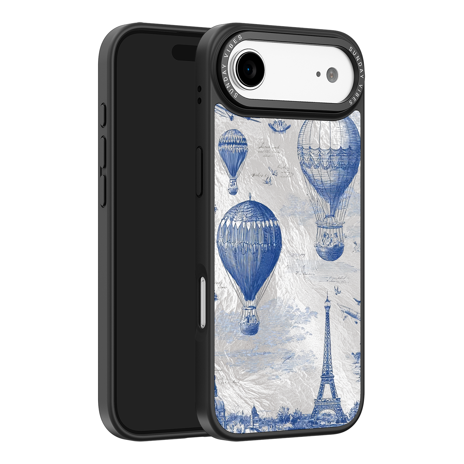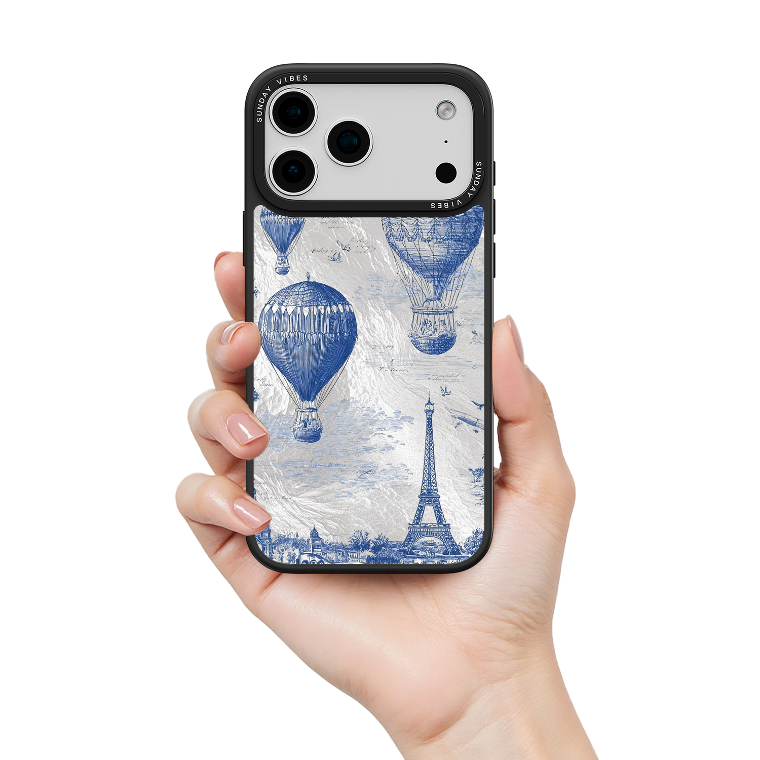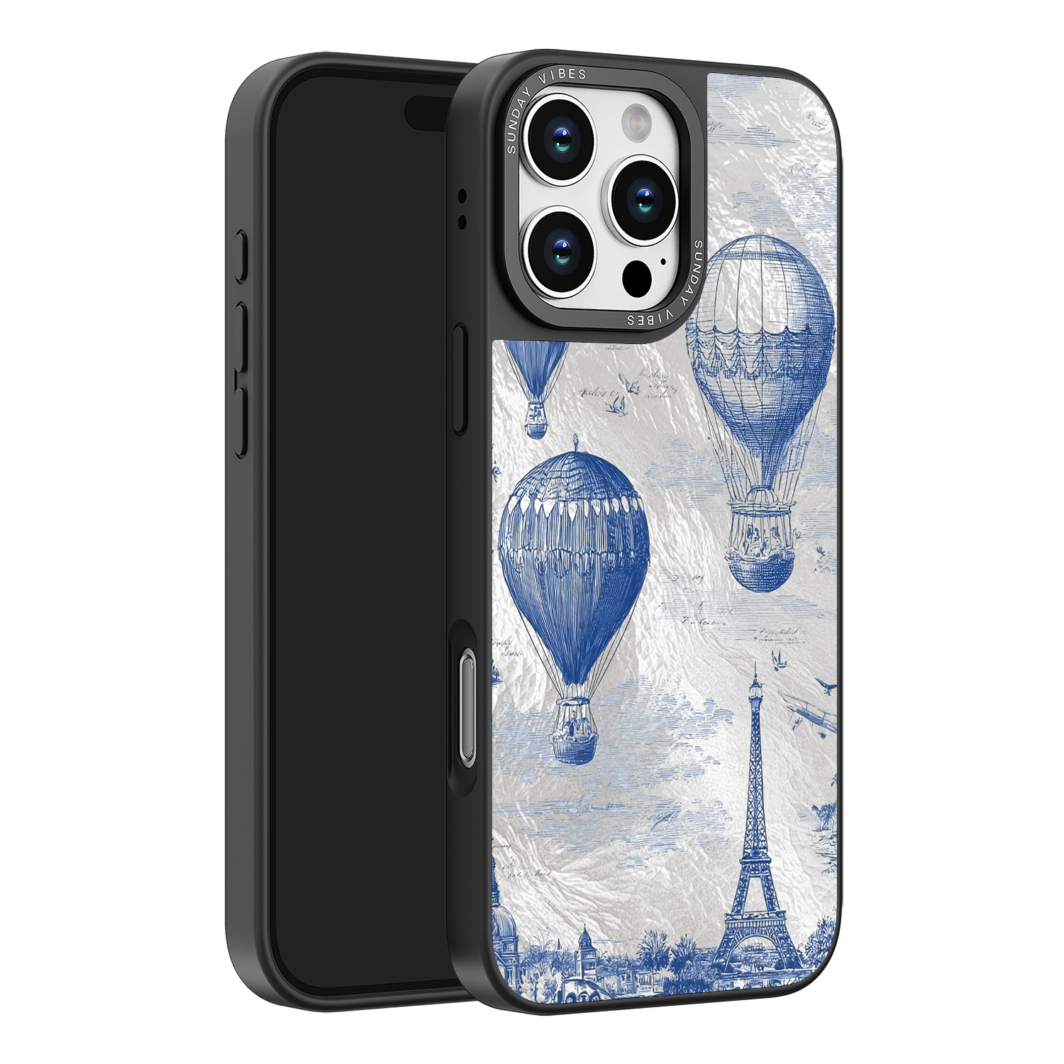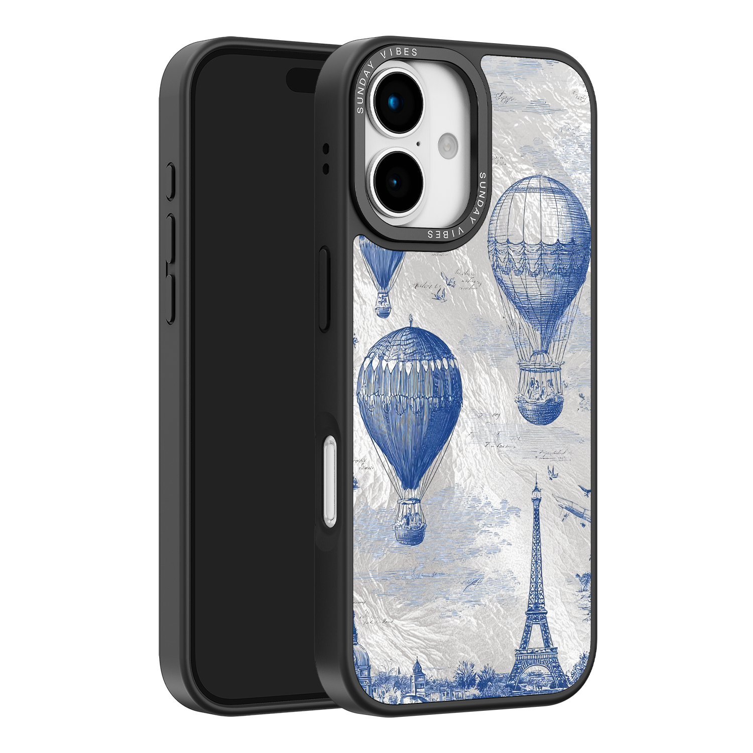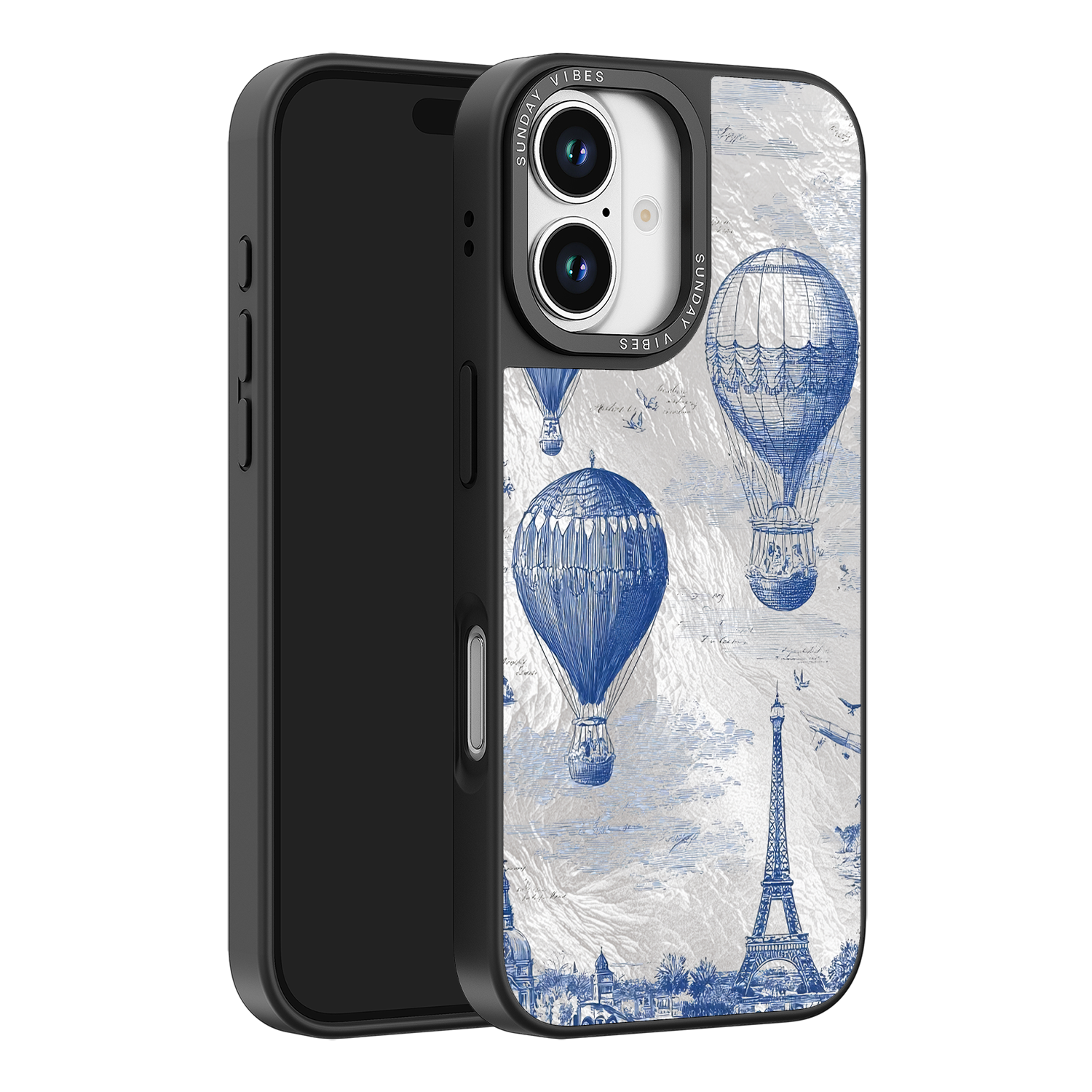 Step into the timeless romance of travel with the Paris Dreams iPhone Case. This exquisite design showcases a detailed blue toile print of hot air balloons drifting above the Parisian skyline, instantly transporting you to the City of Light. The stunning imagery is set against a dramatically textured, silver holographic background that shimmers and shifts, perfectly blending old-world elegance with a contemporary metallic aesthetic. The case's structural integrity is delivered via a premium 3-layer back panel: featuring a base holographic layer with texture, a middle ultra HD gallery print layer, and a velvet smooth anti-scratch and anti-fingerprint top coating.