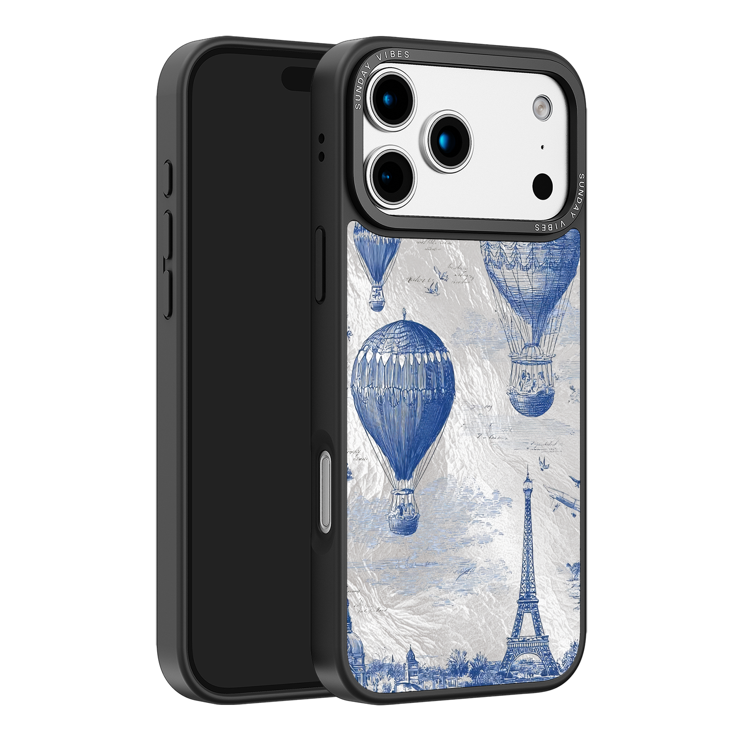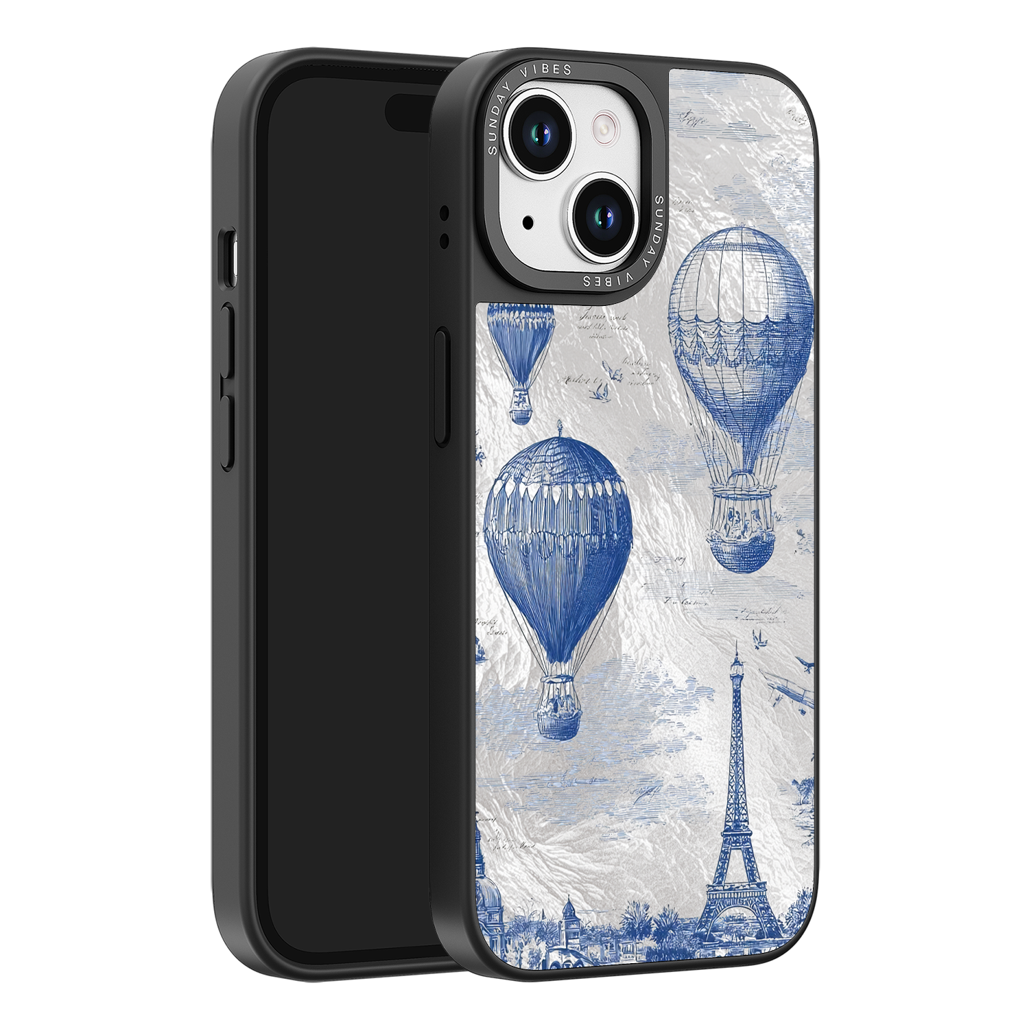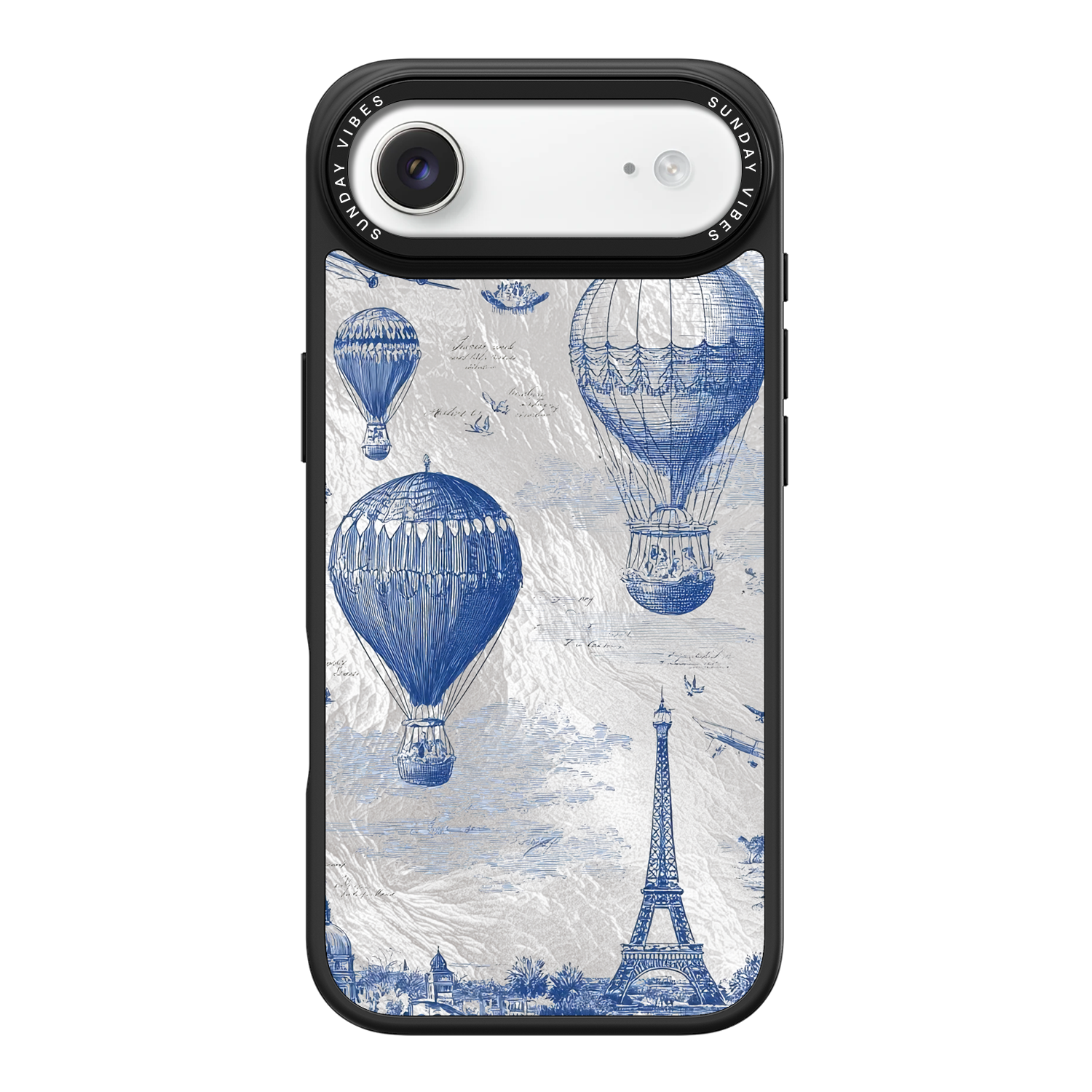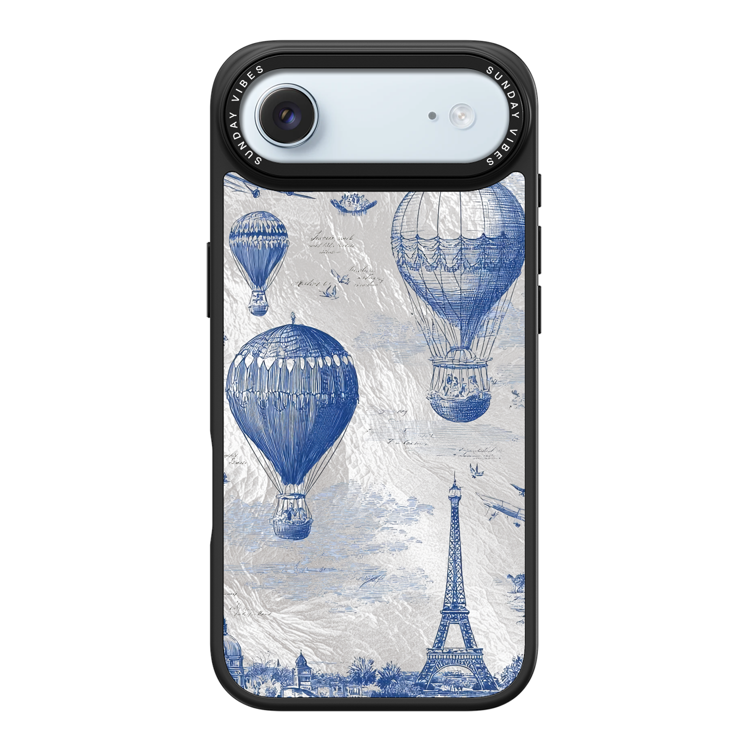 Step into the timeless romance of travel with the Paris Dreams iPhone Case. This exquisite design showcases a detailed blue toile print of hot air balloons drifting above the Parisian skyline, instantly transporting you to the City of Light. The stunning imagery is set against a dramatically textured, silver holographic background that shimmers and shifts, perfectly blending old-world elegance with a contemporary metallic aesthetic. The case's structural integrity is delivered via a premium 3-layer back panel: featuring a base holographic layer with texture, a middle ultra HD gallery print layer, and a velvet smooth anti-scratch and anti-fingerprint top coating.