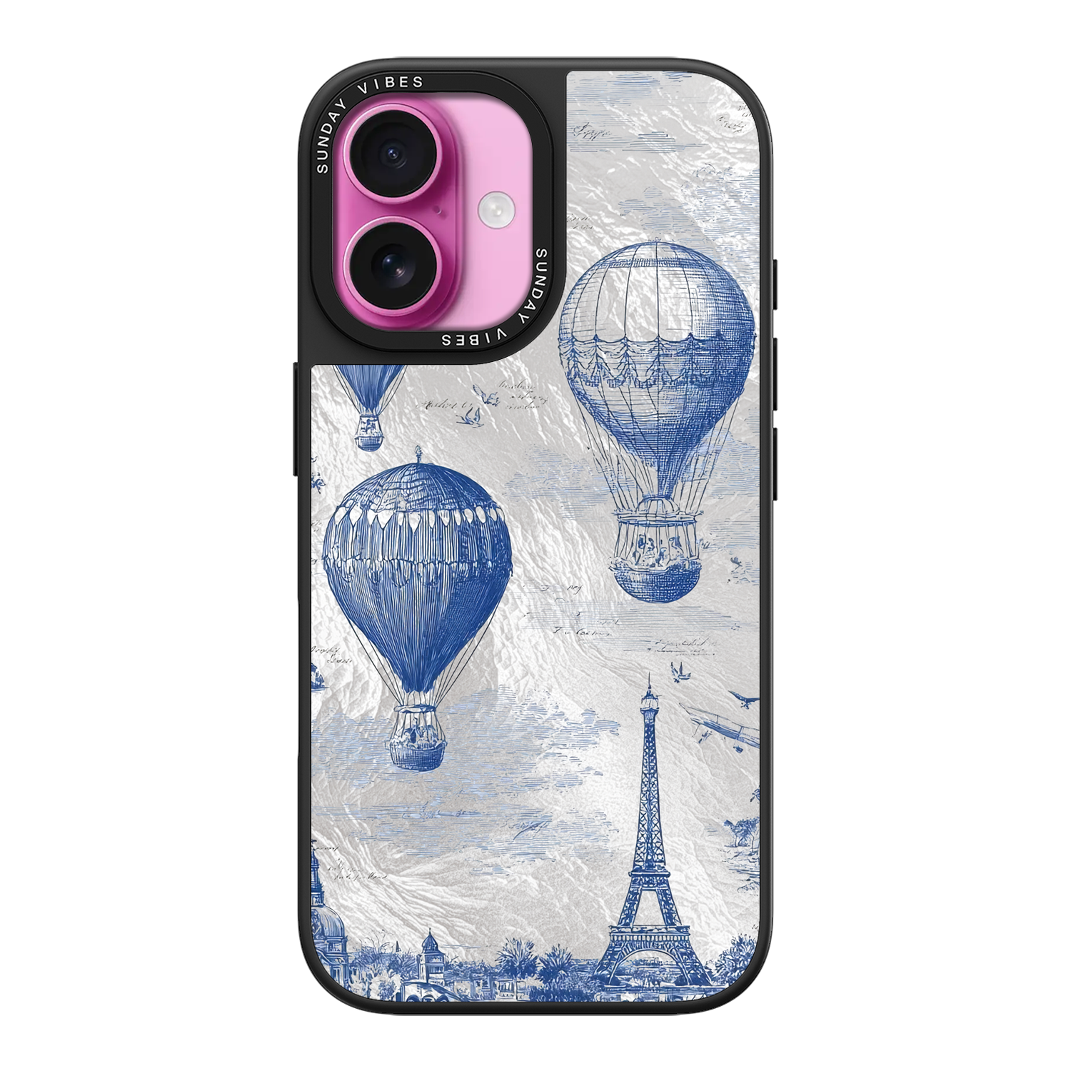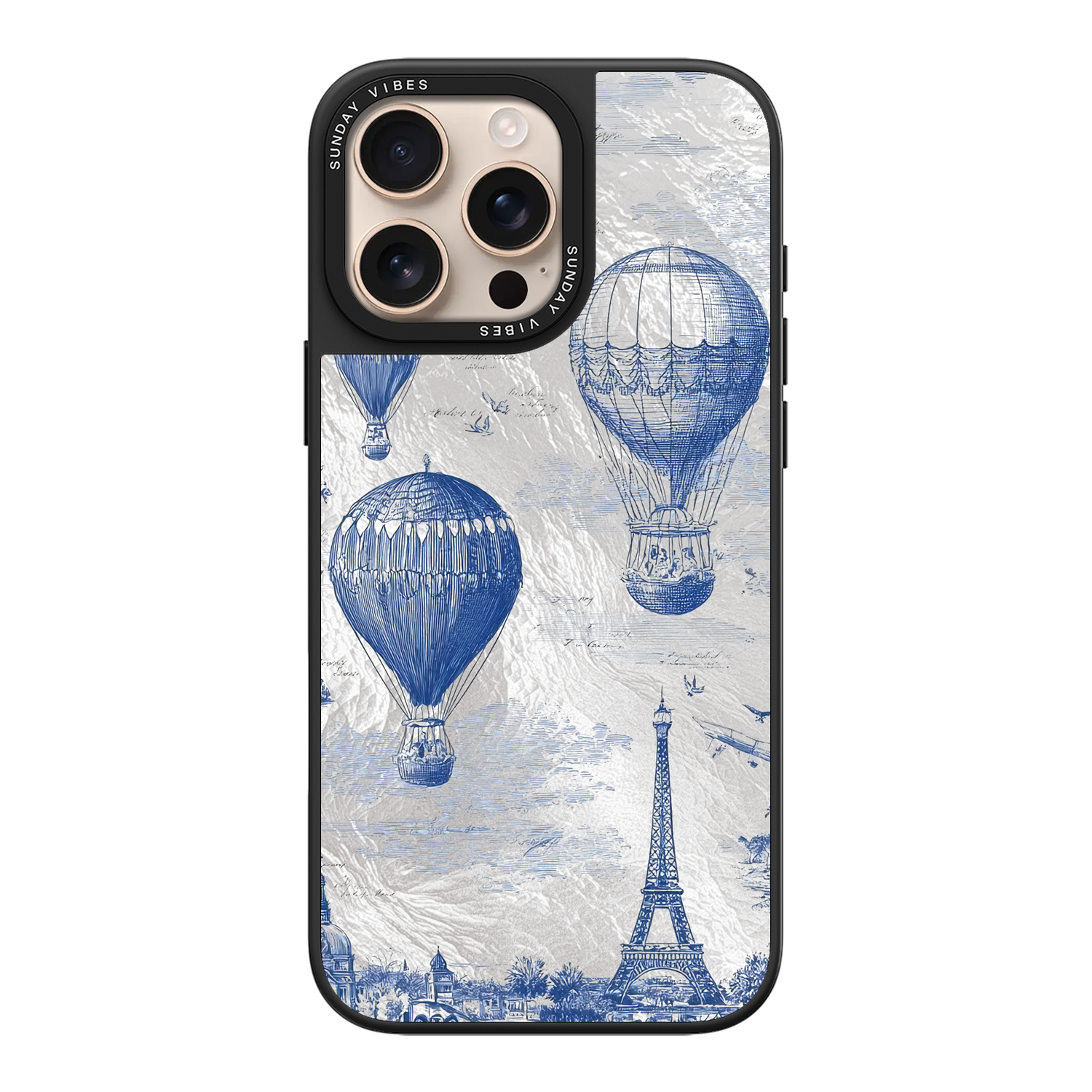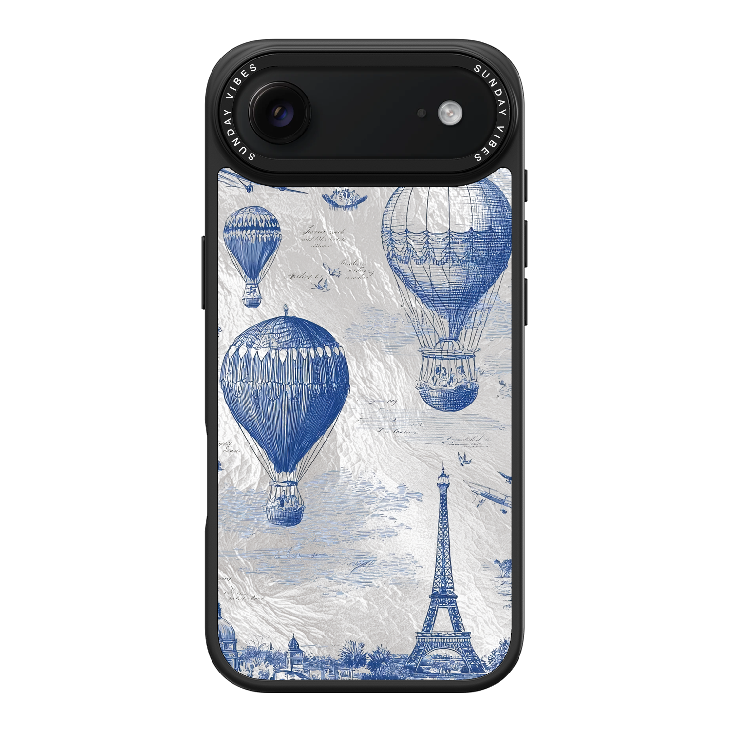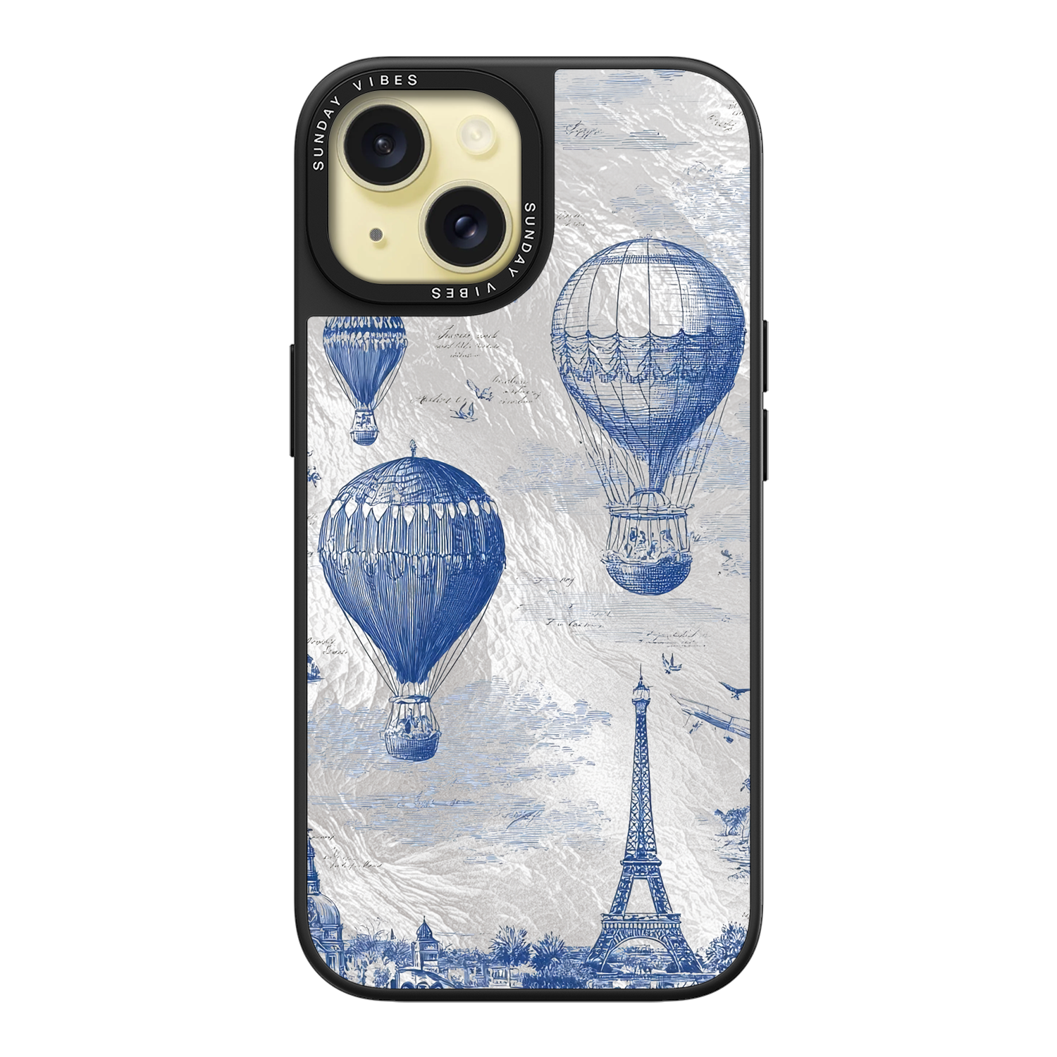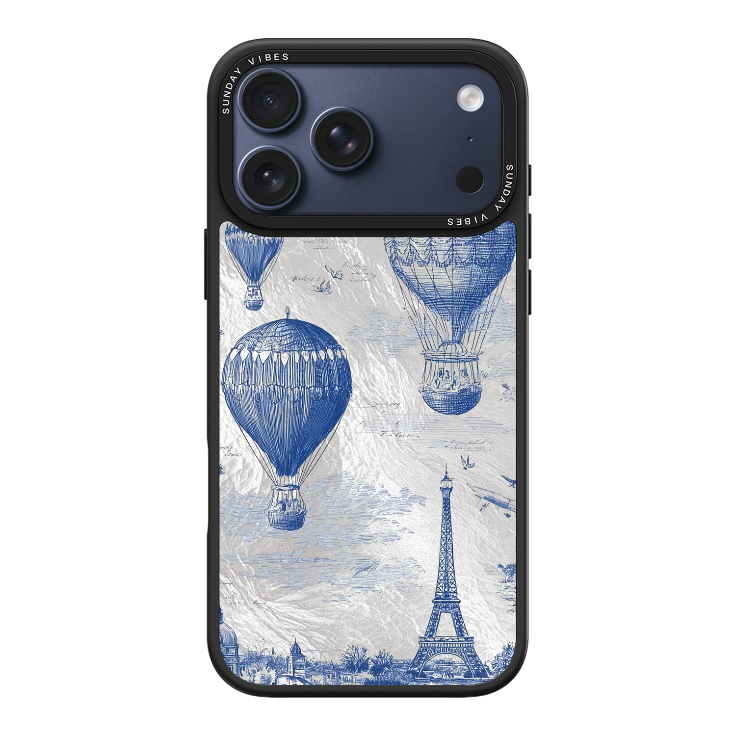 Step into the timeless romance of travel with the Paris Dreams iPhone Case. This exquisite design showcases a detailed blue toile print of hot air balloons drifting above the Parisian skyline, instantly transporting you to the City of Light. The stunning imagery is set against a dramatically textured, silver holographic background that shimmers and shifts, perfectly blending old-world elegance with a contemporary metallic aesthetic. The case's structural integrity is delivered via a premium 3-layer back panel: featuring a base holographic layer with texture, a middle ultra HD gallery print layer, and a velvet smooth anti-scratch and anti-fingerprint top coating.