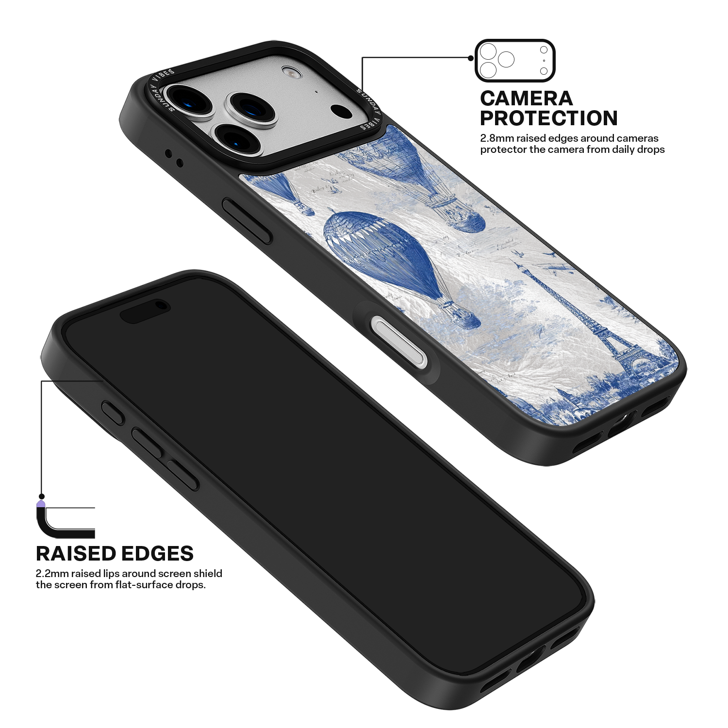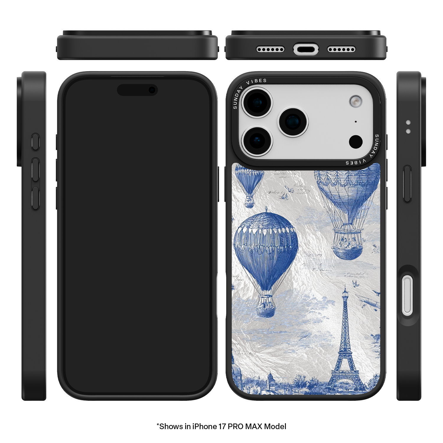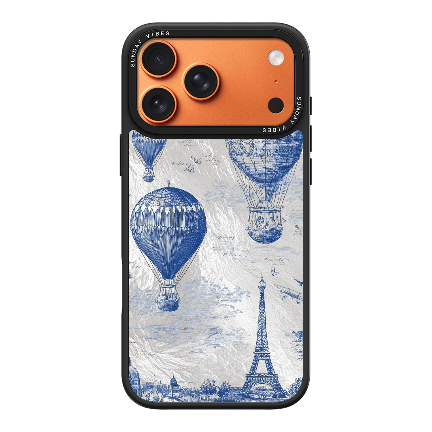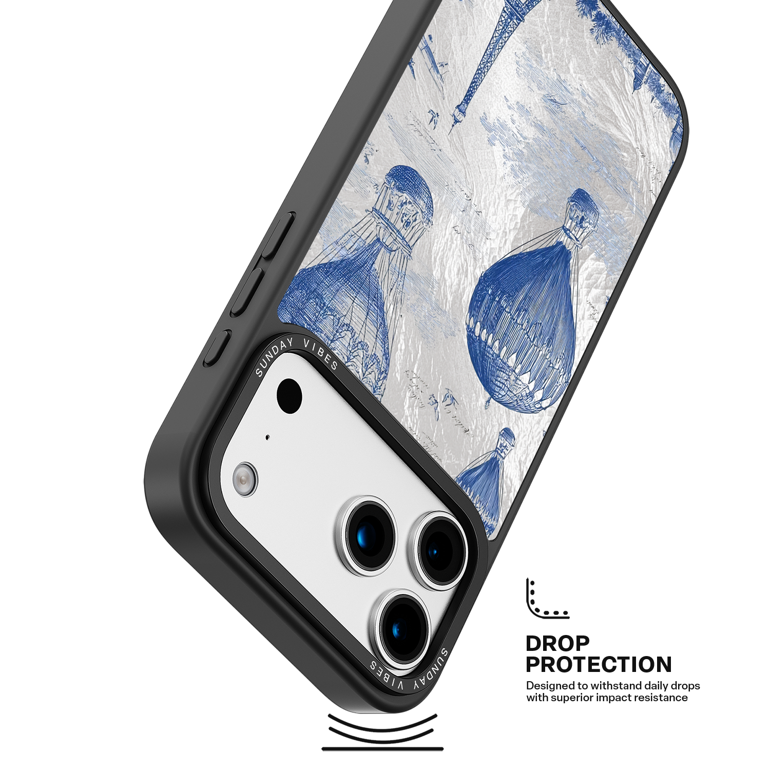 Step into the timeless romance of travel with the Paris Dreams iPhone Case. This exquisite design showcases a detailed blue toile print of hot air balloons drifting above the Parisian skyline, instantly transporting you to the City of Light. The stunning imagery is set against a dramatically textured, silver holographic background that shimmers and shifts, perfectly blending old-world elegance with a contemporary metallic aesthetic. The case's structural integrity is delivered via a premium 3-layer back panel: featuring a base holographic layer with texture, a middle ultra HD gallery print layer, and a velvet smooth anti-scratch and anti-fingerprint top coating.