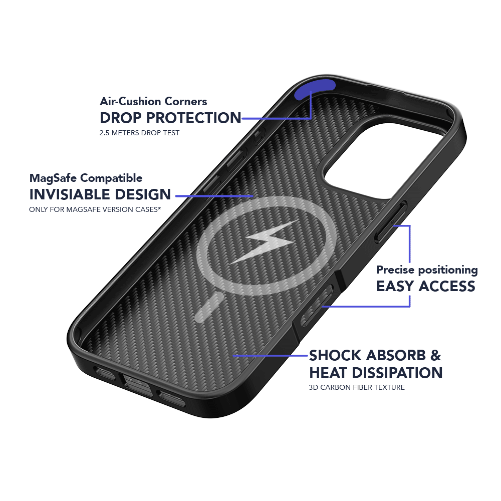 Featuring Air-Cushion corners that absorb impact from accidental drops, this case combines rugged durability with sleek functionality. The tough back panel integrates hidden MagSafe capability (exclusive to our MagSafe Elite range), designed for seamless compatibility—no visible rings on the exterior or interior.