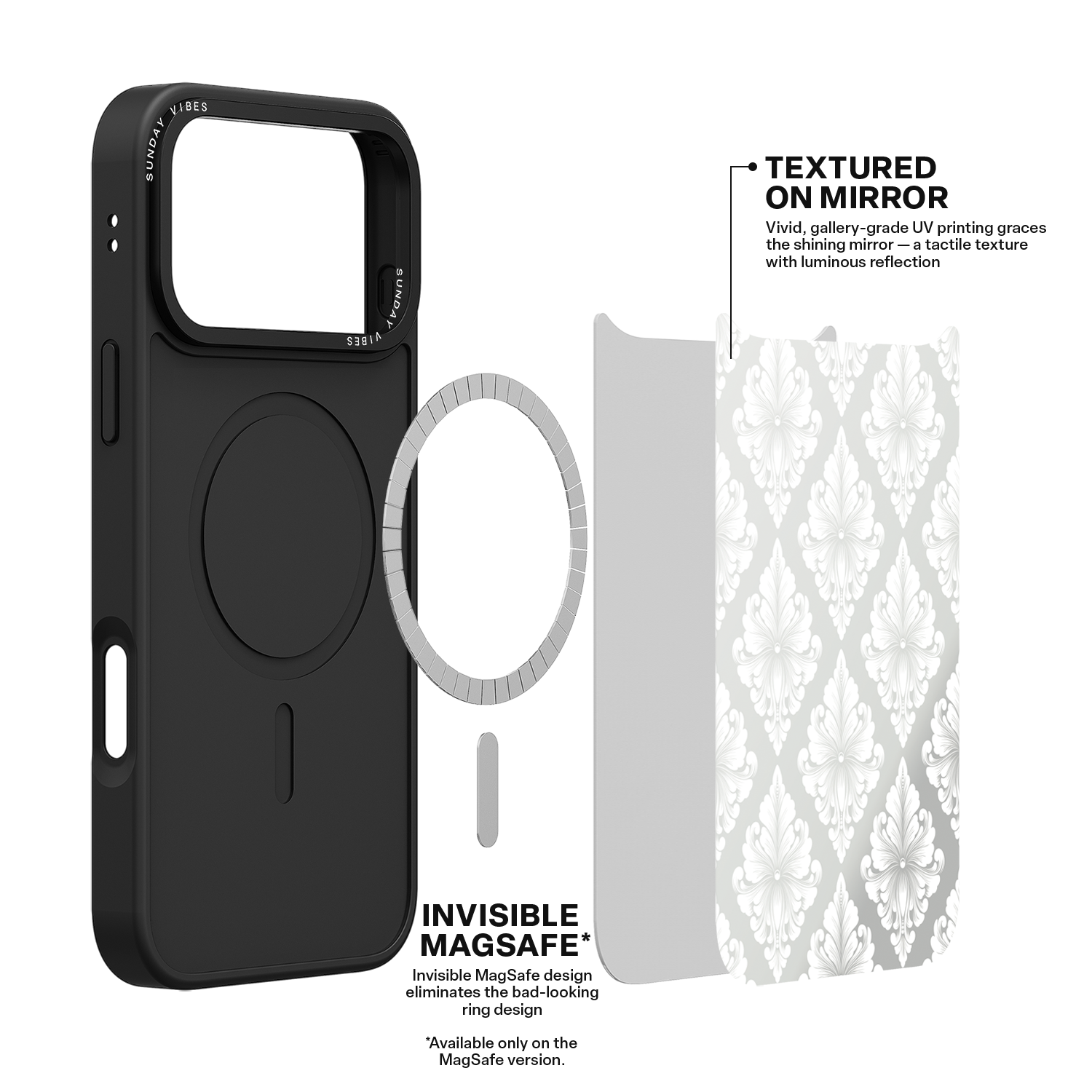 Featuring Air-Cushion corners that absorb impact from accidental drops, this case combines rugged durability with sleek functionality. The tough back panel integrates hidden MagSafe capability (exclusive to our MagSafe Elite range), designed for seamless compatibility—no visible rings on the exterior or interior.