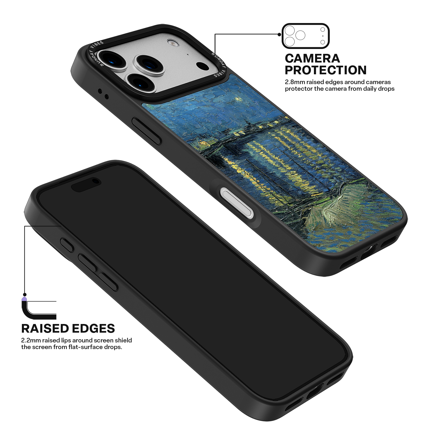 Engineered with a robust camera ring in a raised design, this protective structure shields your camera from impacts. The three-dimensional surround elevates the protruding lens by approximately 2.4mm, while the durable materials ensure reliable protection against accidental drops.