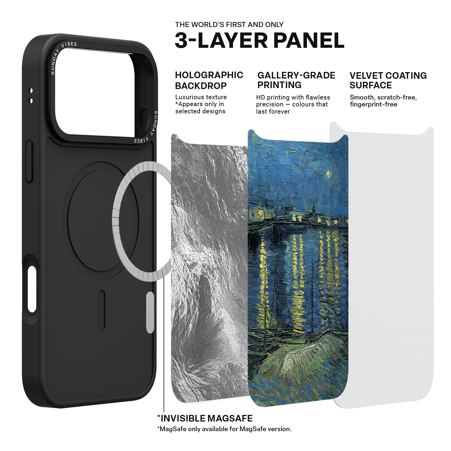 Our globally pioneering three‑layer back panel technology combines: Laser‑textured base layer – adds depth and dimensionality to the design (effects may vary depending on artwork). Ultra‑high‑definition gallery‑grade print layer – delivers vivid, lifelike colours and striking detail. Velvet skin‑feel protective coating – provides scratch resistance and fingerprint protection while offering a soft, refined touch.