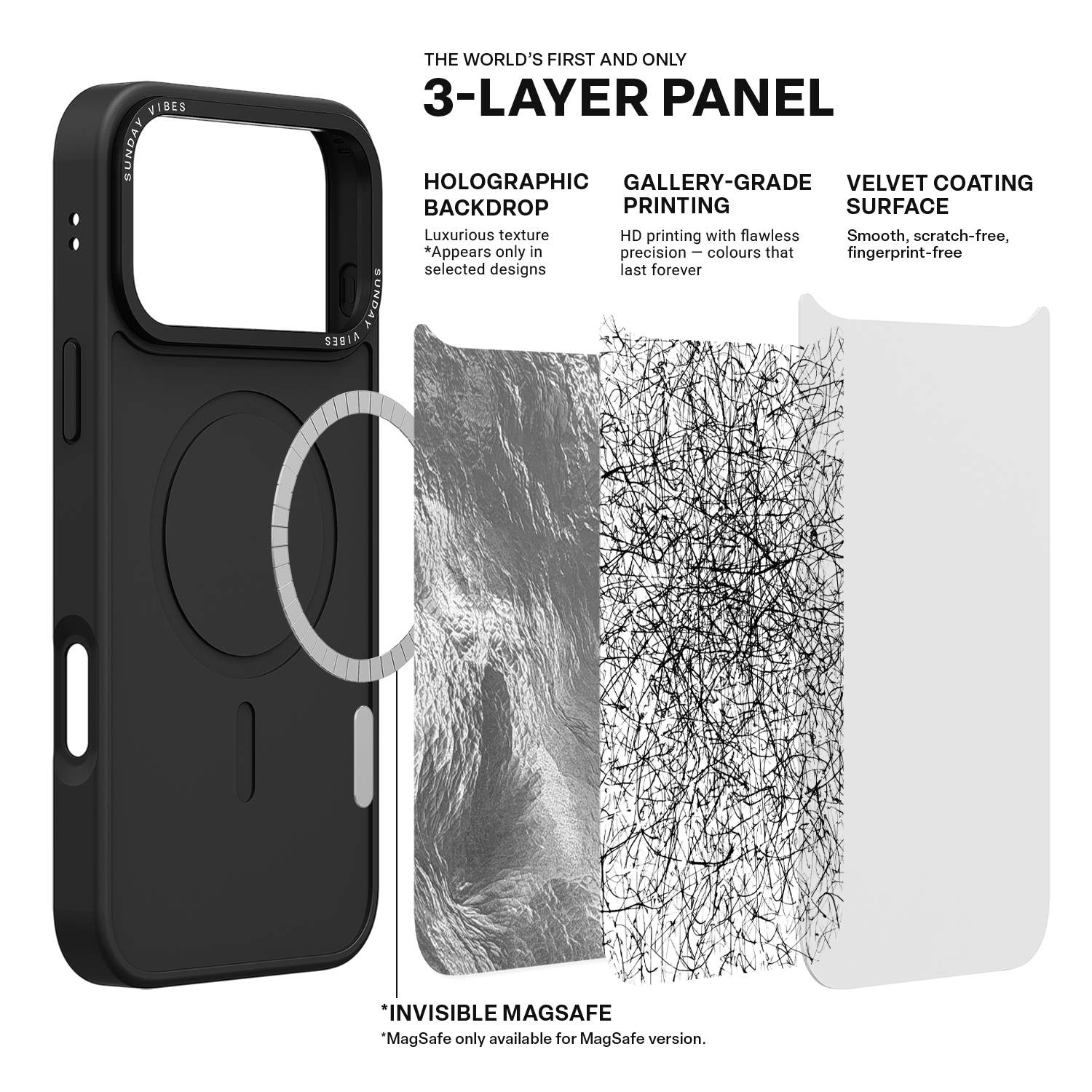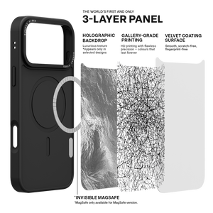 Our globally pioneering three‑layer back panel technology combines: Laser‑textured base layer – adds depth and dimensionality to the design (effects may vary depending on artwork). Ultra‑high‑definition gallery‑grade print layer – delivers vivid, lifelike colours and striking detail. Velvet skin‑feel protective coating – provides scratch resistance and fingerprint protection while offering a soft, refined touch.
